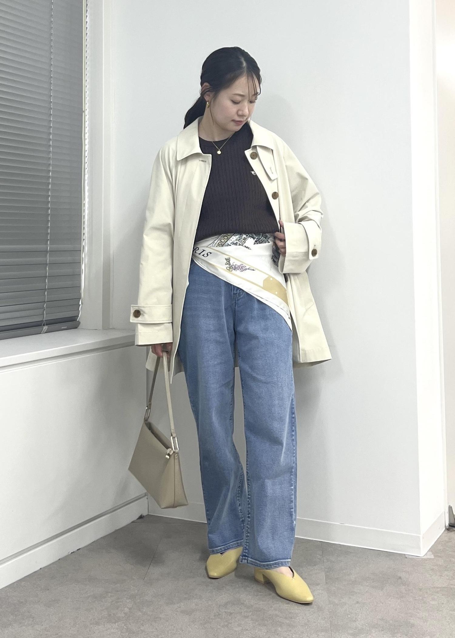 カラーパンプスやウエストにスカーフを巻いて、春らしくしたのがポイント!
