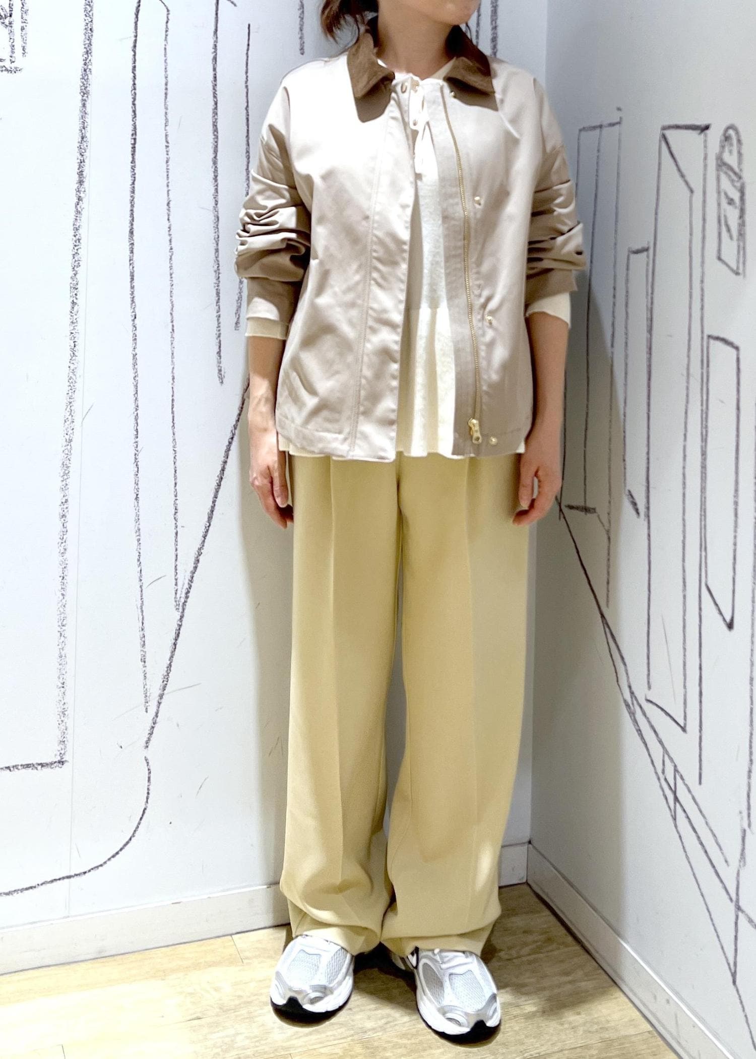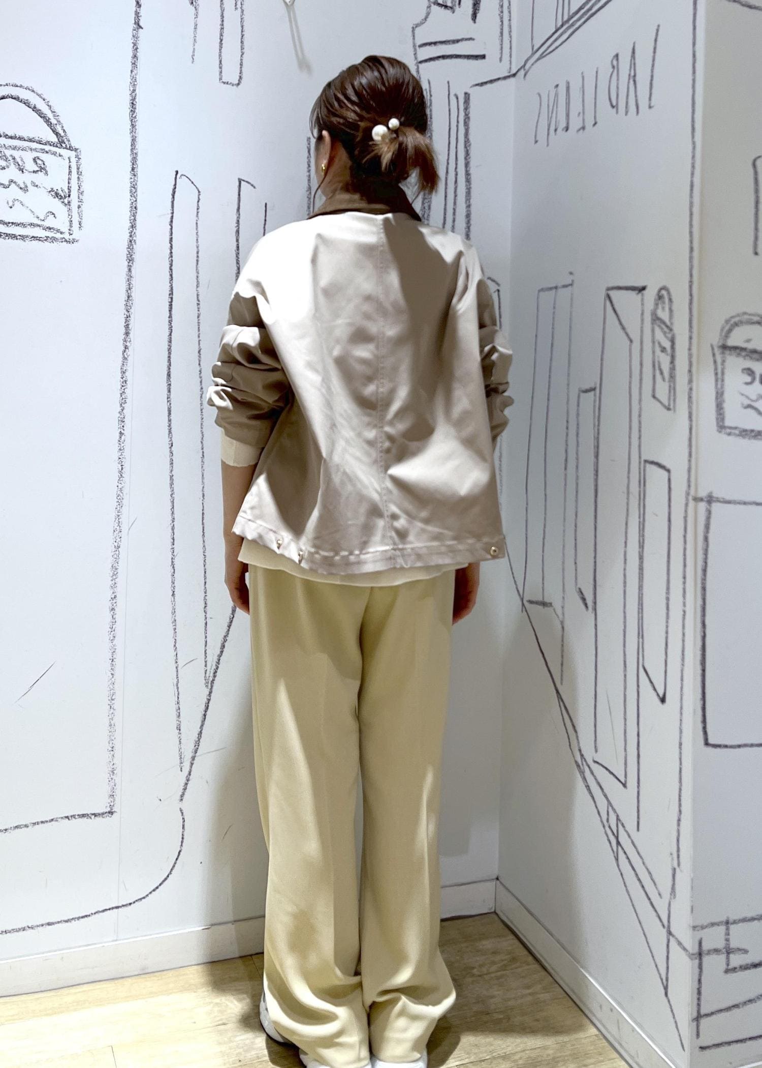 素材はコットンよりもほんのり光沢のある合繊ツイルで、程よいハリがありきれいめにも合わせやすい印象。季節の変わり目にさっと羽織りやすく、長いシーズン活躍してくれそうです。
