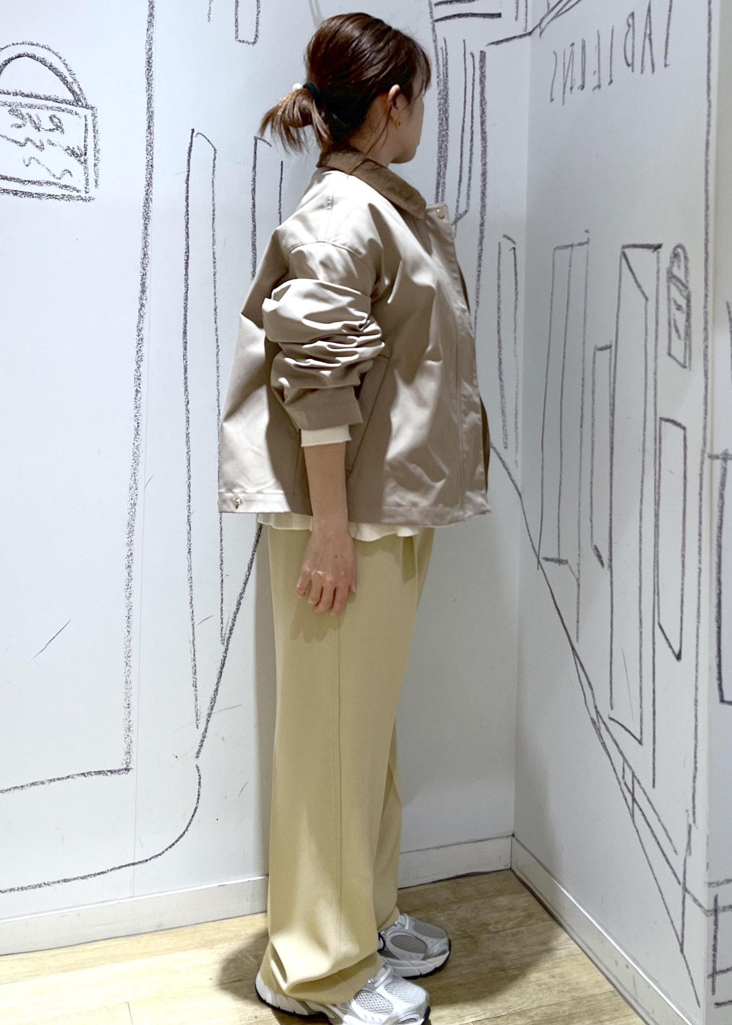 襟のコーデュロイがさりげないアクセントになっていて、シンプルなコーデでも雰囲気が出る一枚です。