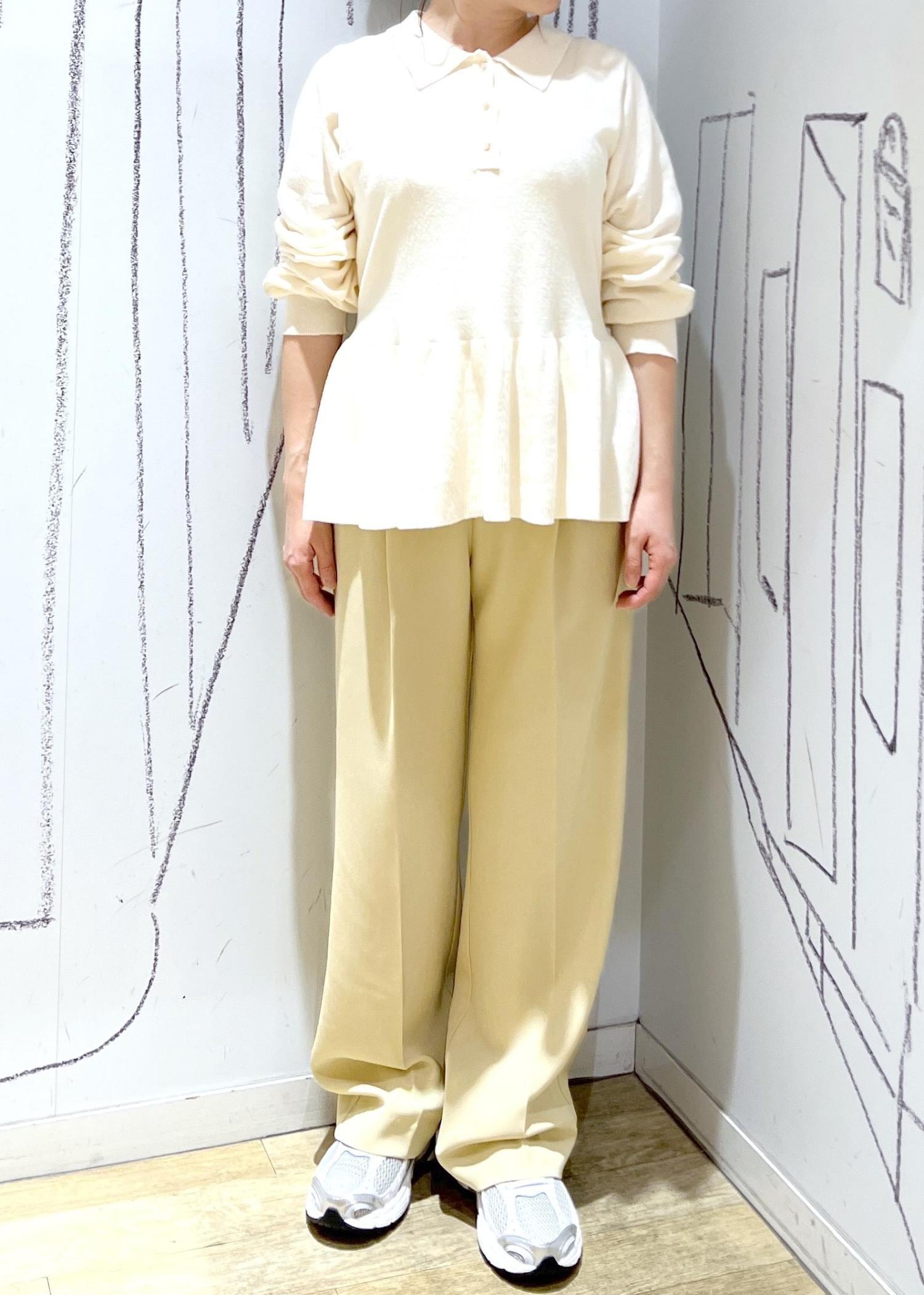 裾に向かってほんのり広がる微フレアシルエットで、脚のラインがすっきり見えるのもお気に入り。小柄でも重たく見えにくく、バランスよく穿けました。タック入りなので太ももまわりも気になりにくく、きれいめな雰囲気で穿けます。