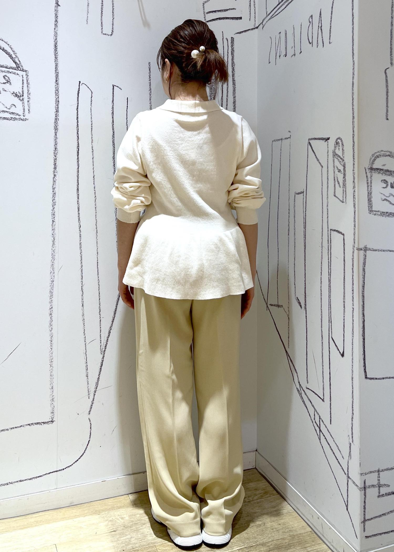 着丈がコンパクトなので、147cmの私でもバランスが取りやすく、ワイドパンツやスカートとも合わせやすいのが嬉しいポイント。裾と袖口のドットボタンでシルエットを少し変えられて、留め方によってふんわり丸みのあるシルエットになるのも可愛いです。