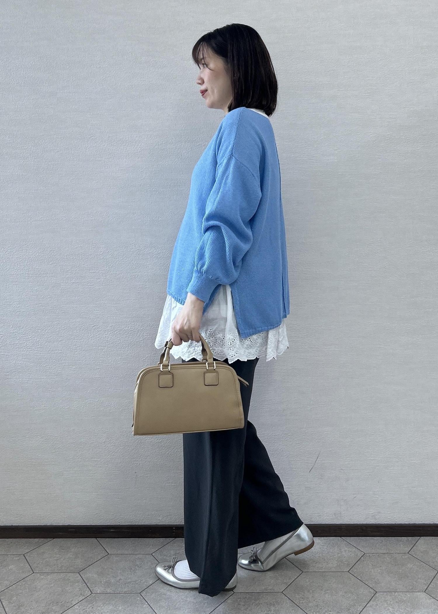 全体的にゆとりがあるので、スウェットなど厚手のトップスの上からも羽織ることが出来ます。 -
