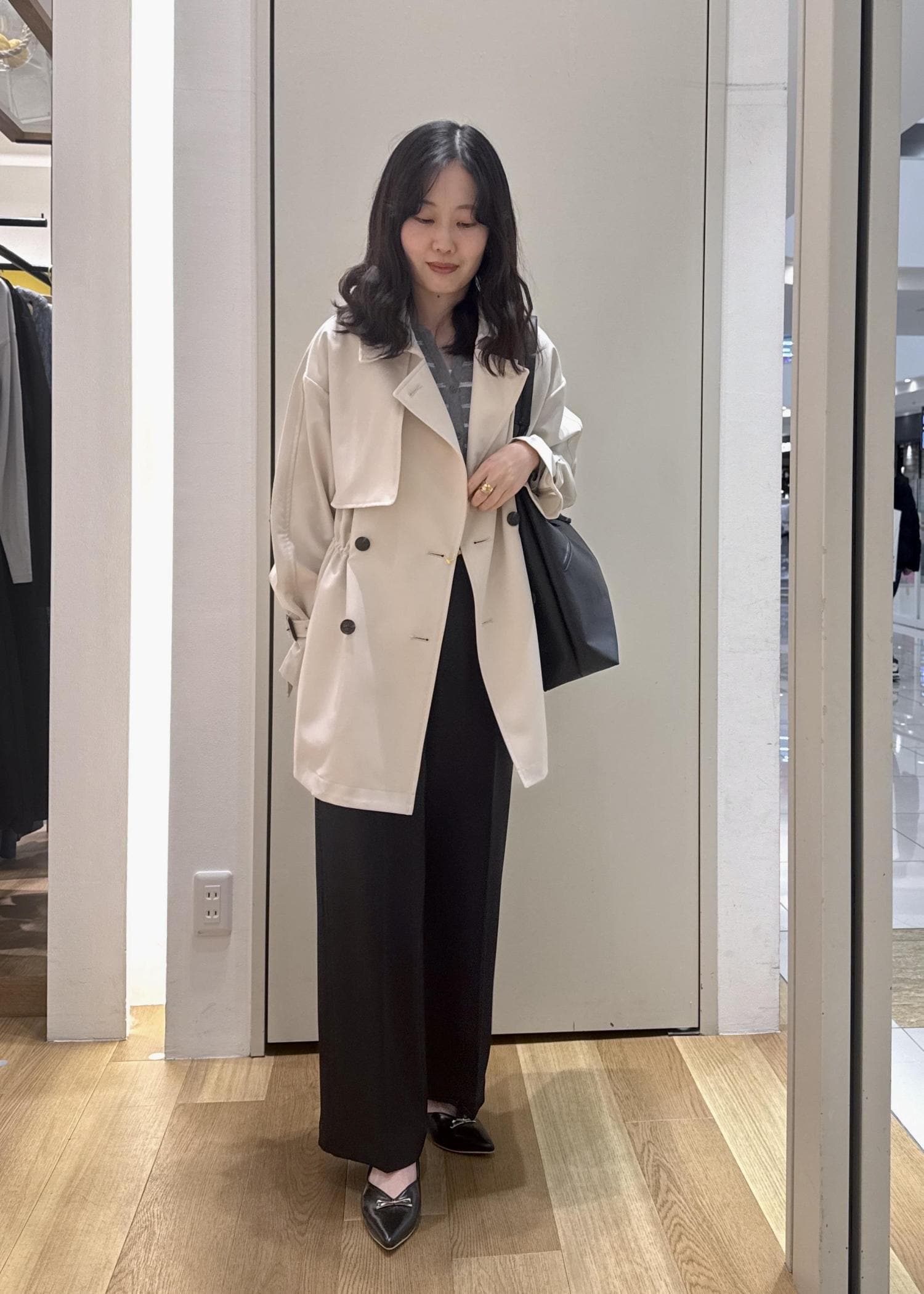 春らしいミドル丈トレンチコートを取り入れたちょっぴりカジュアルなきれいめコーデ。
