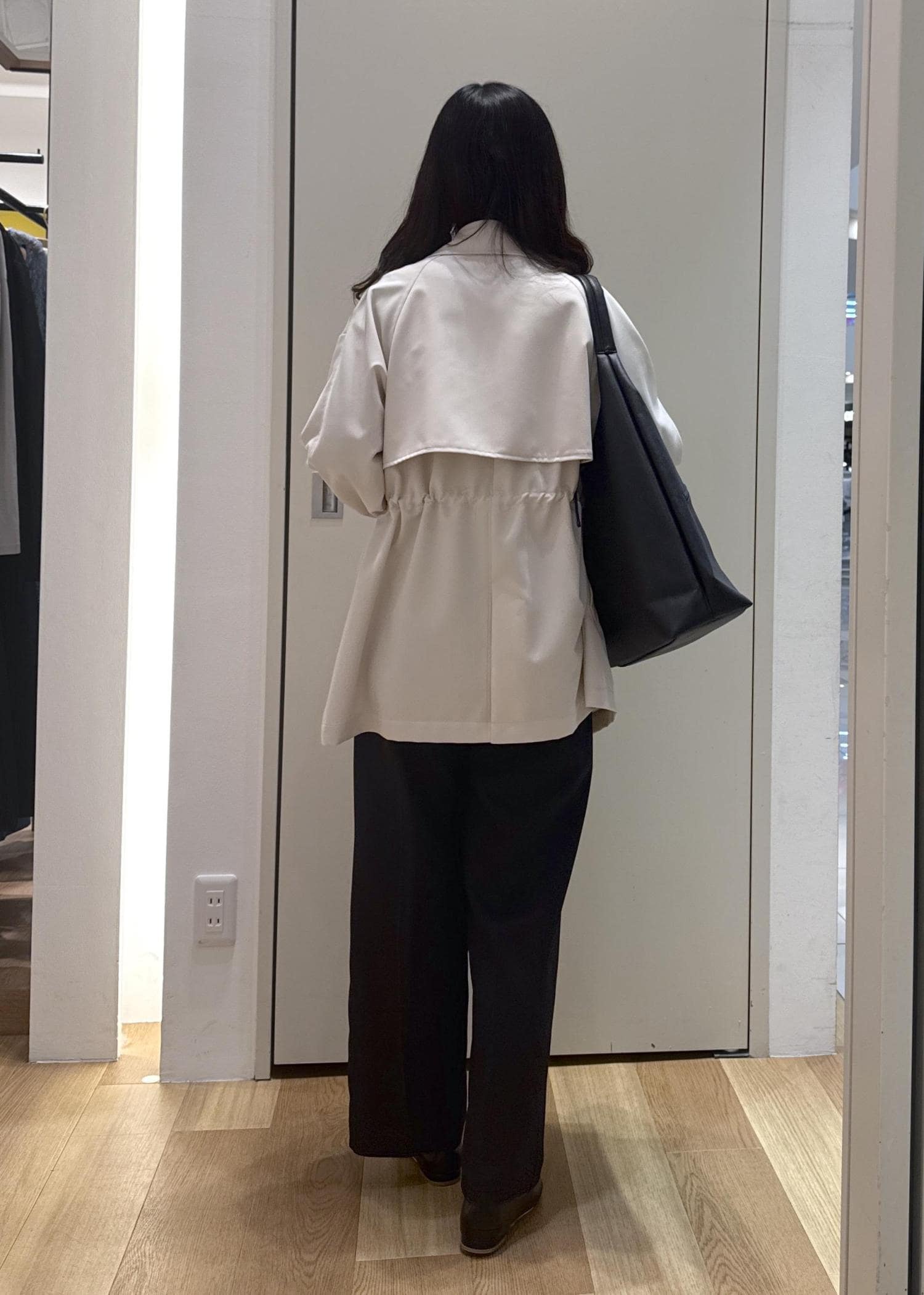 ゆとりのある着心地ですが、袖口はベルトでちょうせつでき、ウエスト部分にギャザーもあるので、着られている感じはなく着れます◎
