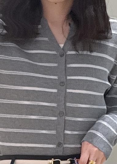 中にチラッと見えるグレーのボーダーカーディガンでちょっとカジュアルな印象に。