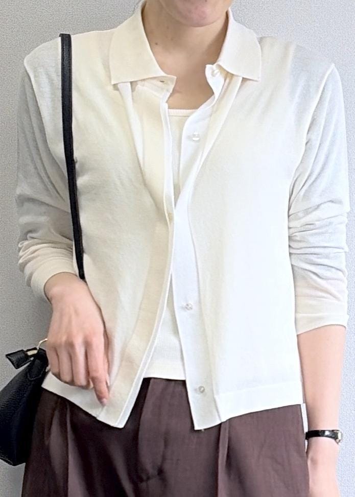 襟付きのニットとタンクトップがセットになったアンサンブルで着こなせるデザイン。シアー素材で軽やか、大人っぽい抜け感のあるスタイルが楽しめます♫