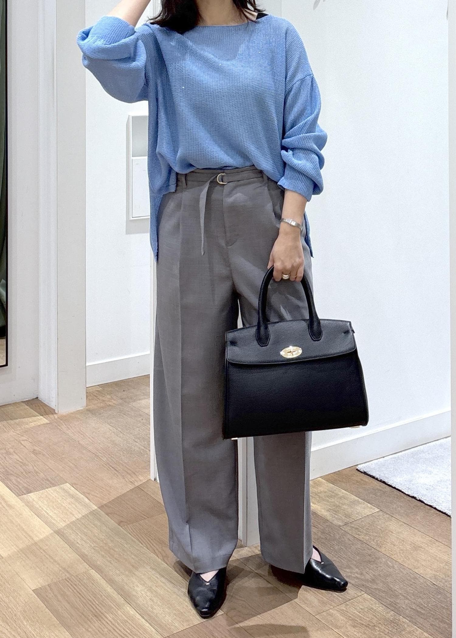 綺麗めなパンツ、バッグで合わせ、