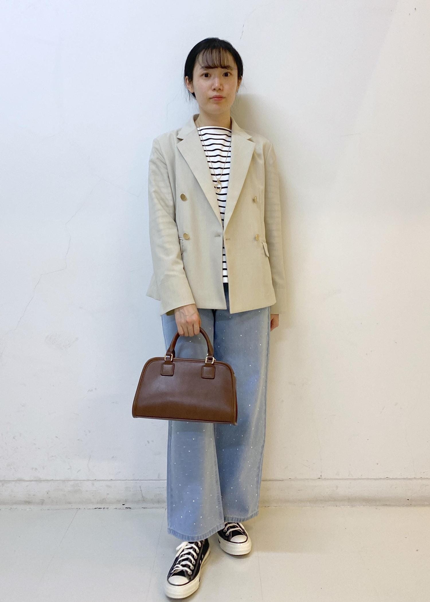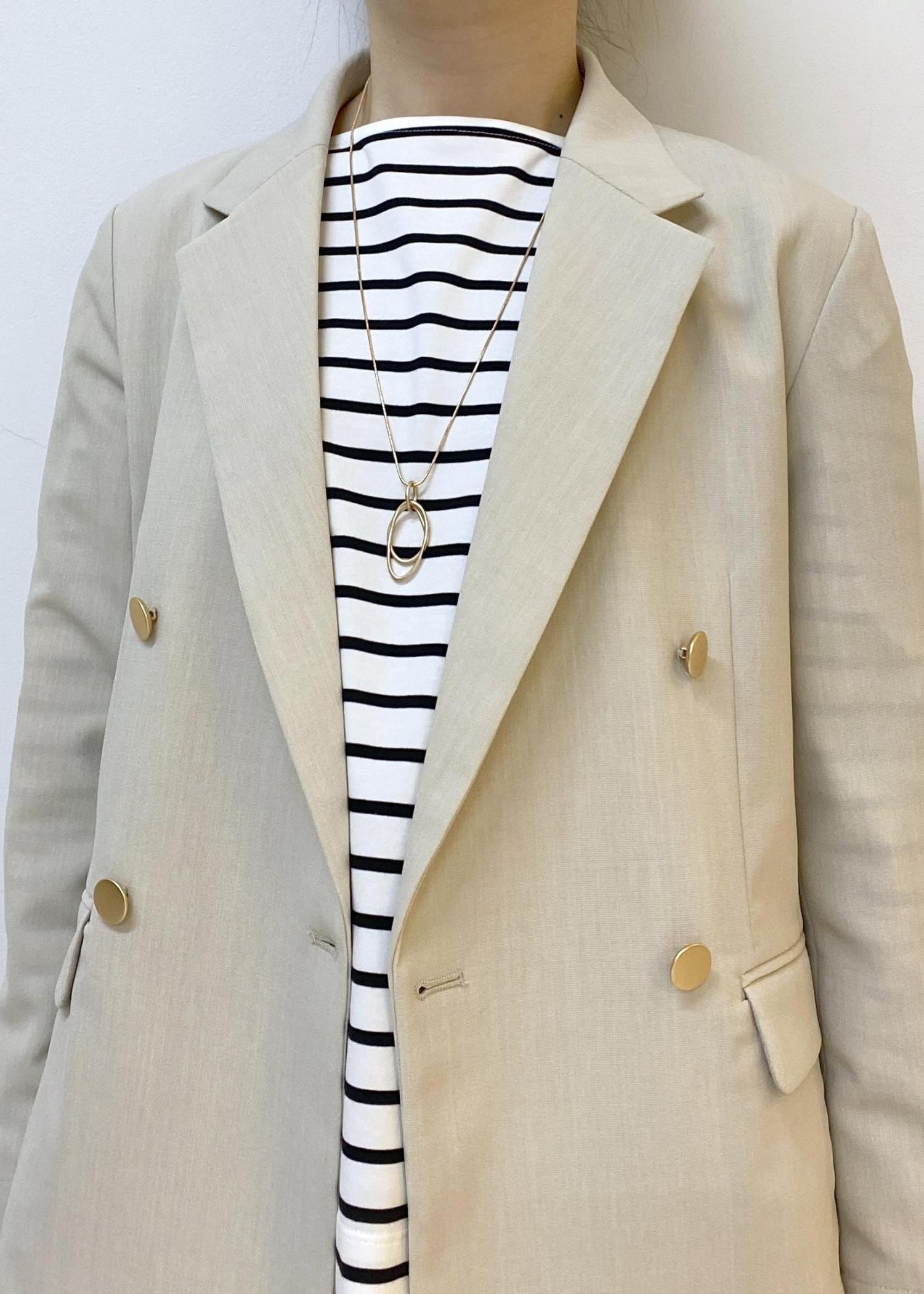 春らしいライトベージュのジャケットにボーダーのトップスをレイヤード。