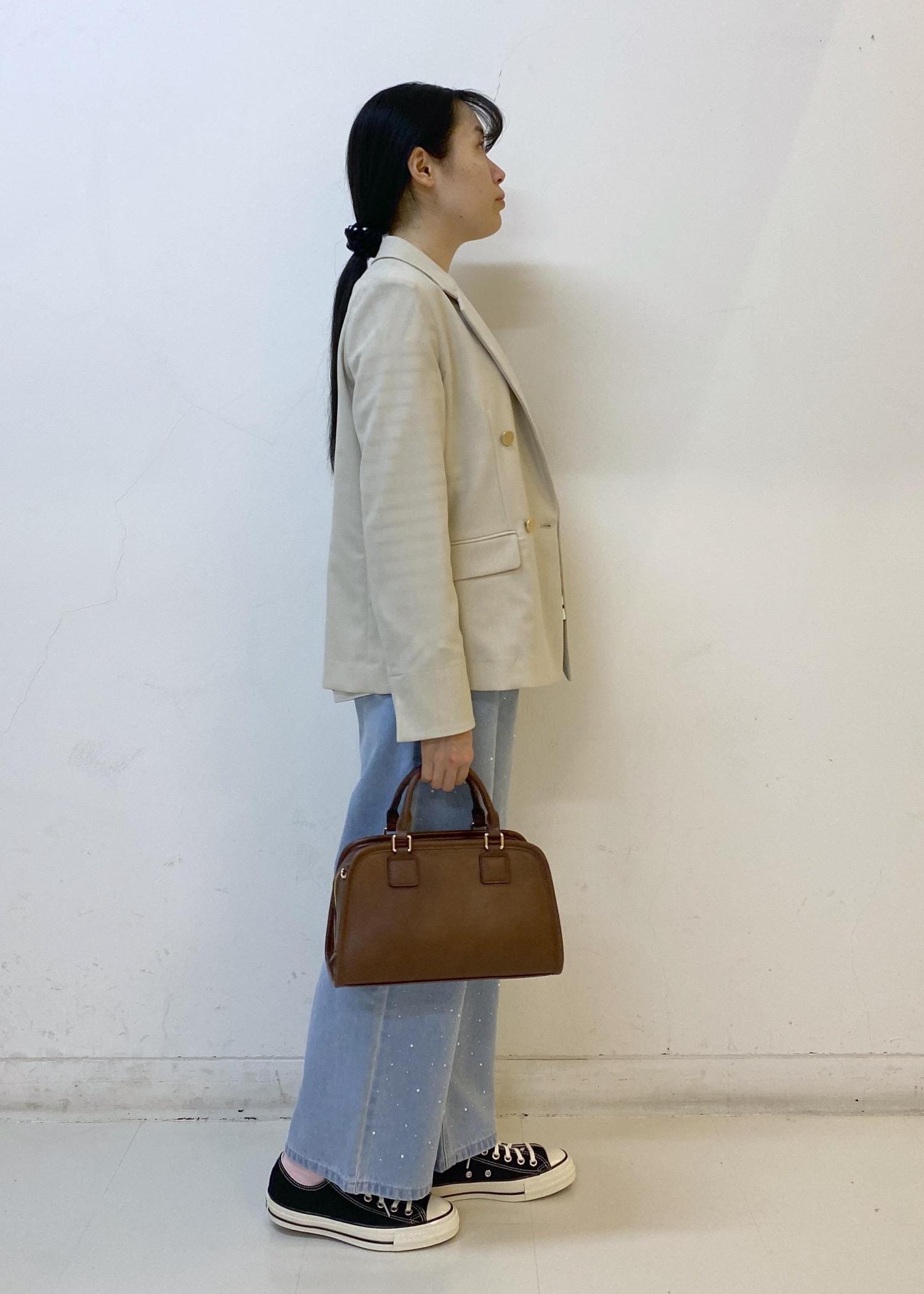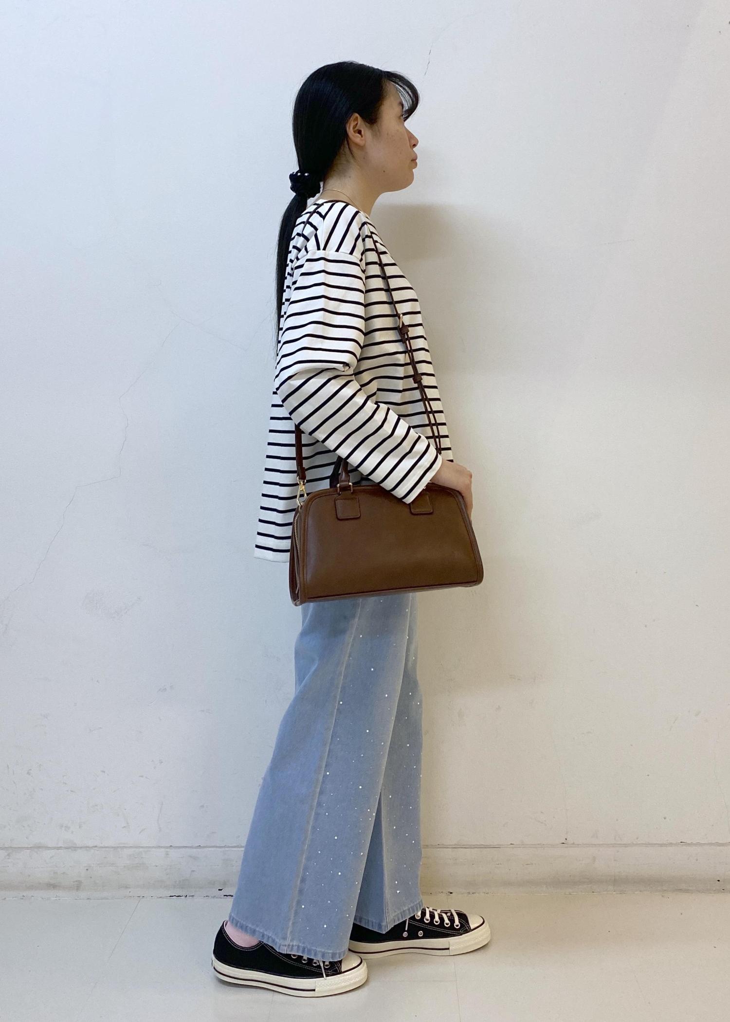 バッグは濃いめのブラウンカラーにすることで、全体を引き締めてくれます。