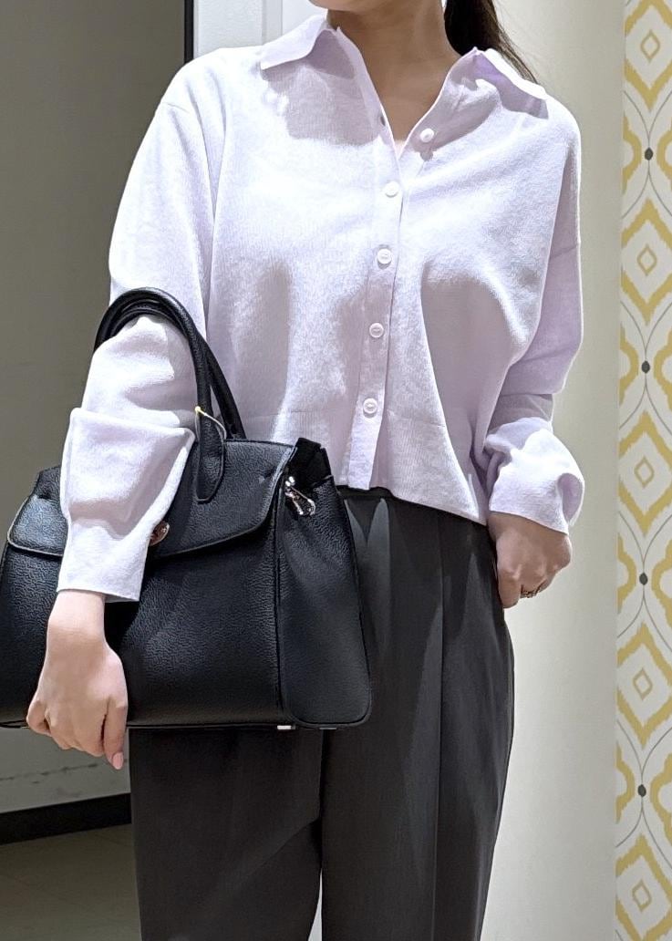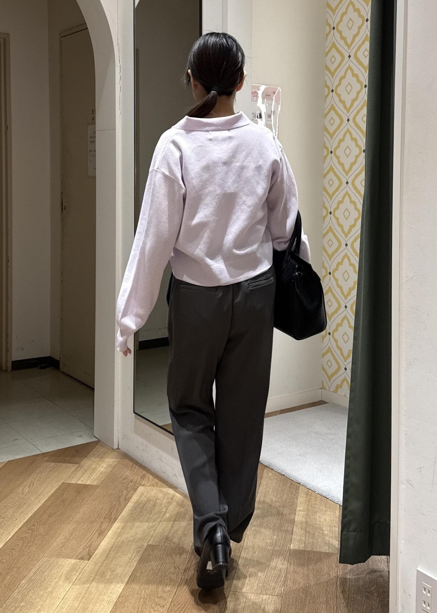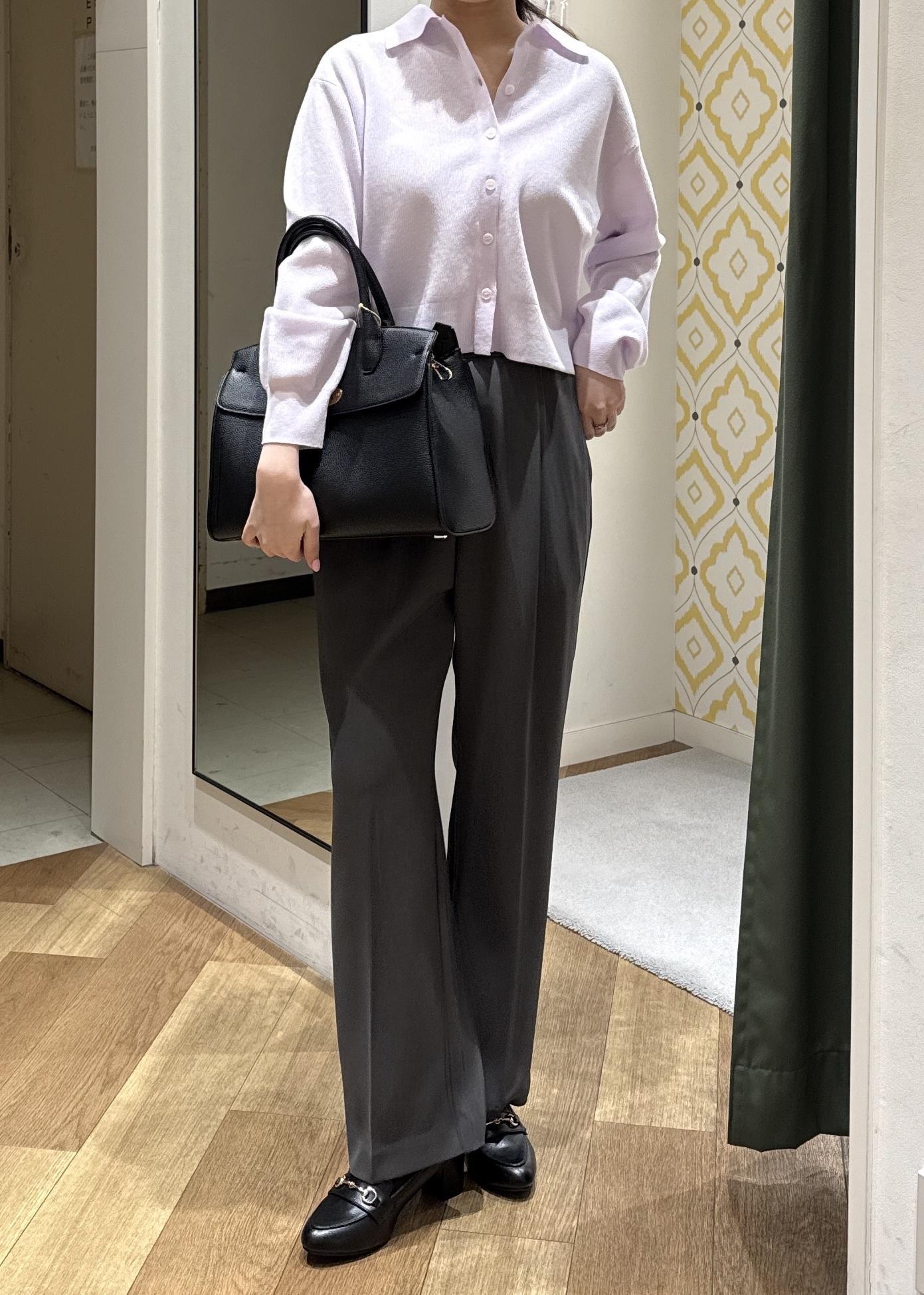 爽やかなラベンダー色のトップスを合わせた、春らしいお仕事コーデです。