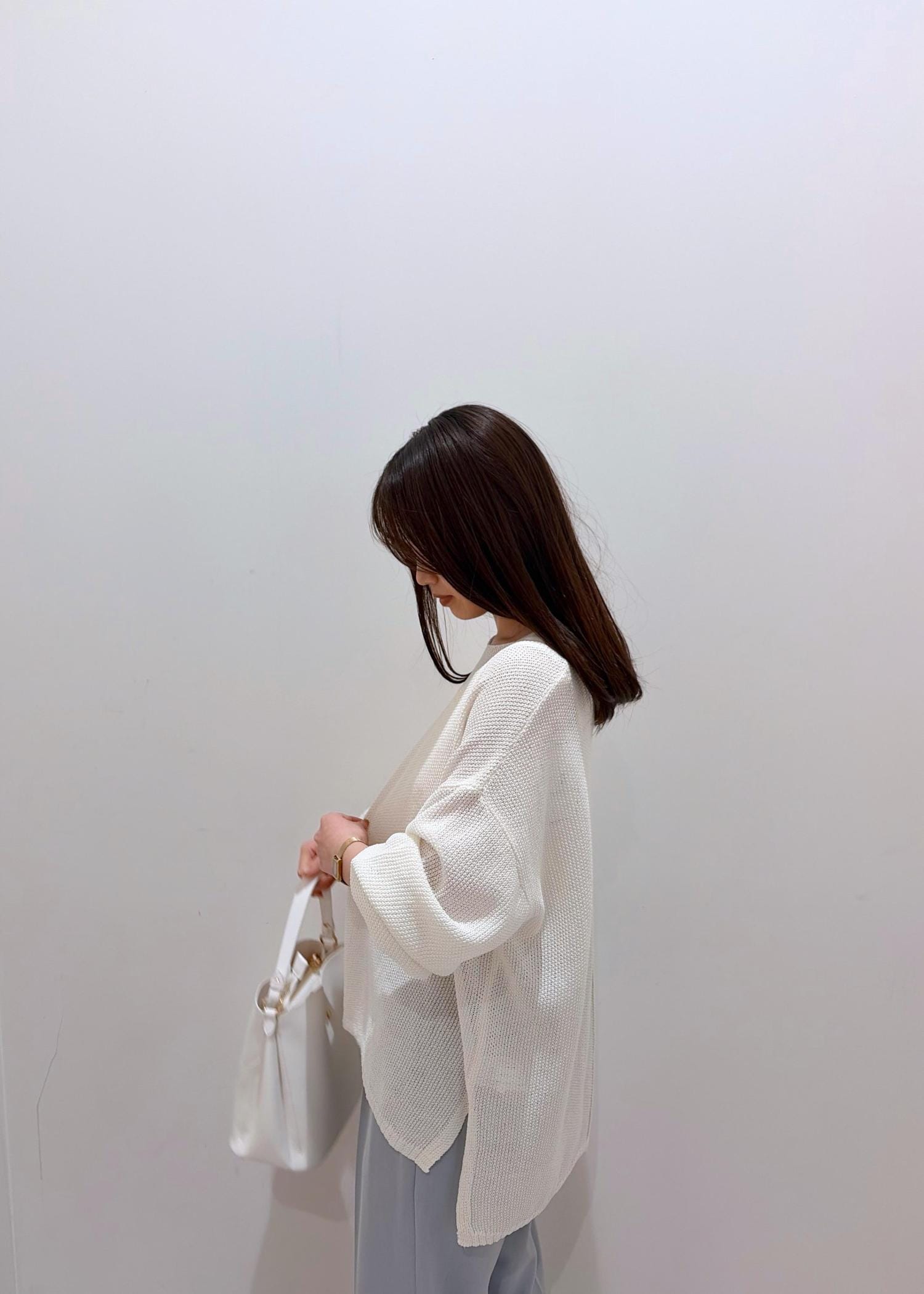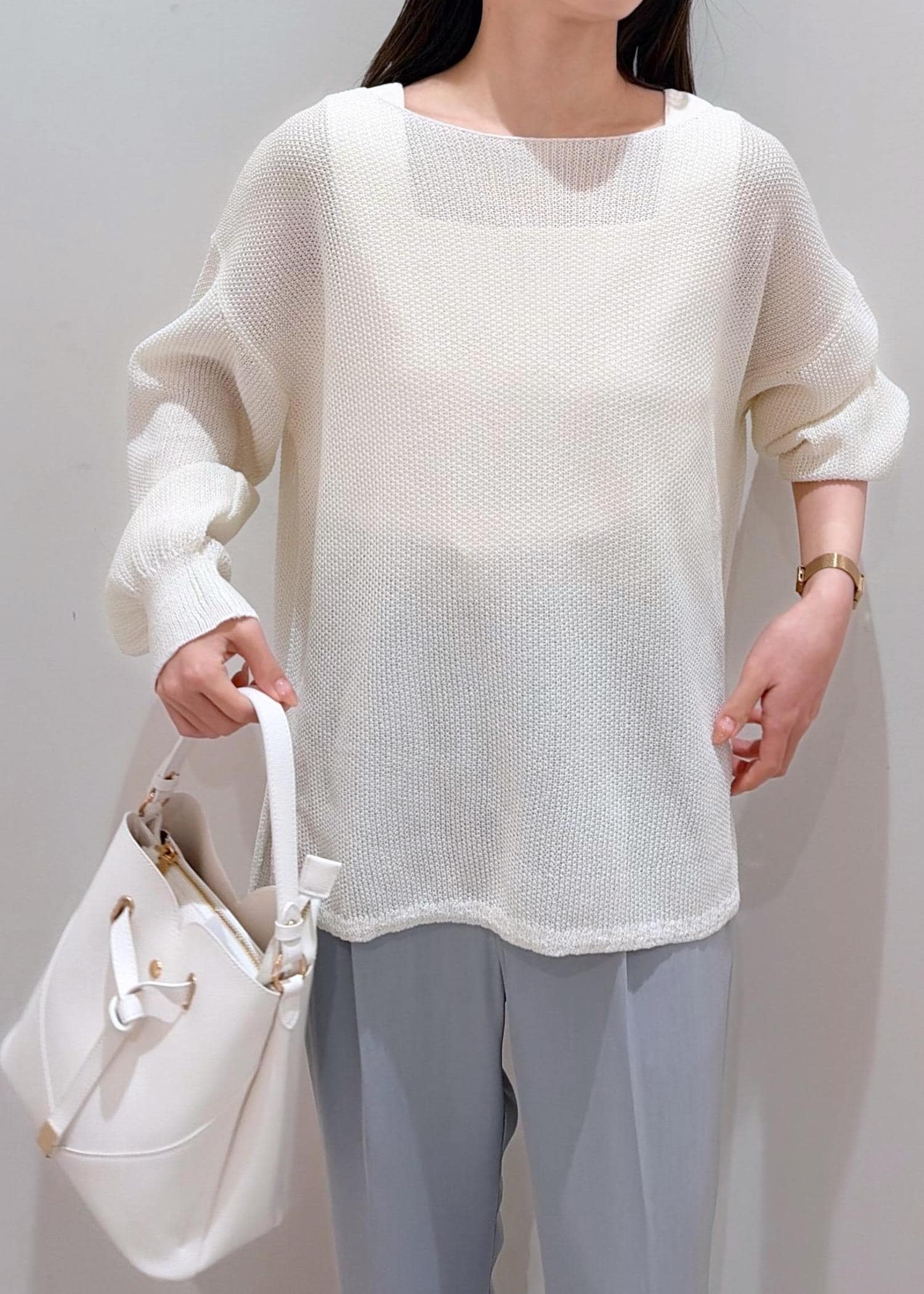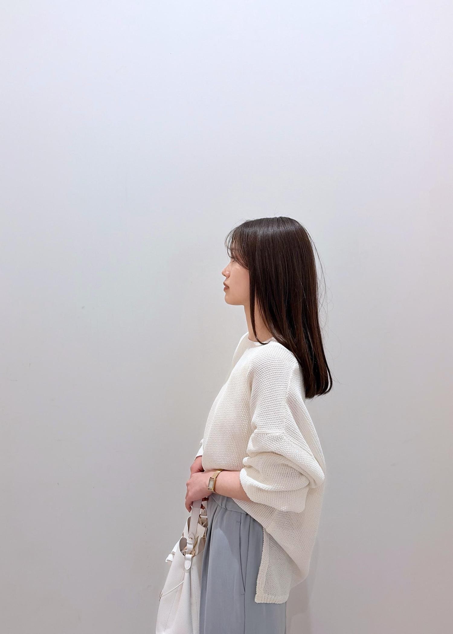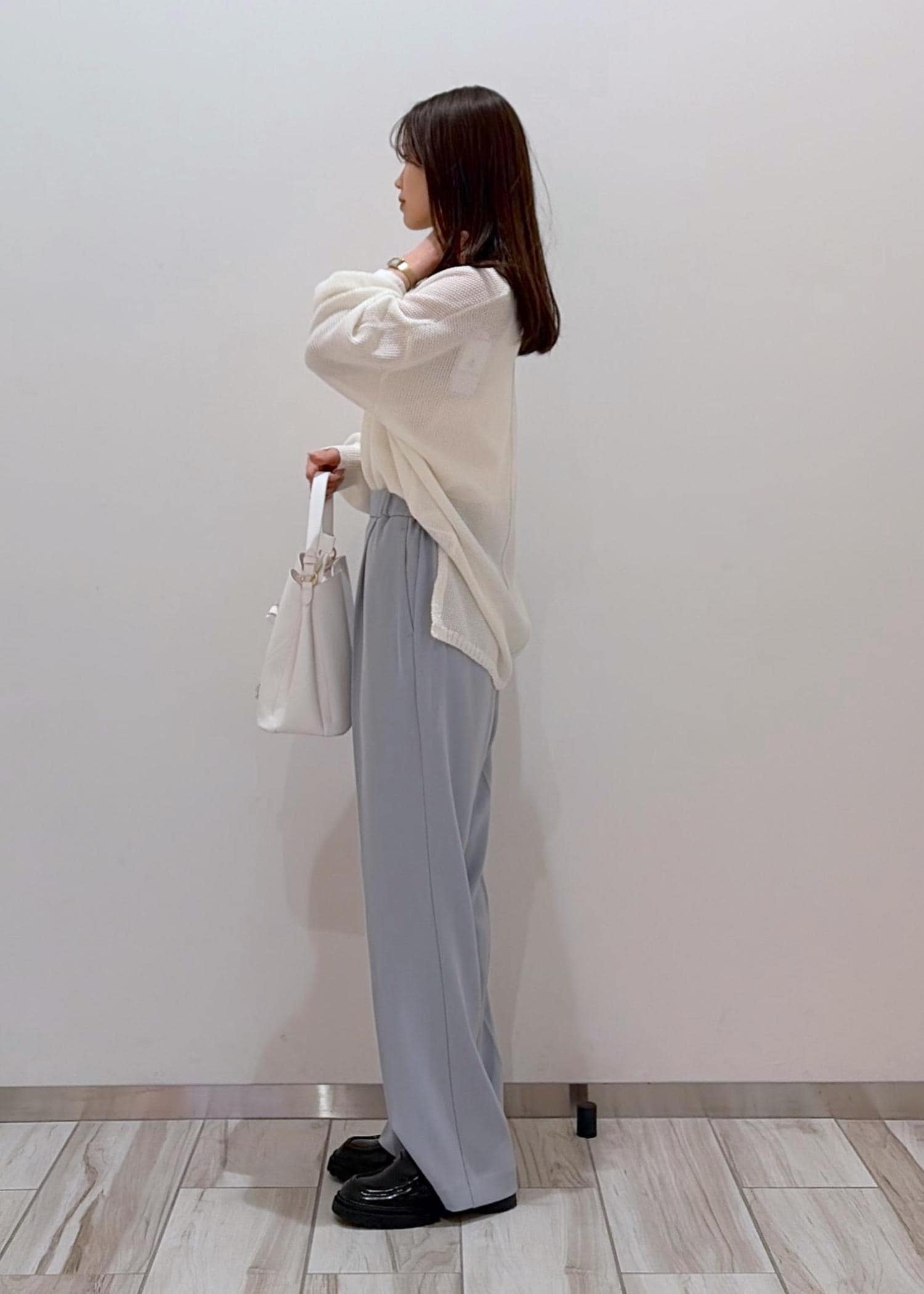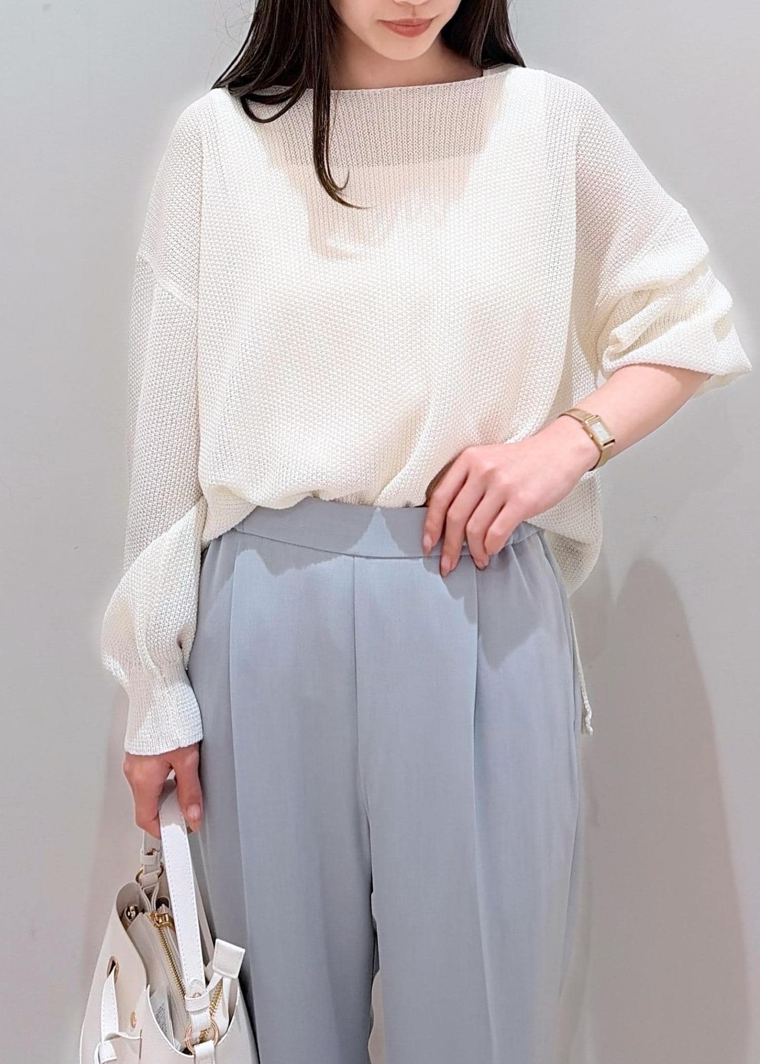 程よい透け感のあるホワイト系のトップスと、爽やかな色合いの寒色系パンツを合わせて、全体的に清涼感のあるスタイリングに♪ パンツは普段カラー物が苦手な方でも挑戦しやすい色味のサックスなのでベーシックな色合いにプラスするだけで差し色にもなり、バリエーションを広げたい方にもおすすめ◎