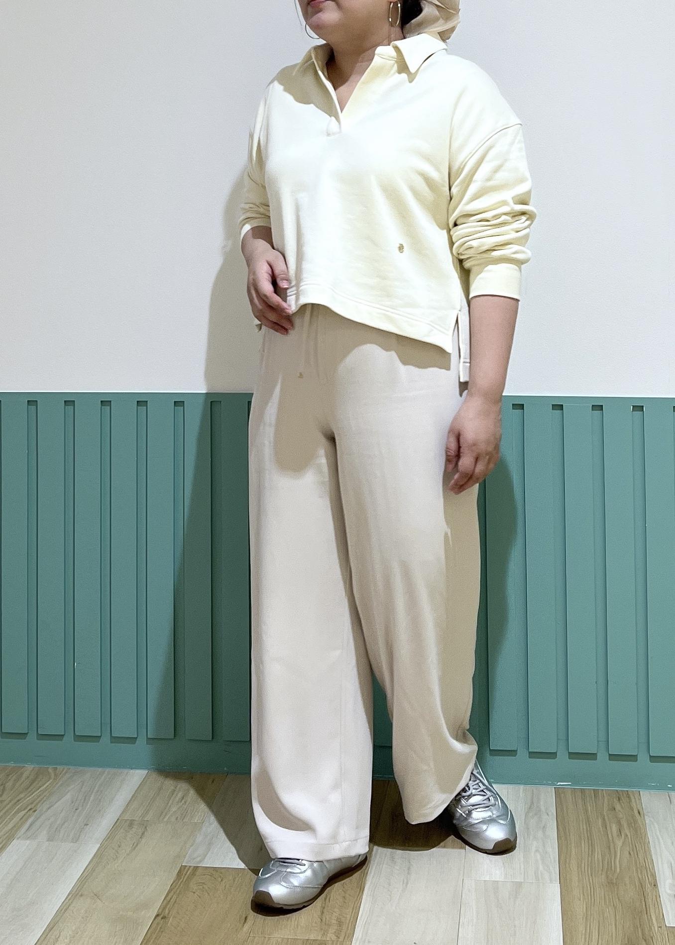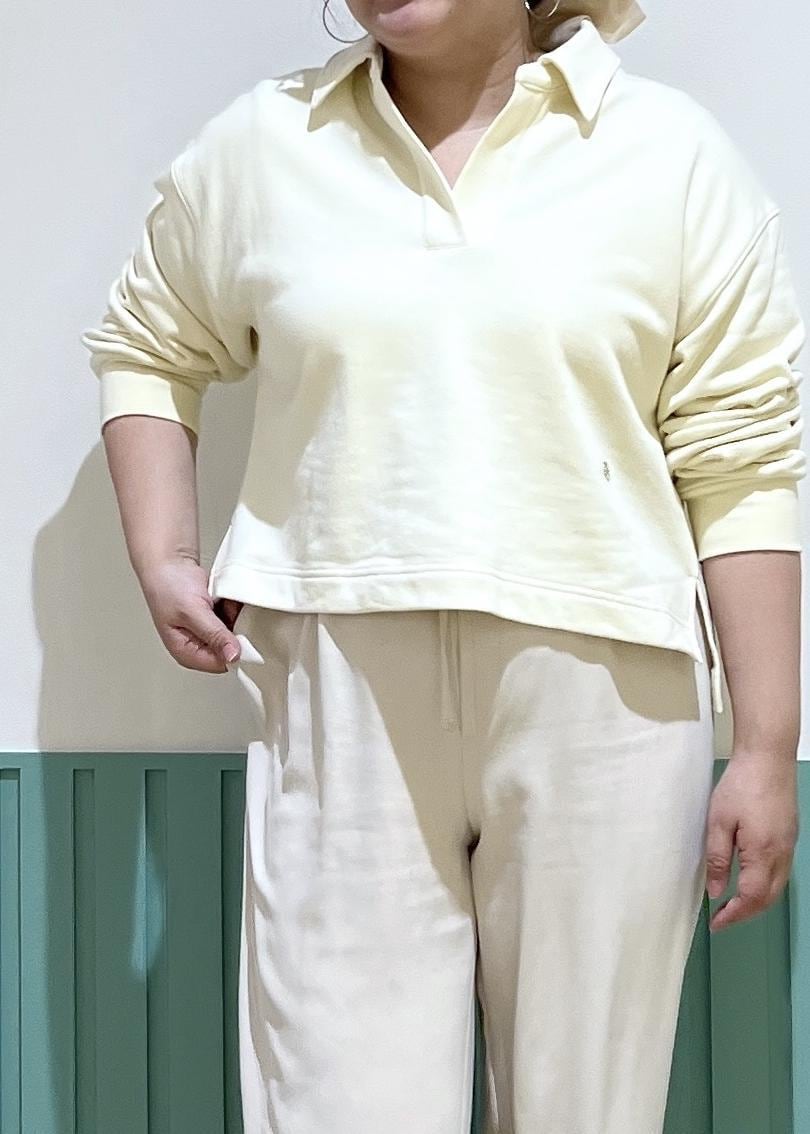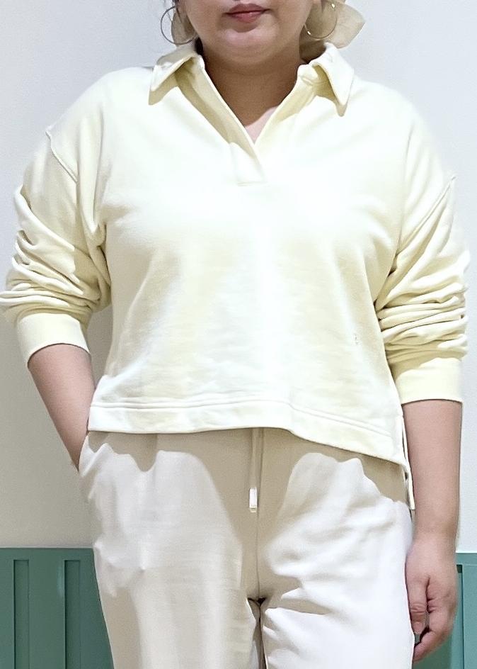 春らしいパステル、イエローを使ったシンプルなスタイリング。スキッパースウェットで、カジュアルすぎない大人カジュアルスタイリングに。