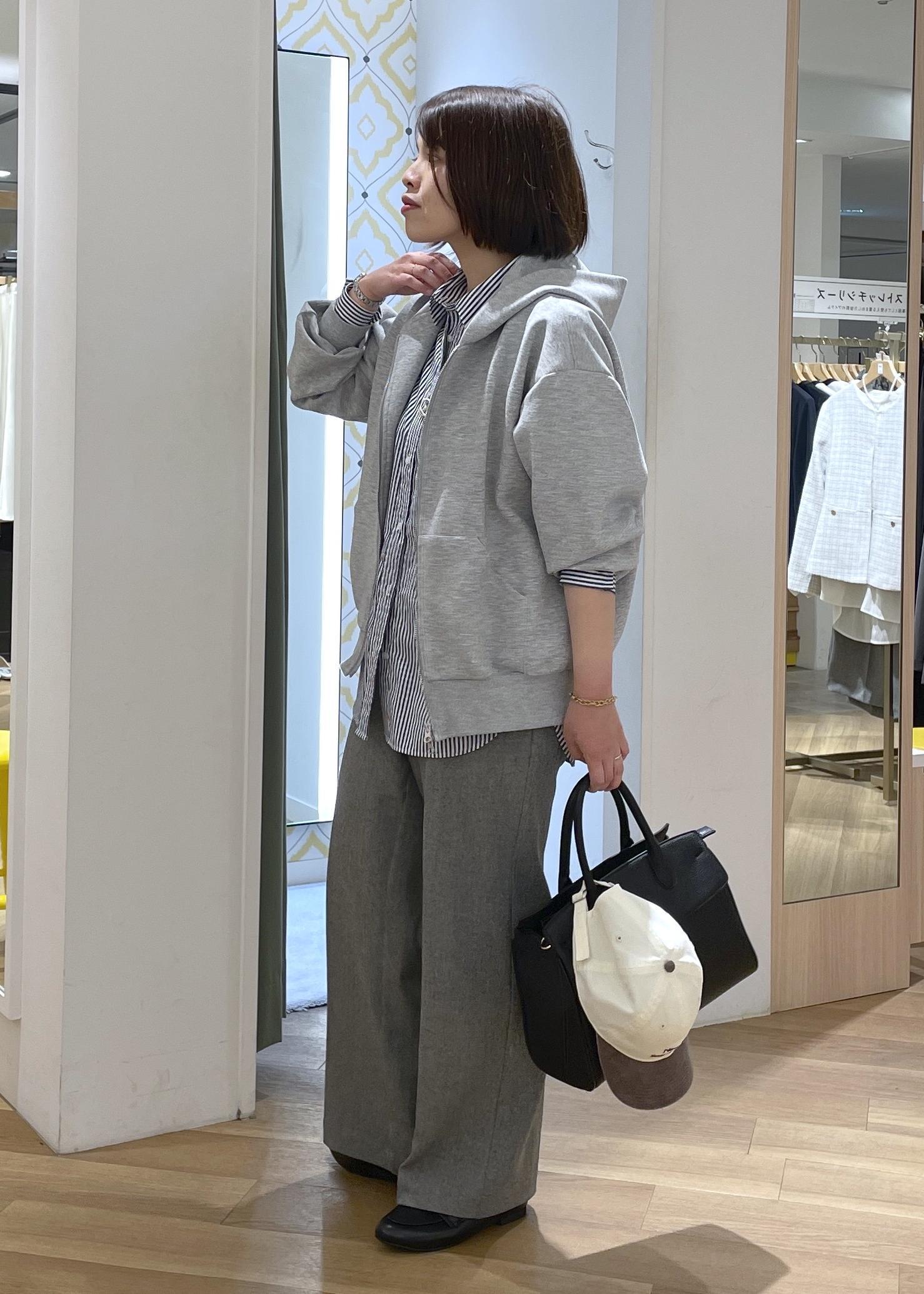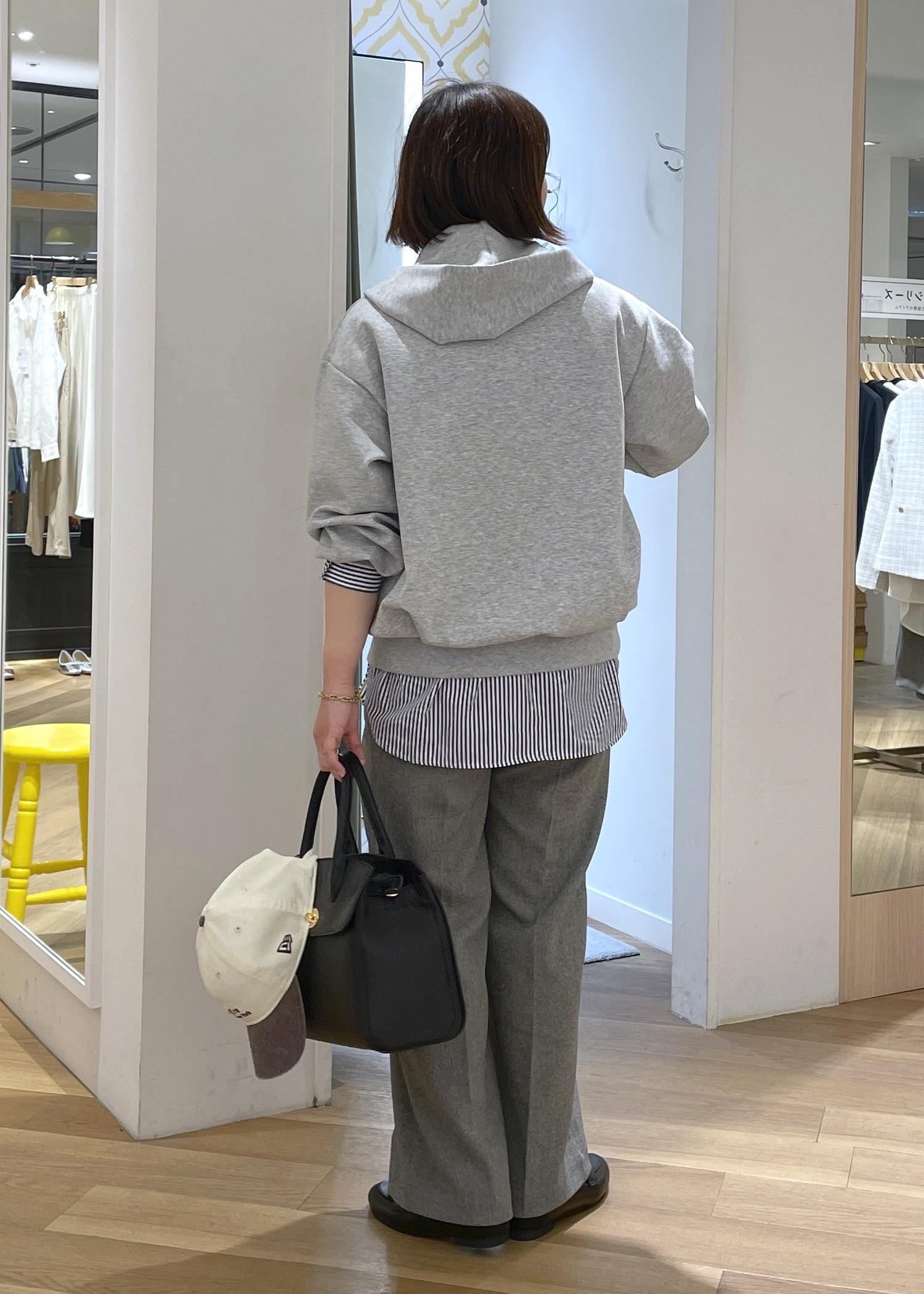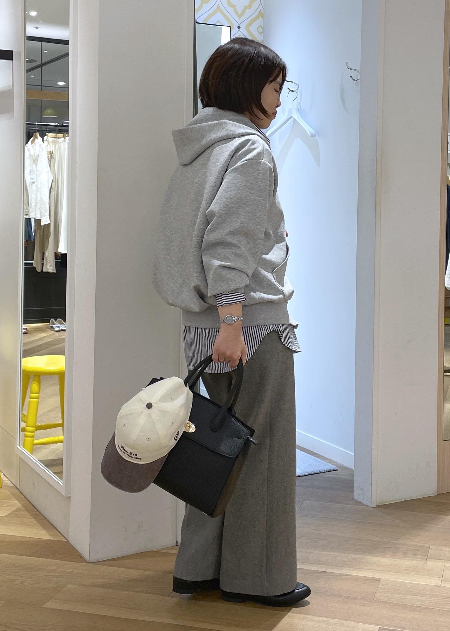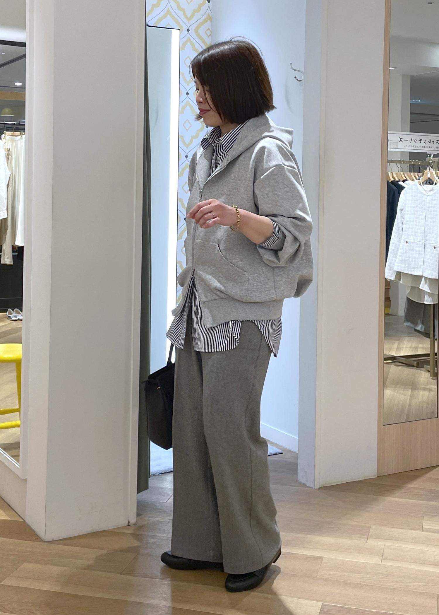 パーカーとパンツはグレーでまとめて、ネイビーのストライプシャツでメリハリを付けました。
