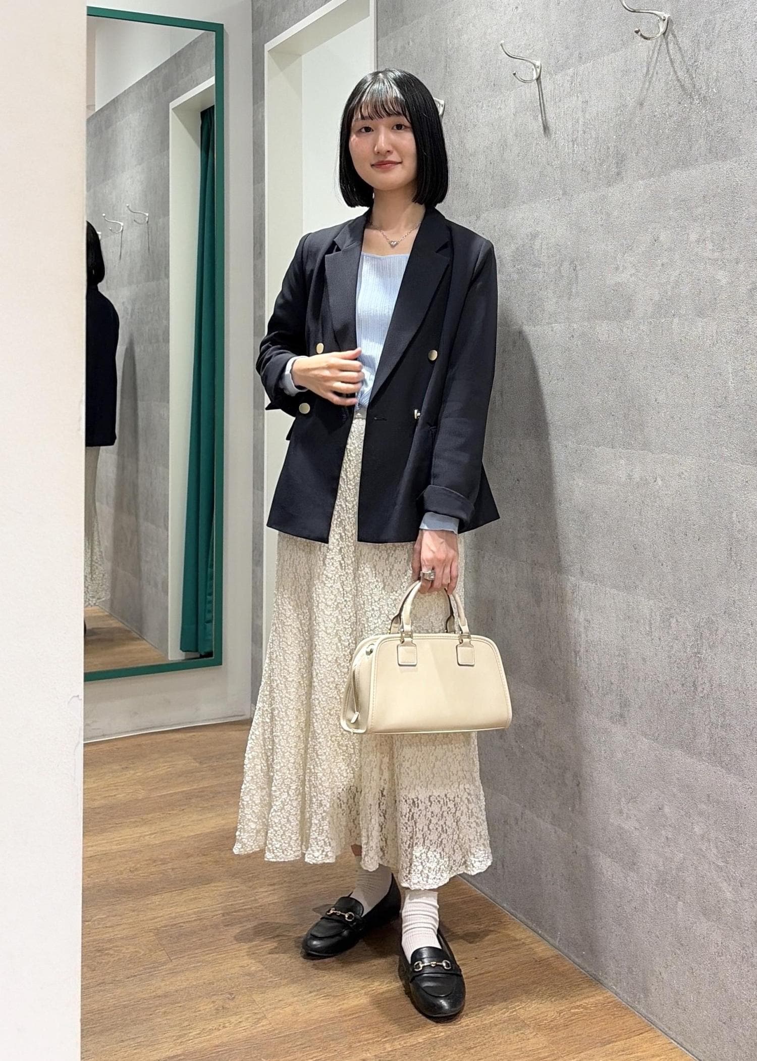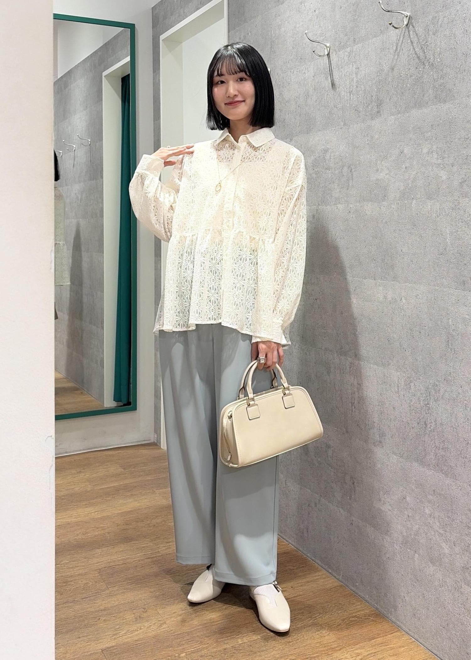 トレンドのレースにグリーンのパンツを合わせた春のきれいめカジュアルコーデです。