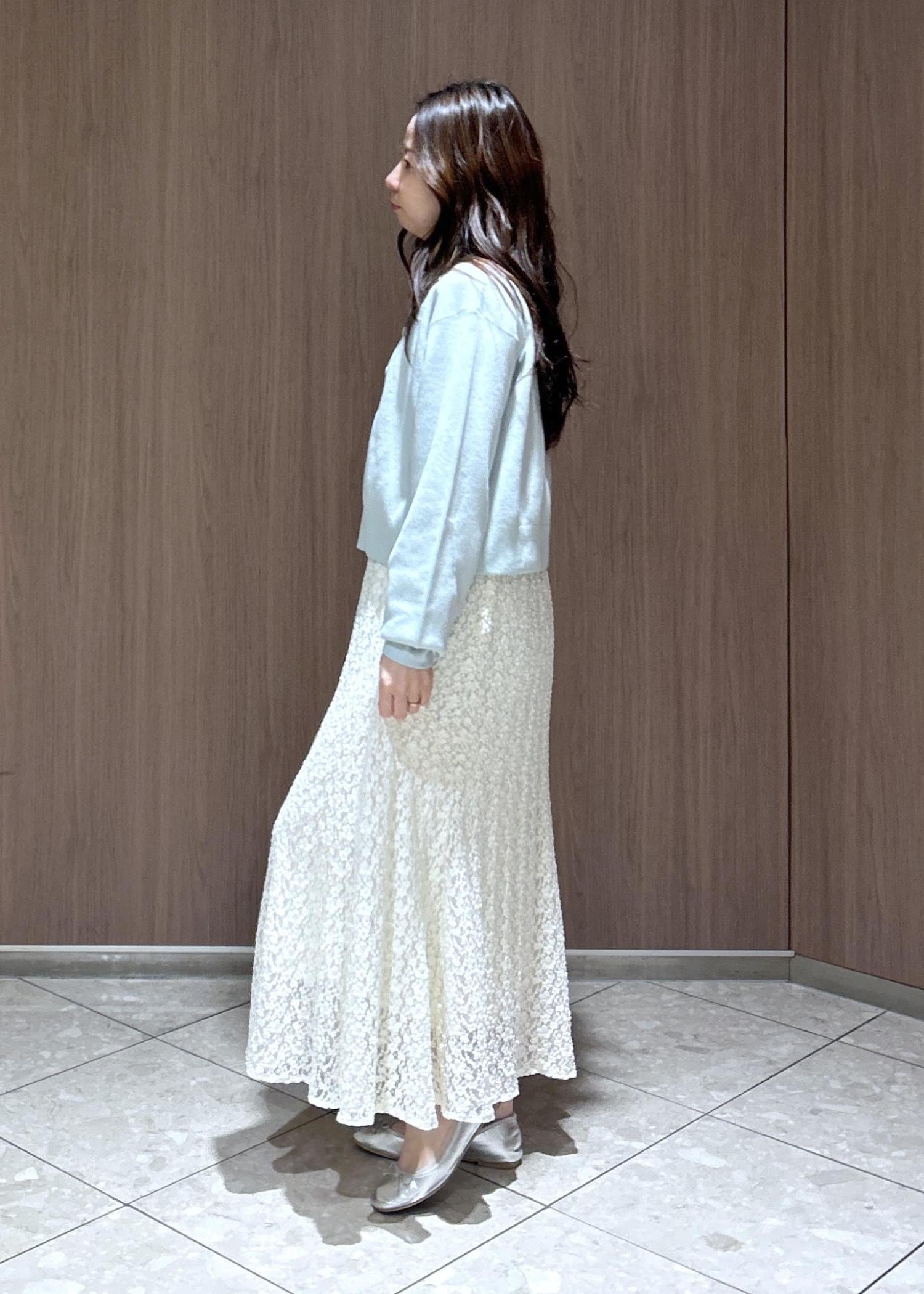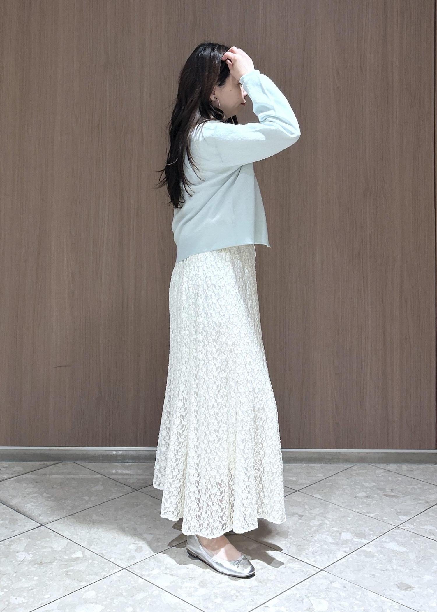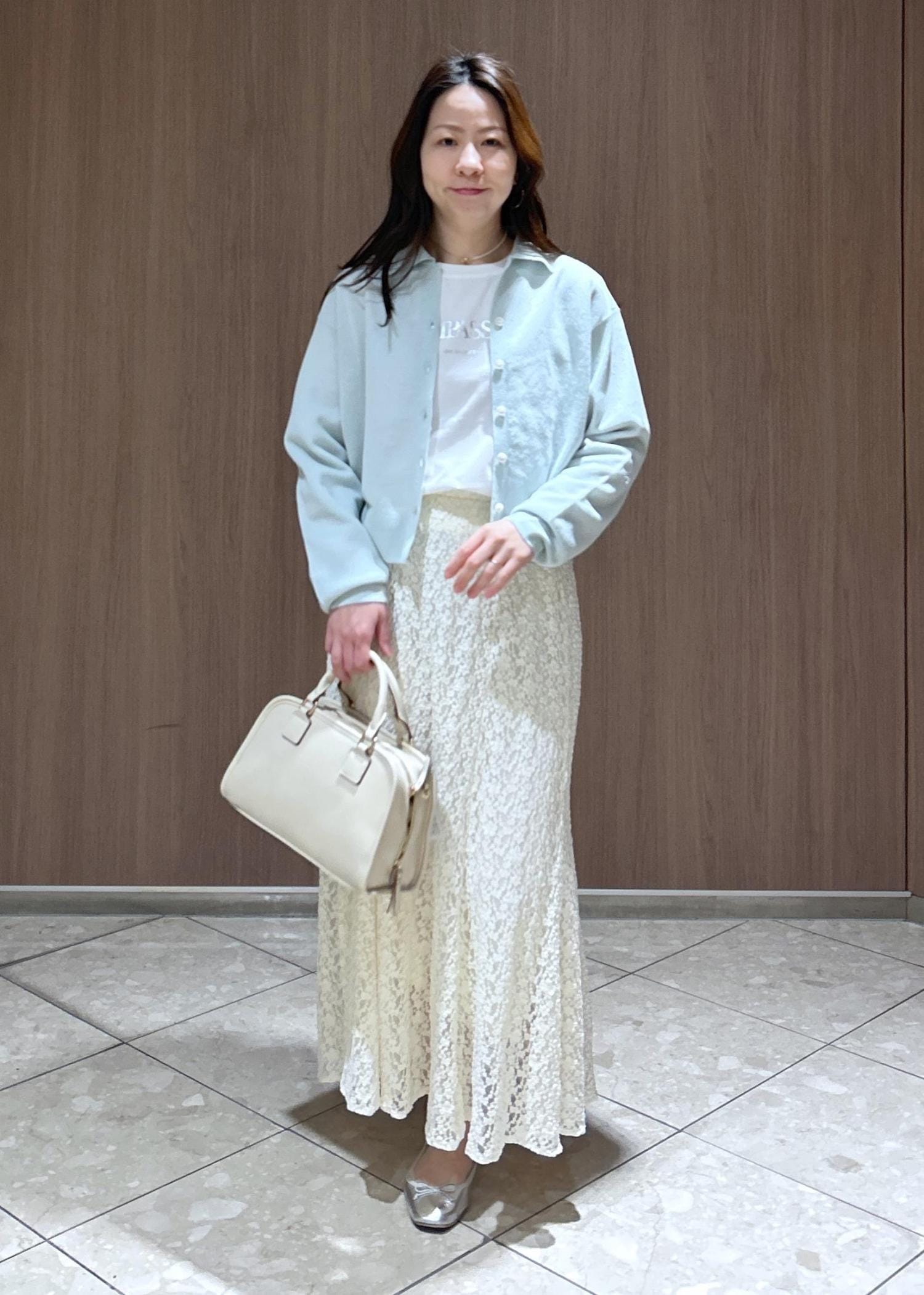 今季トレンドのレースアイテムを中心にフェミニンコーデに仕上げてみました。マーメイドラインのスカートは女性らしくなり、コンパクトトップス合わせで脚長効果を出したコーディネートです。インナーをタンクトップに変えて夏に向けてのスタイリングにしてもらってもいいと思います。