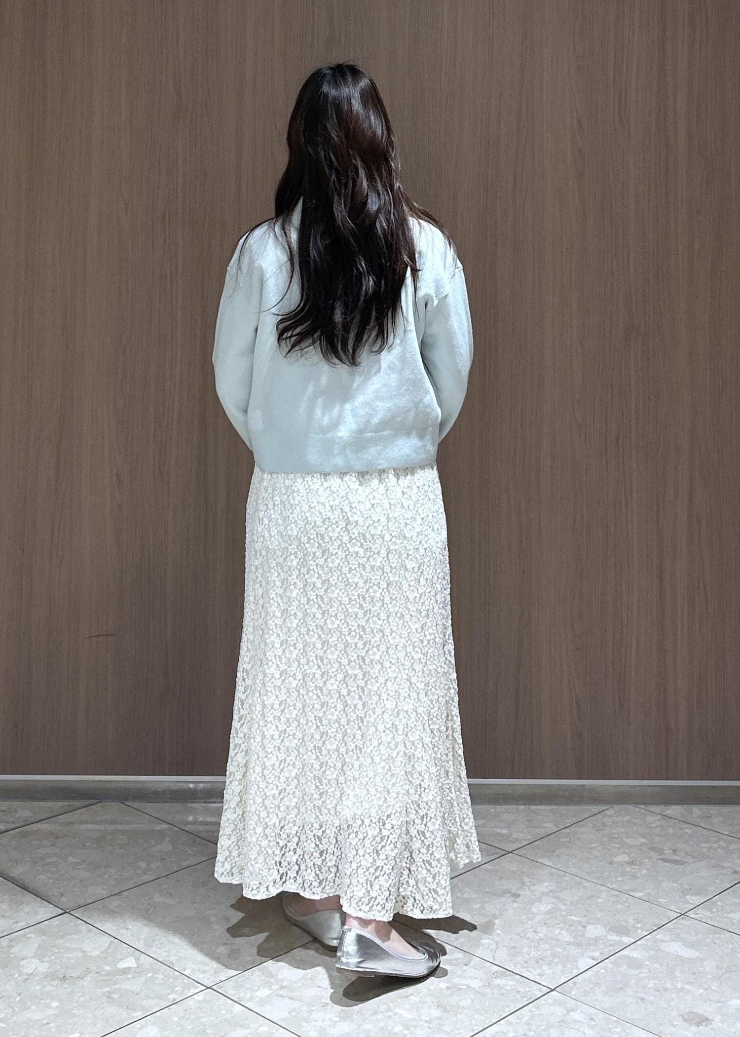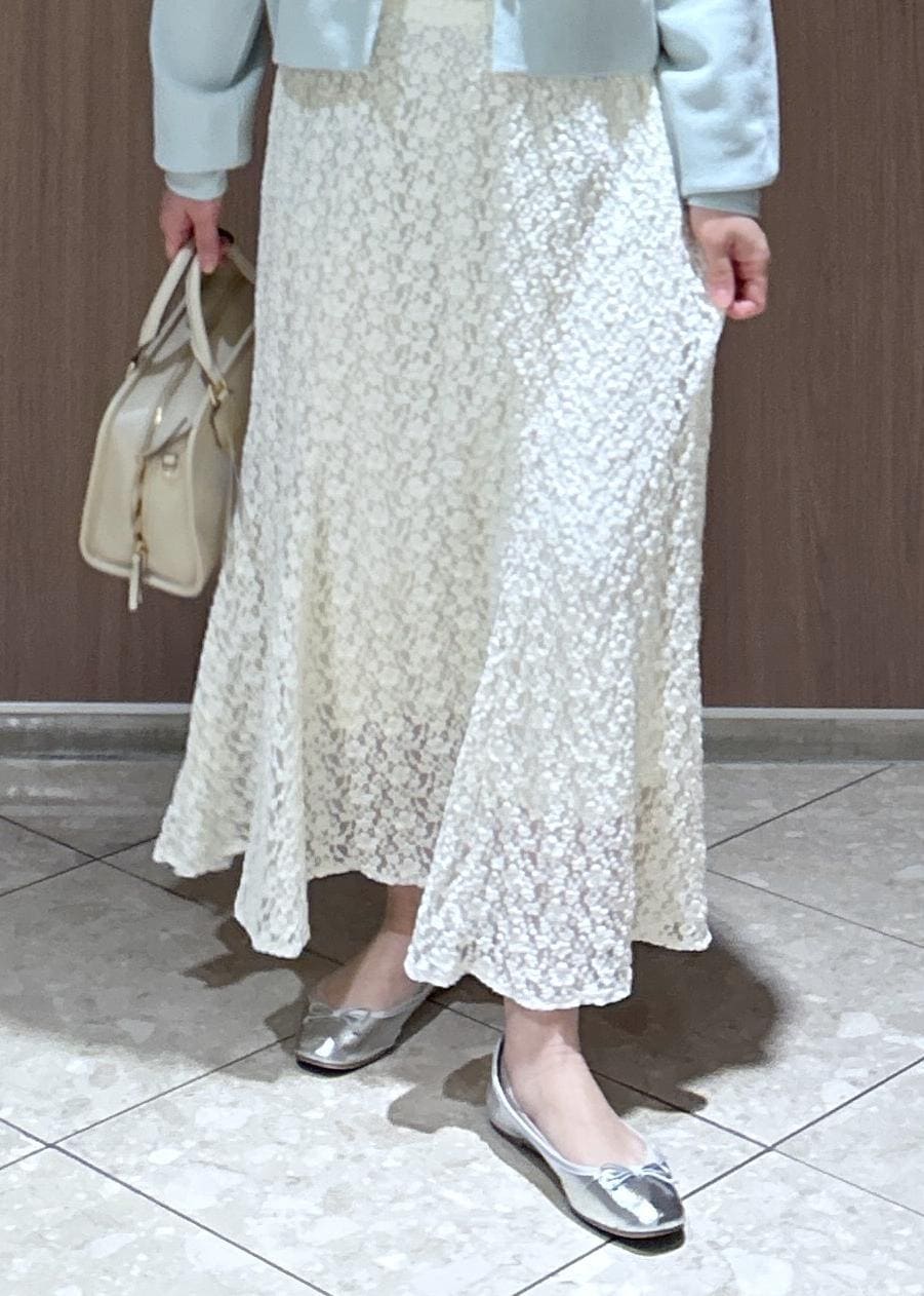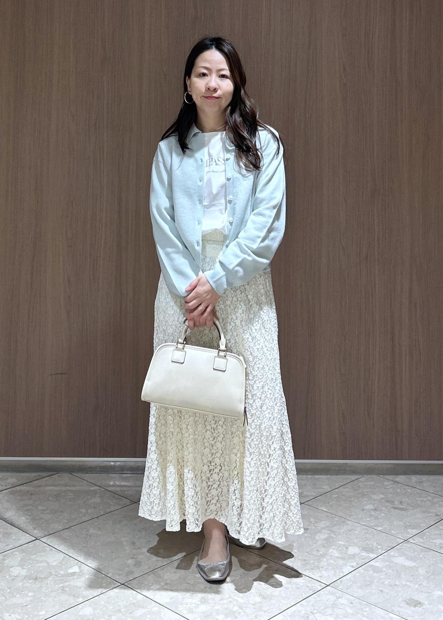 今季トレンドのレースアイテムを中心にフェミニンコーデに仕上げてみました。マーメイドラインのスカートは女性らしくなり、コンパクトトップス合わせで脚長効果を出したコーディネートです。インナーをタンクトップに変えて夏に向けてのスタイリングにしてもらってもいいと思います。
