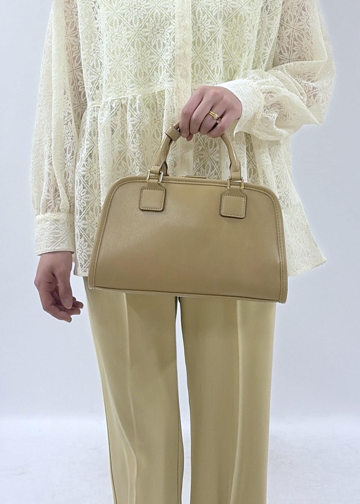 ボストン型でマチがあり自立するバッグです。長財布なども楽々入れられるサイズ感。ショルダーストラップも付いています。