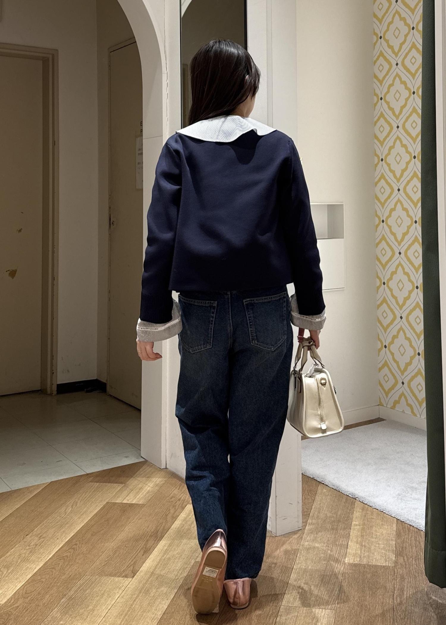 シューズはネイビーの反対色のピンクを選び、差し色として取り入れたのがポイントです。