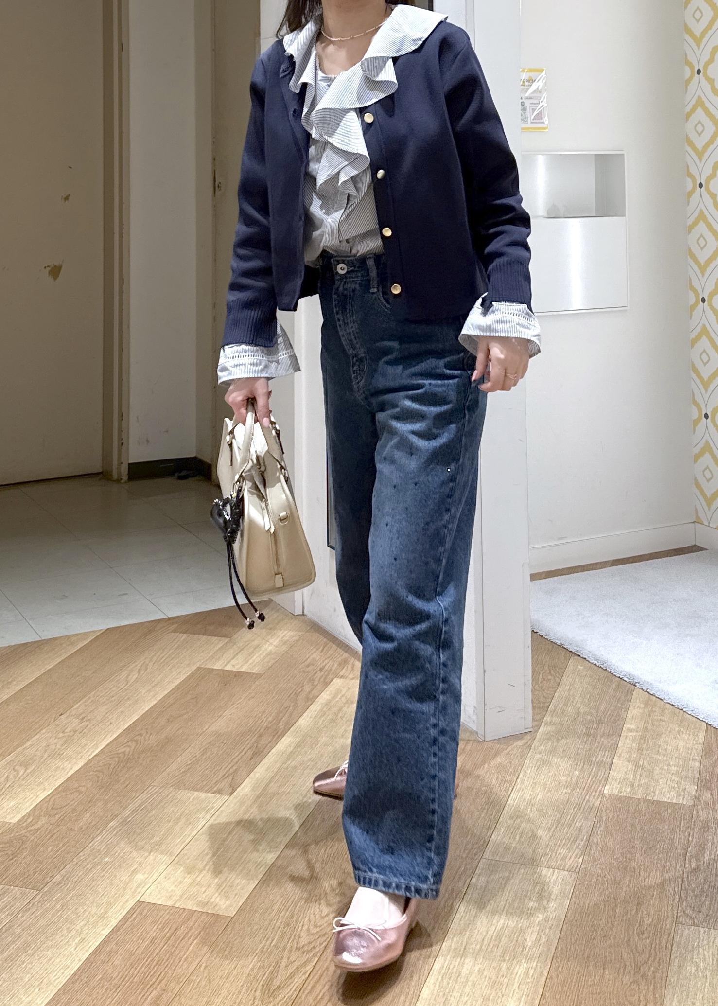 ラッフルブラウスにカーディガンを羽織ったフレンチシックなコーデ