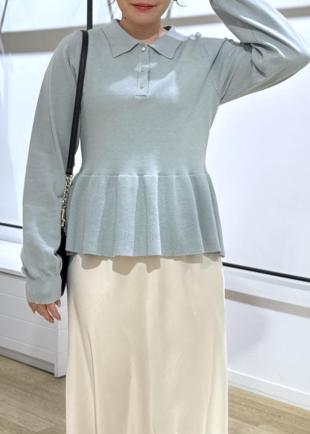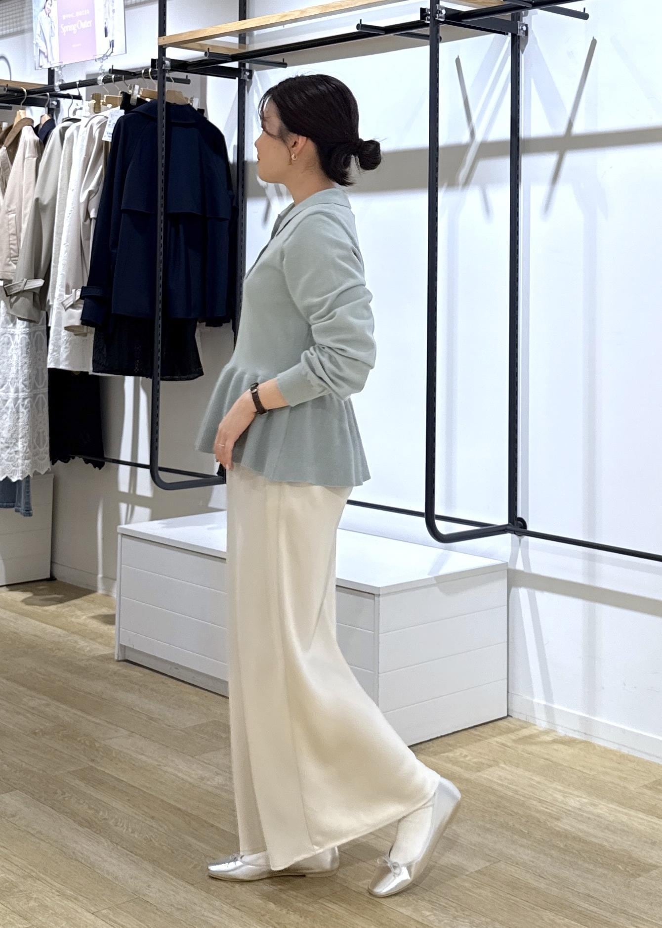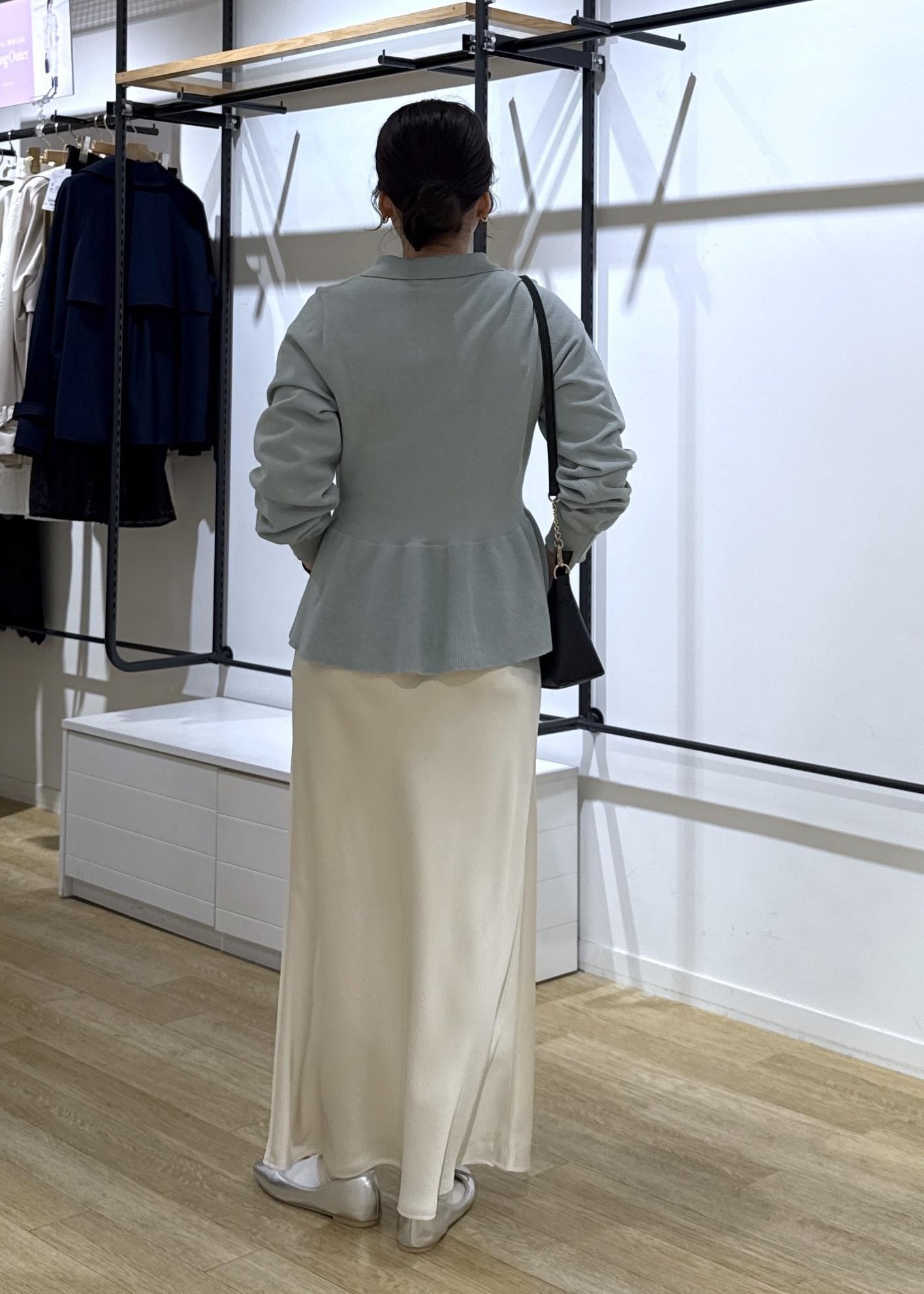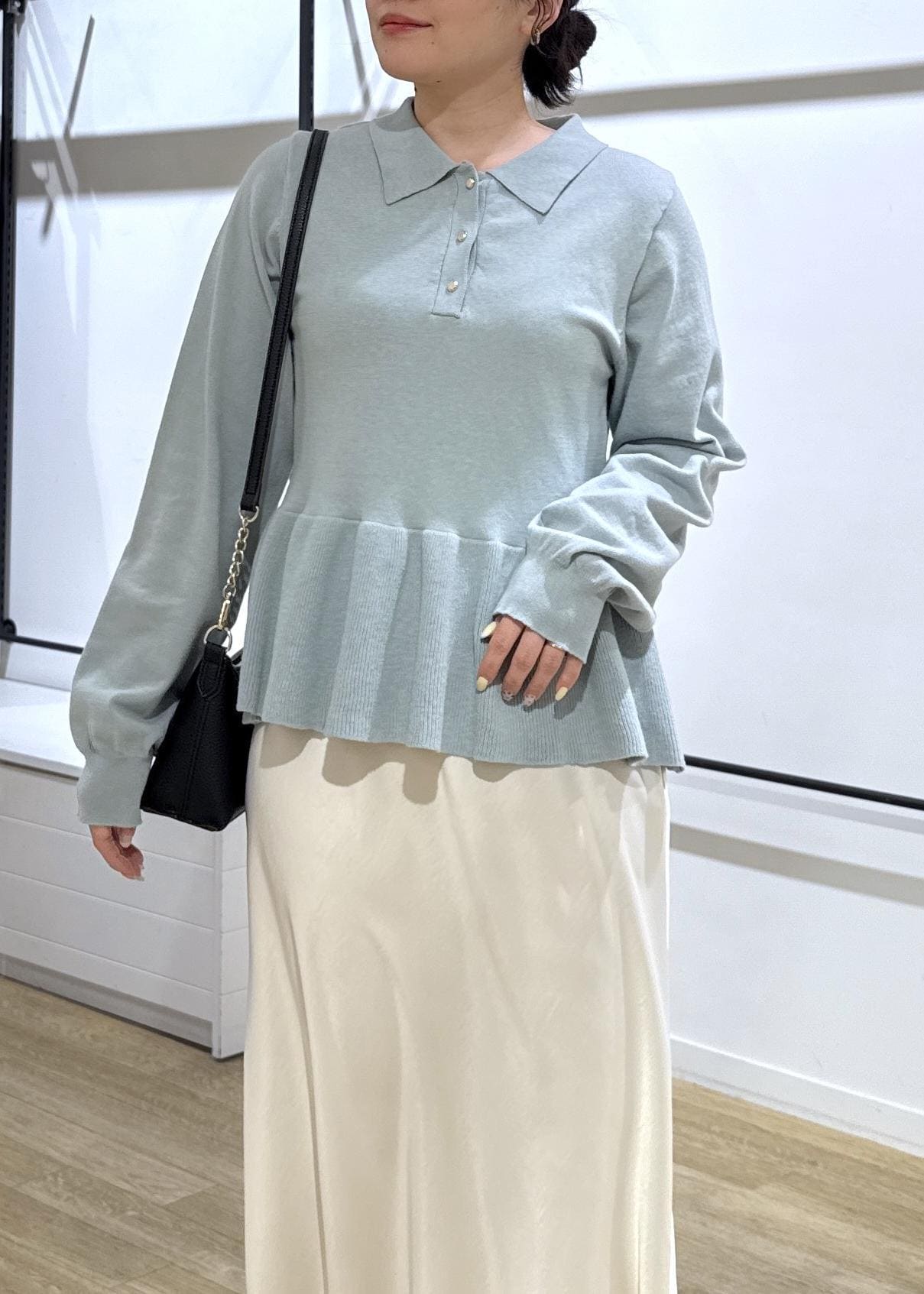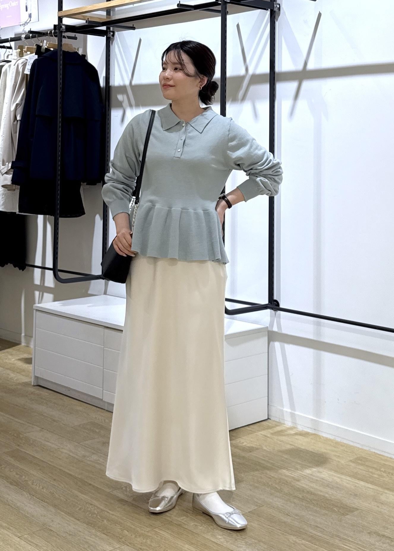 ペプラムシルエットが可愛いニットを落ち感のあるサテンスカートと合わせて、きれいめコーデにしてみました!
