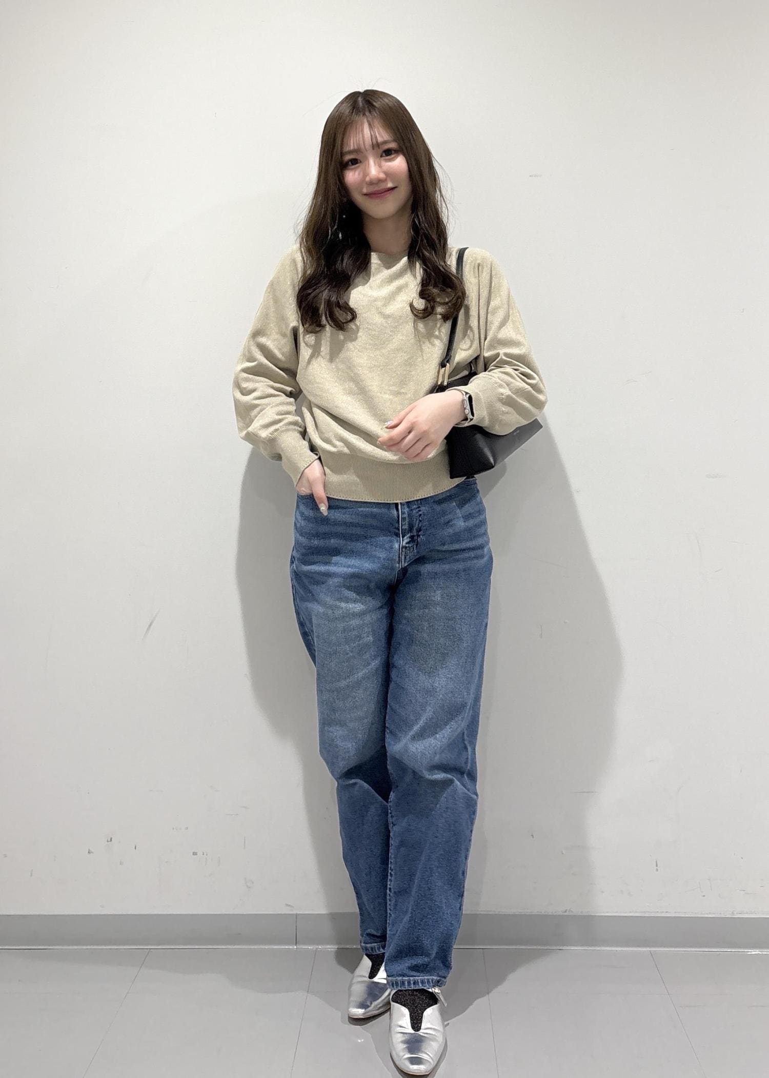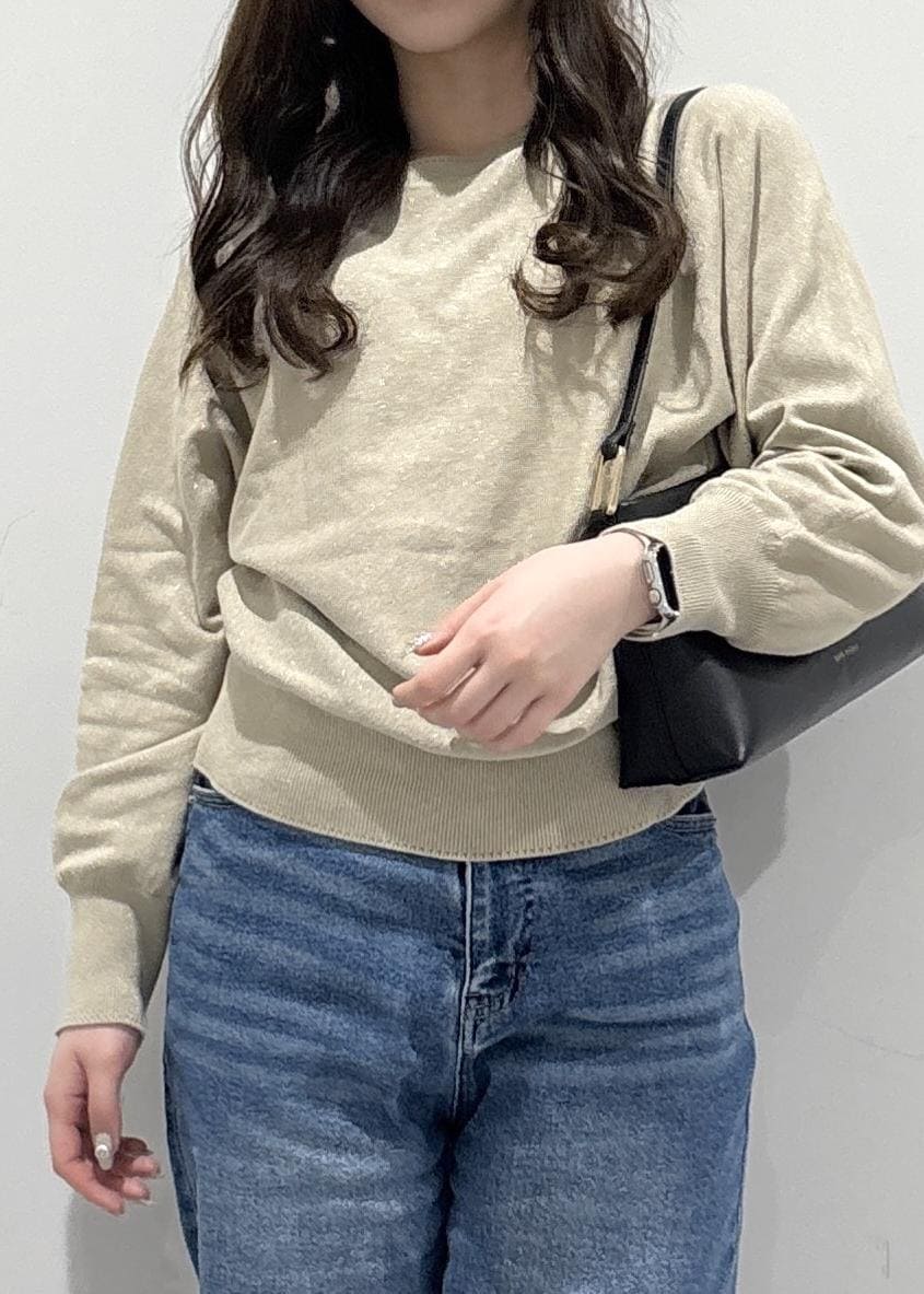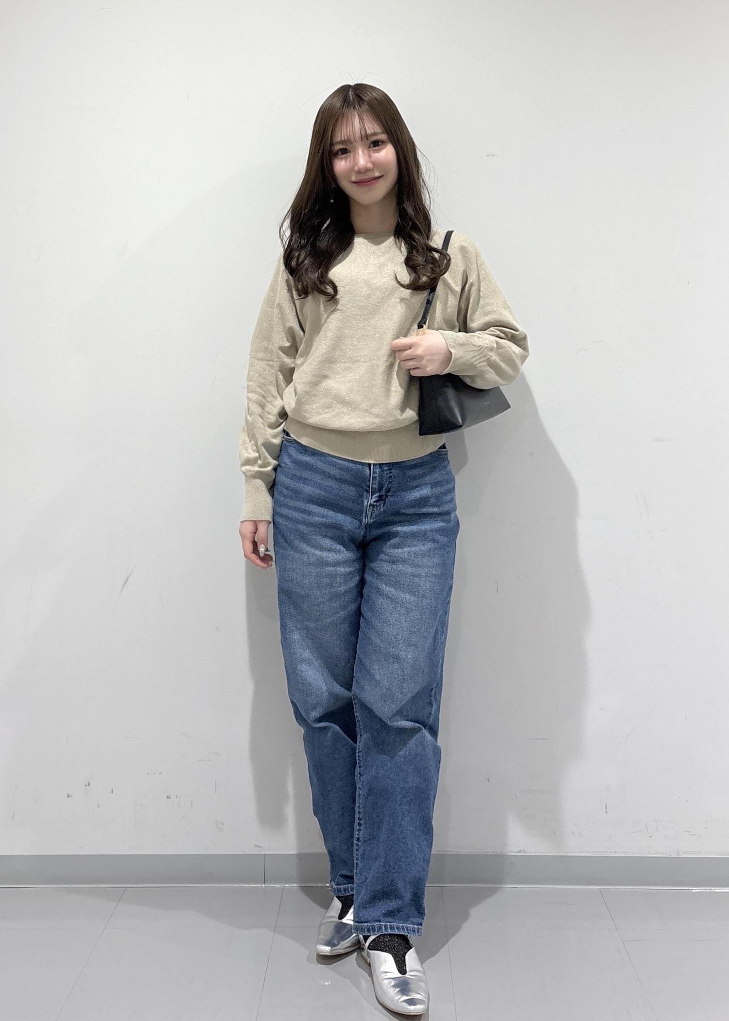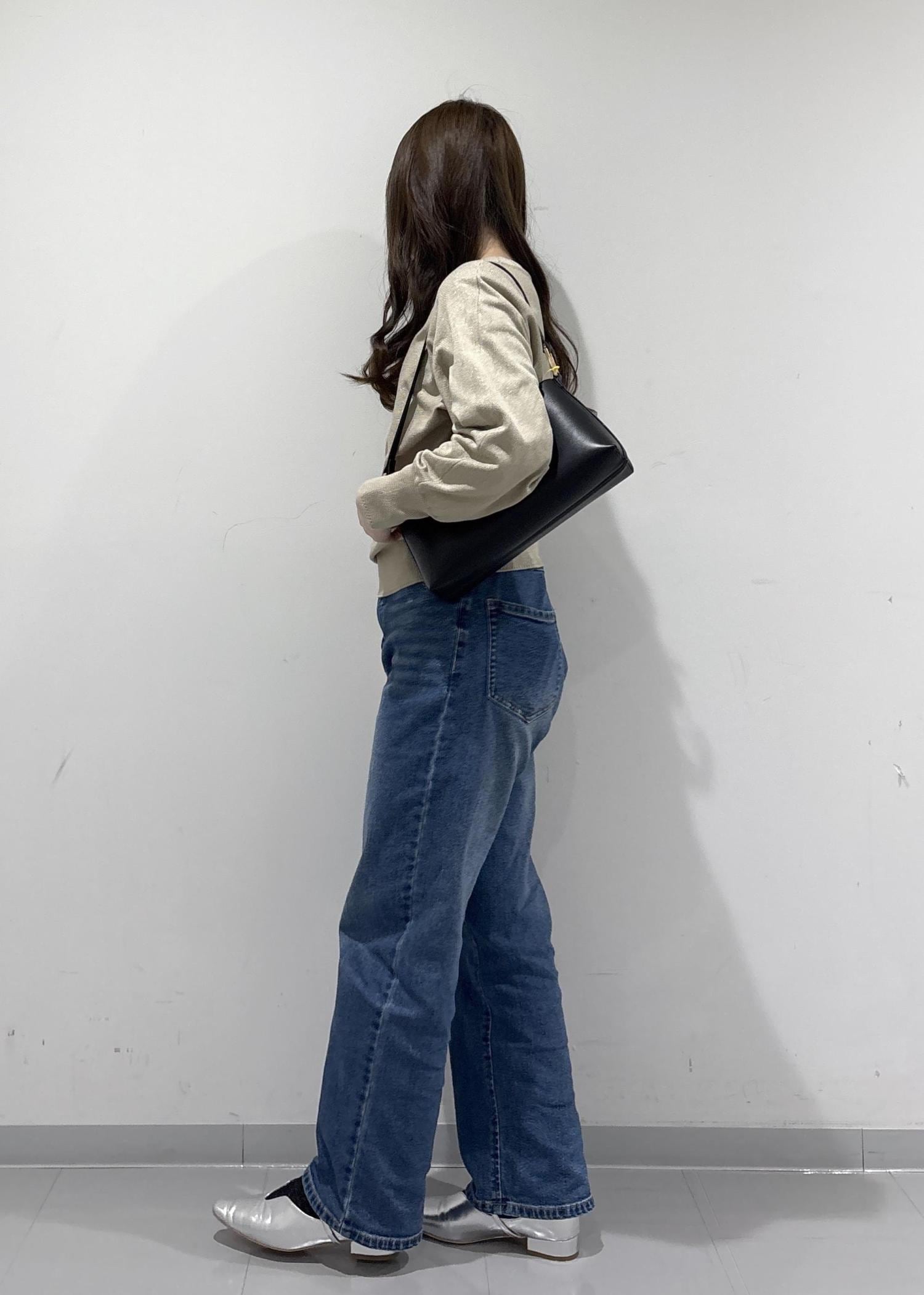 こちらのコーデのポイントは、綺麗め感があるように見えて抜け感があるコーデになっています!ラメ糸入りのドルマンニットは、存在感がありすぎないラメでドルマンでゆったりと体型カバーできるのがポイントです!デニムで抜け感を出して、バッグと靴はキレイめにしてバランスの良い抜け感コーデになっています!