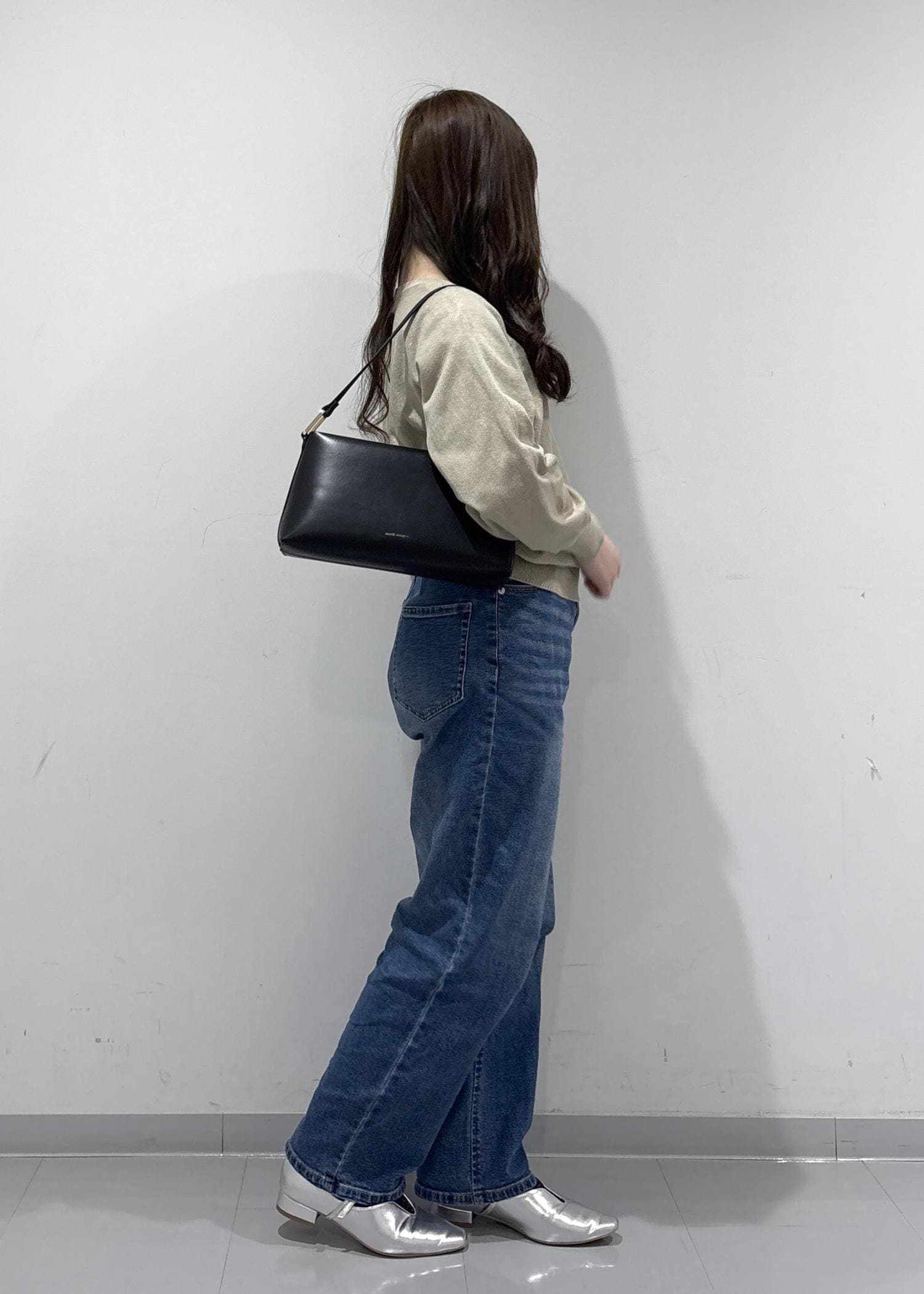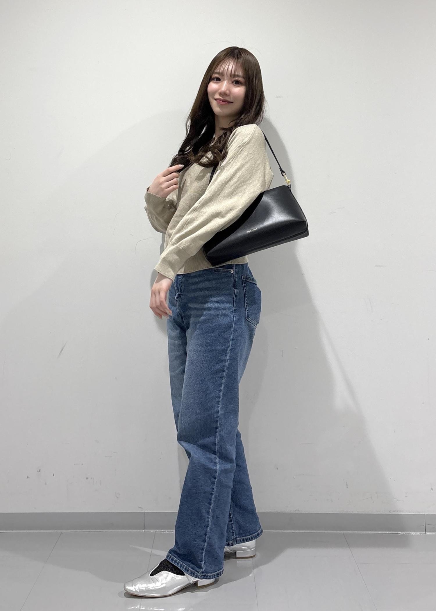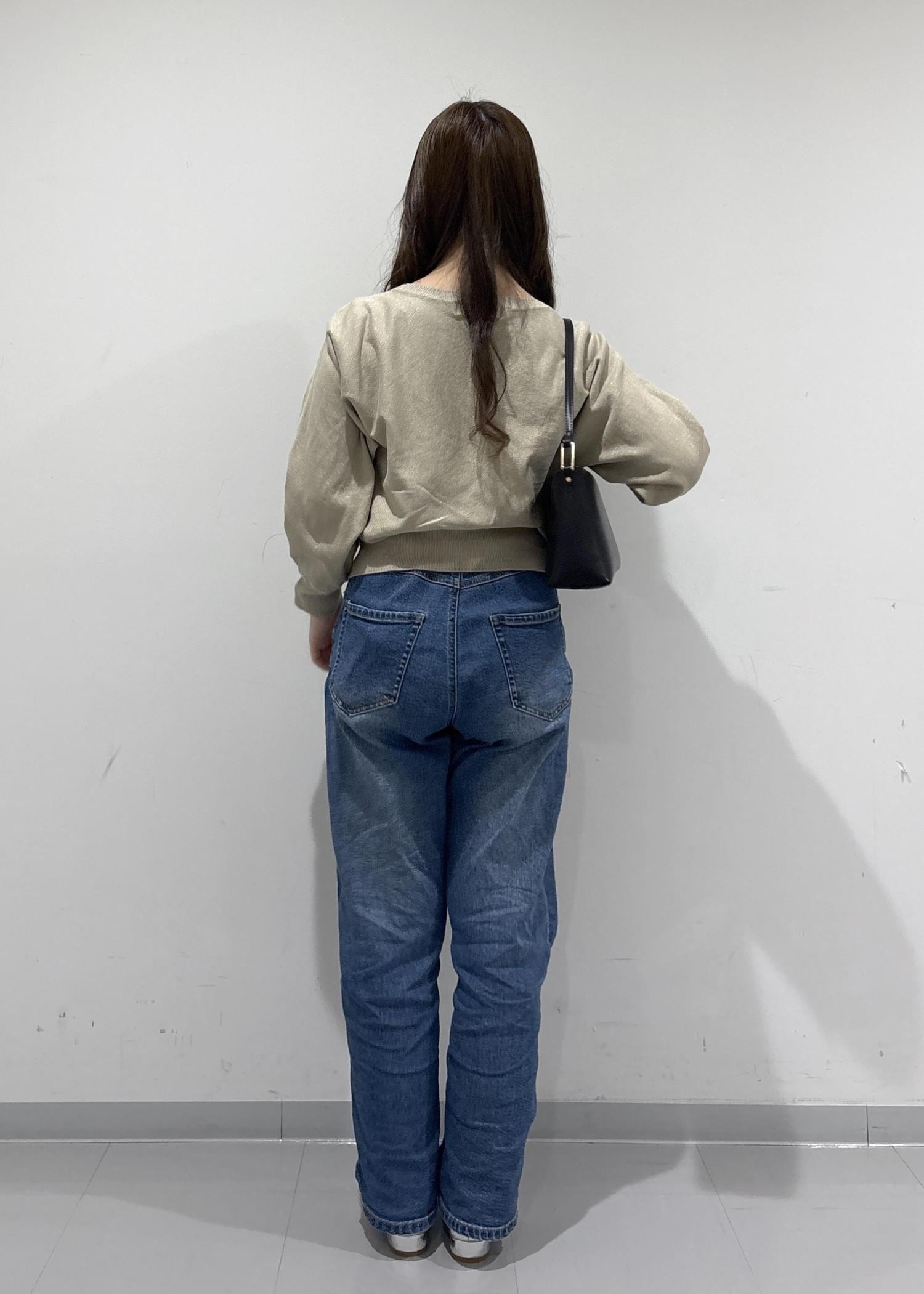 こちらのコーデのポイントは、綺麗め感があるように見えて抜け感があるコーデになっています!ラメ糸入りのドルマンニットは、存在感がありすぎないラメでドルマンでゆったりと体型カバーできるのがポイントです!デニムで抜け感を出して、バッグと靴はキレイめにしてバランスの良い抜け感コーデになっています!