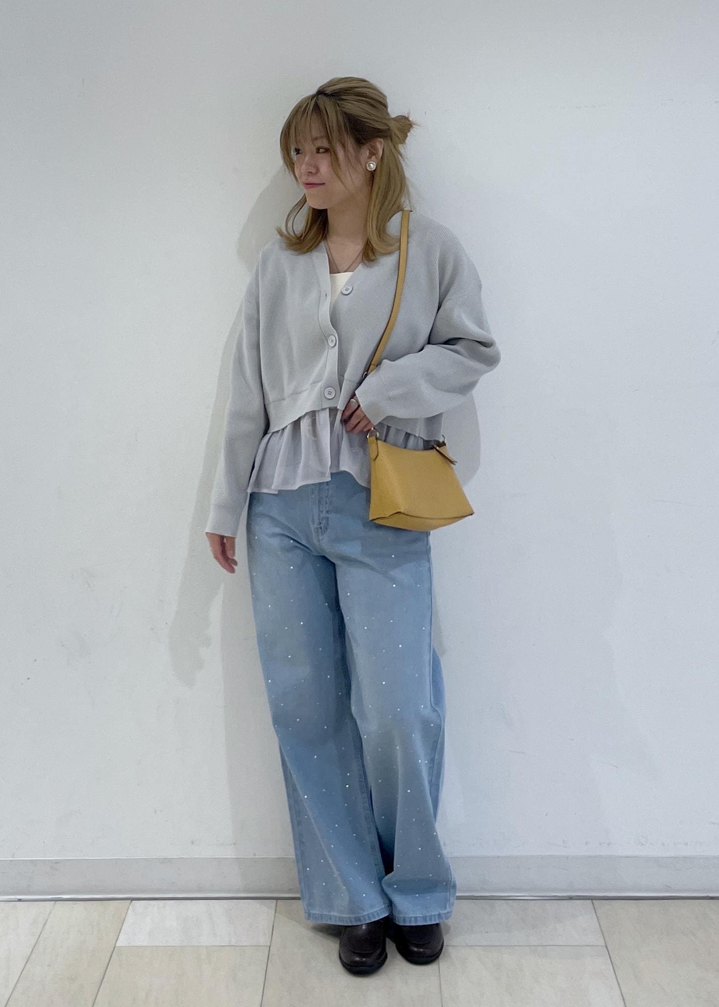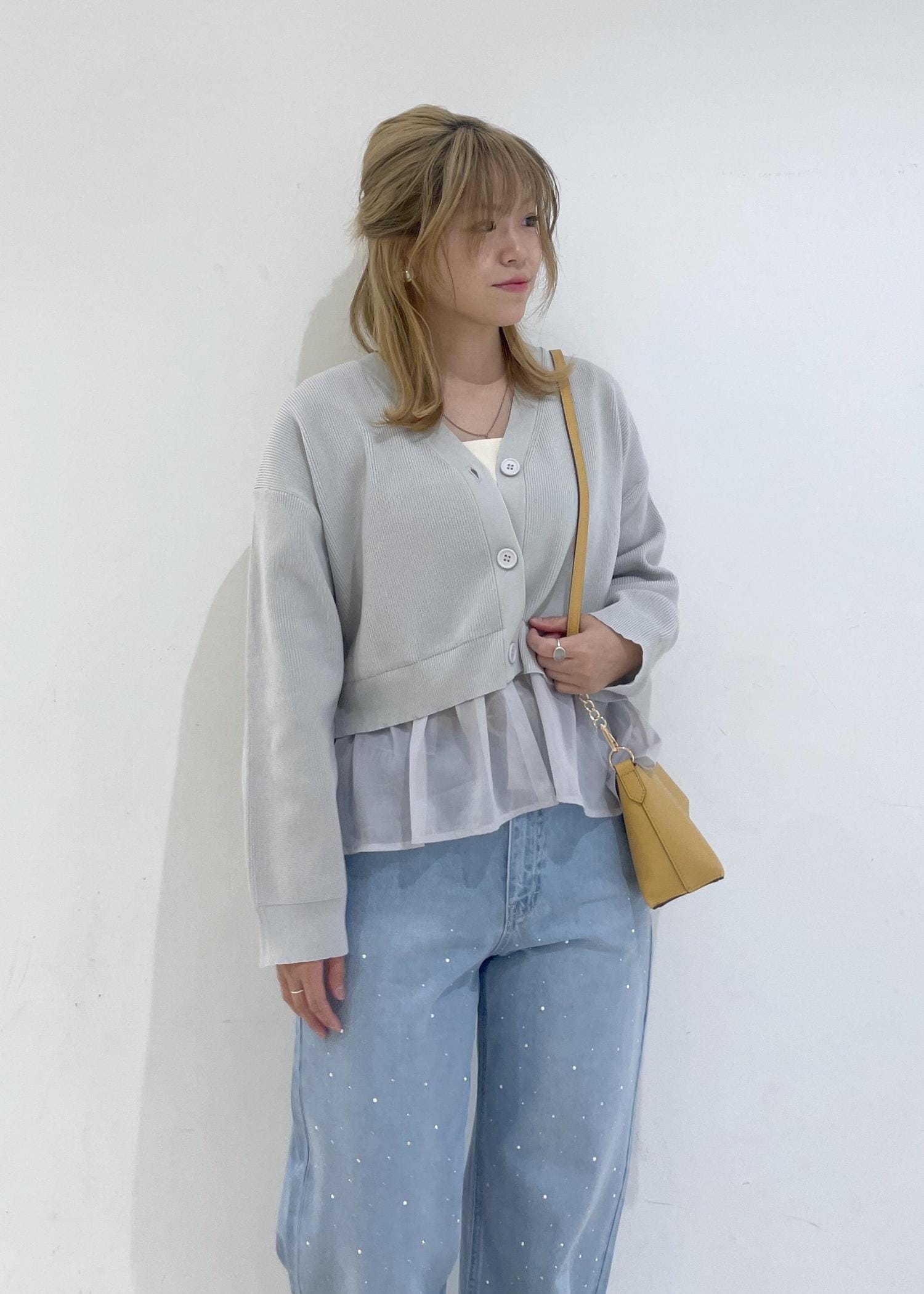 ビジューデニムのキラキラをメインに短い丈のカーディガンで合わせました!