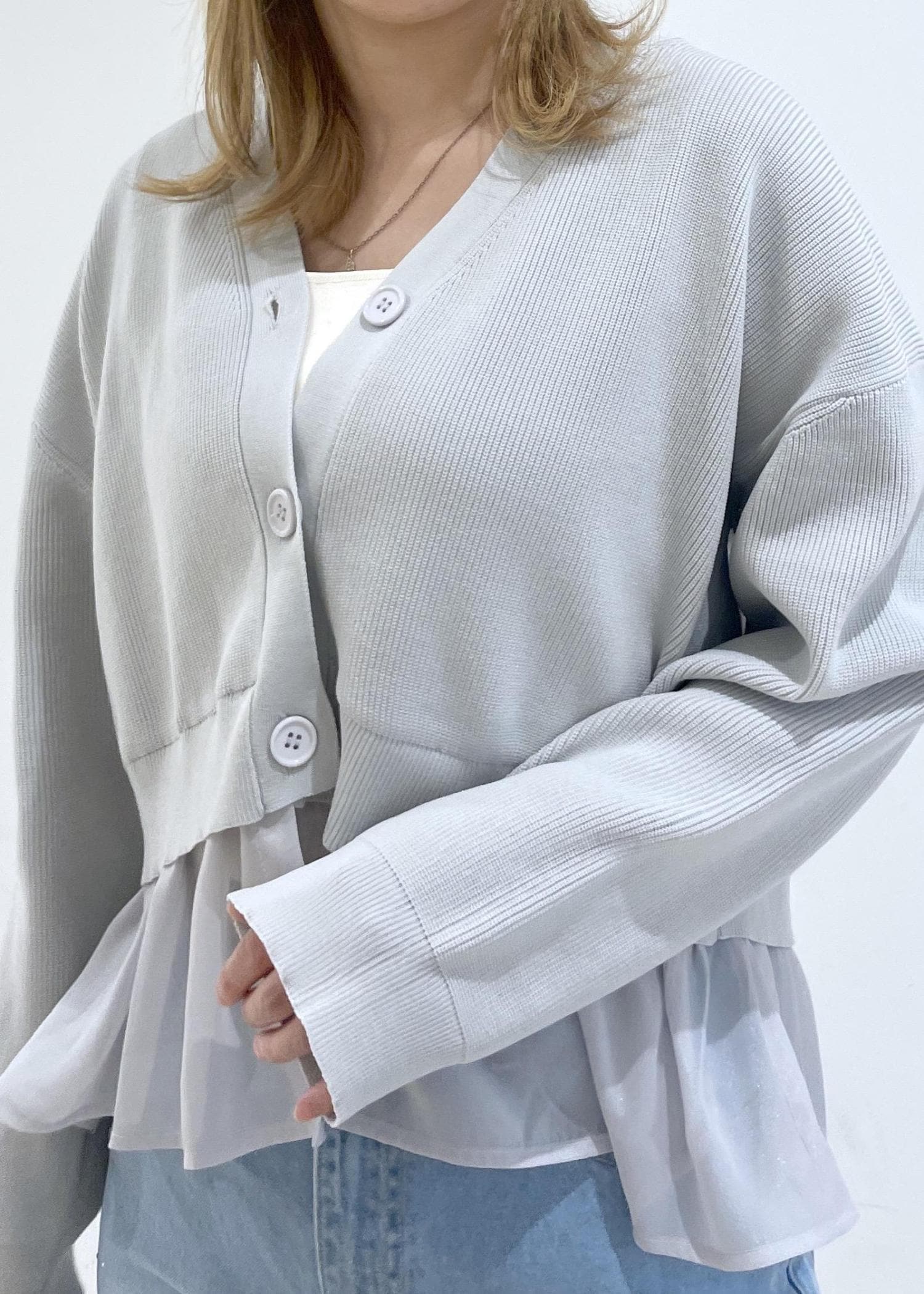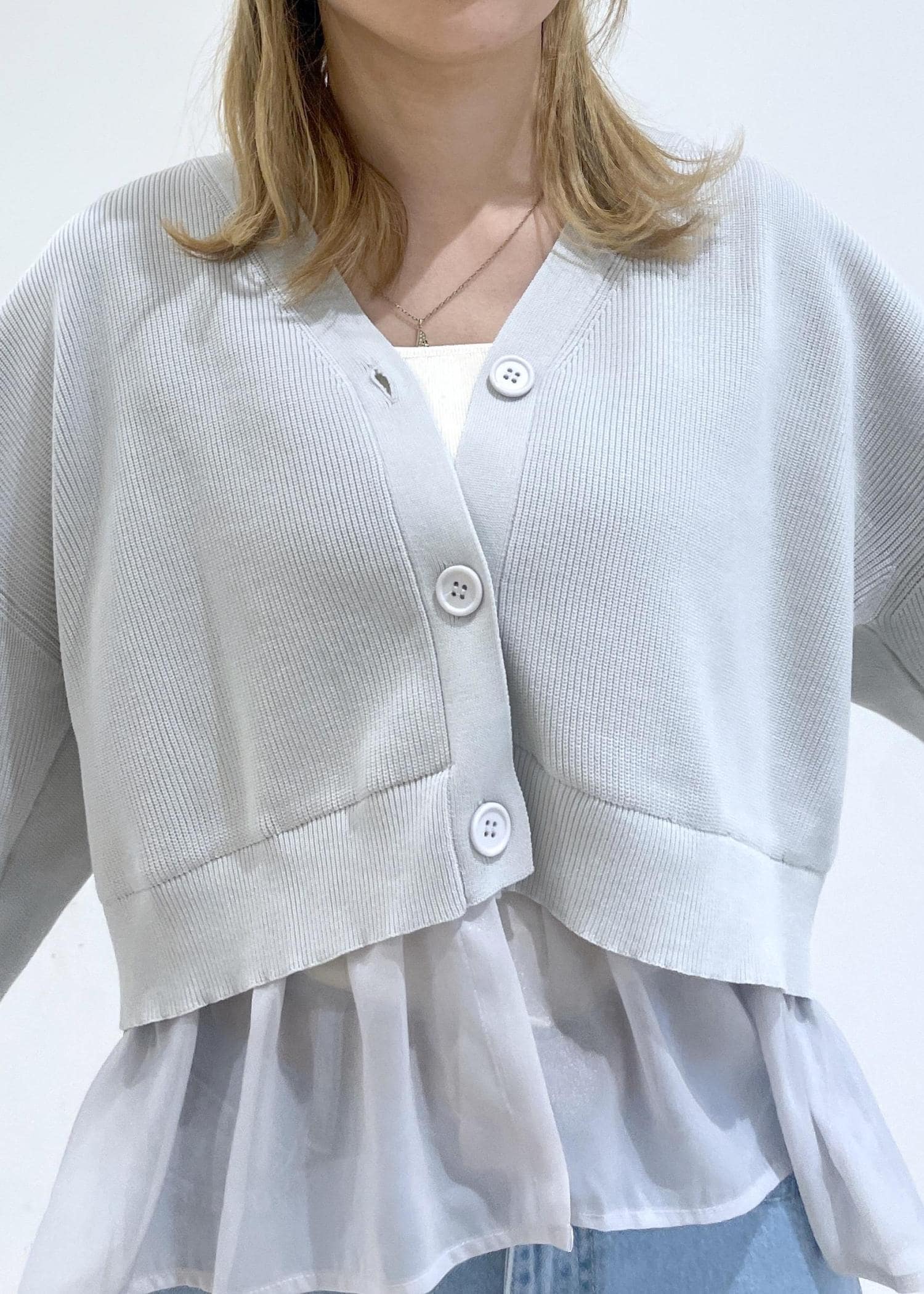 2BUY10%OFFROPÉ PICNIC異素材ドッキングニットカーディガン/イージーケアライトグレー / F¥5,489レビュー身幅はゆったりしていて、かなり短丈です!