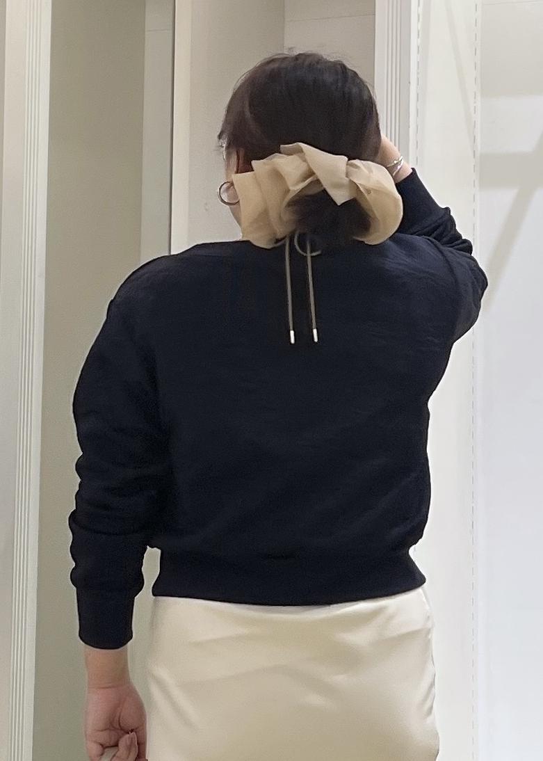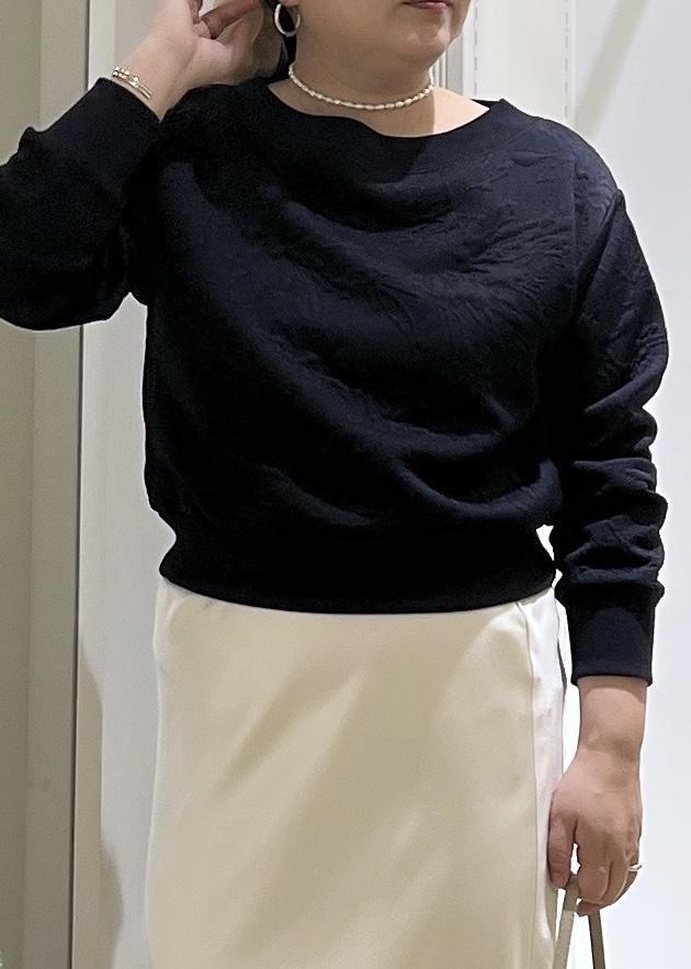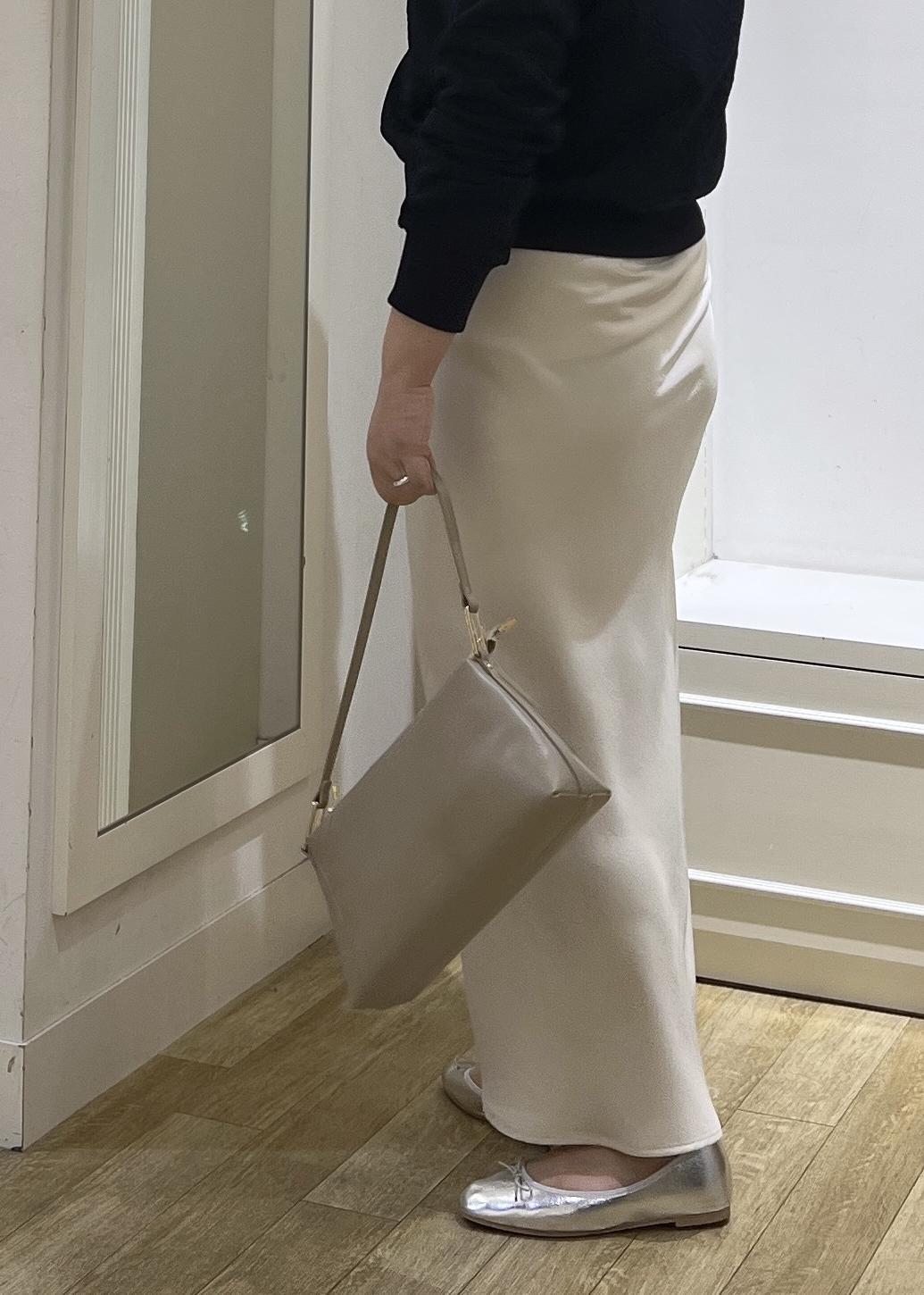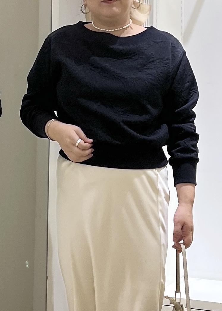 ワンショルにもなるスウェットをあえてボートネックで着用。光沢感のあるスカートと合わせてフェミニンな印象に♪