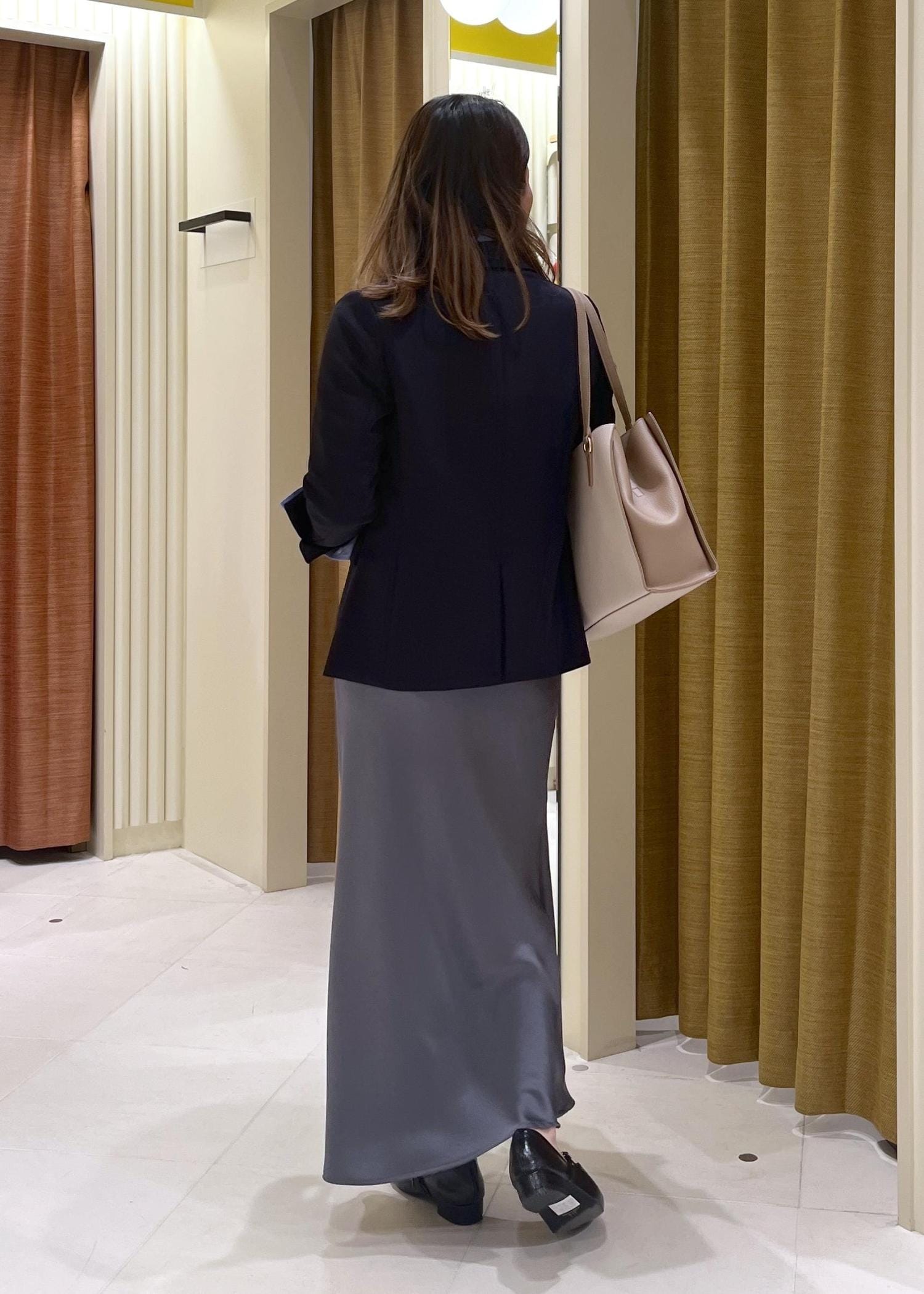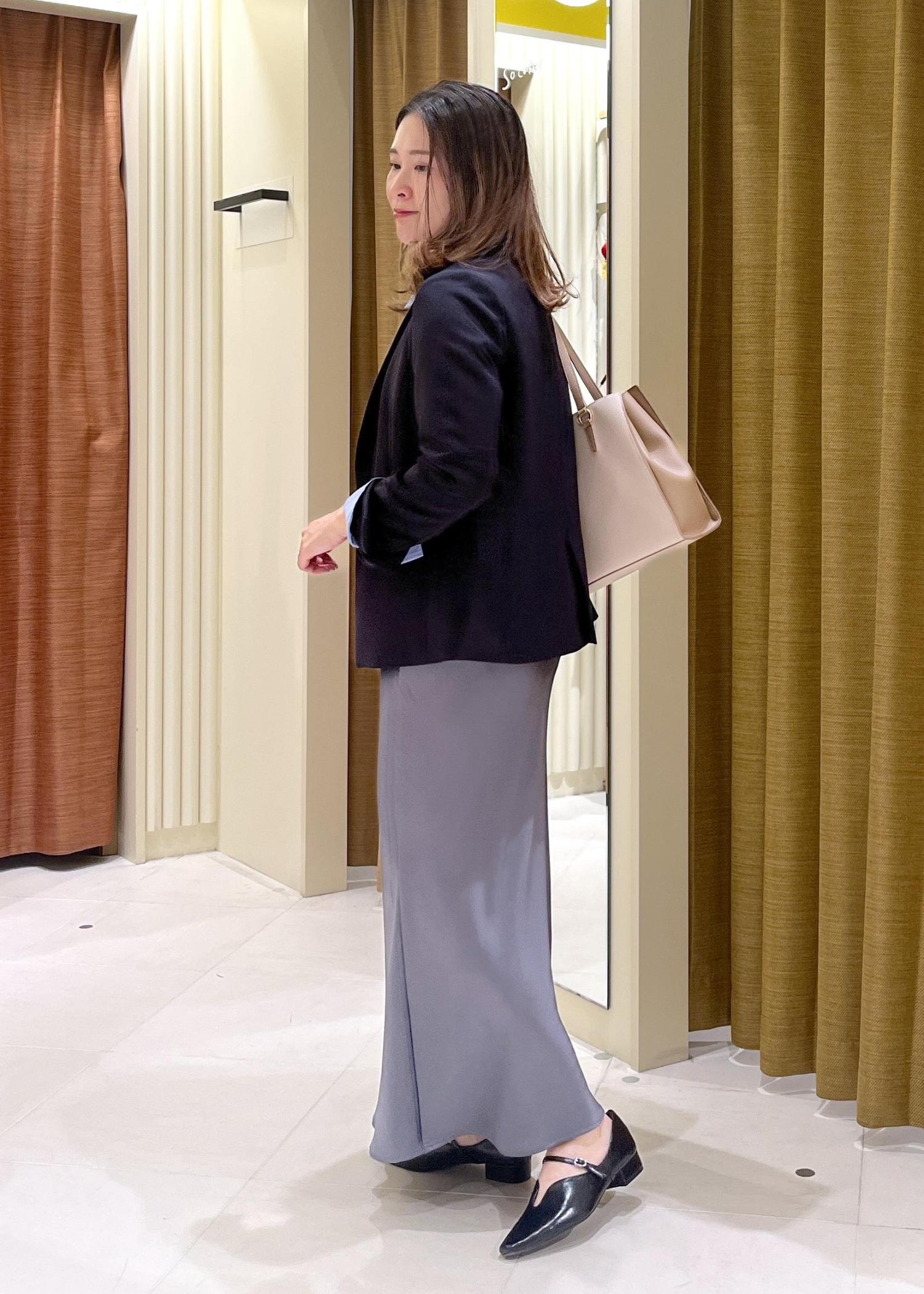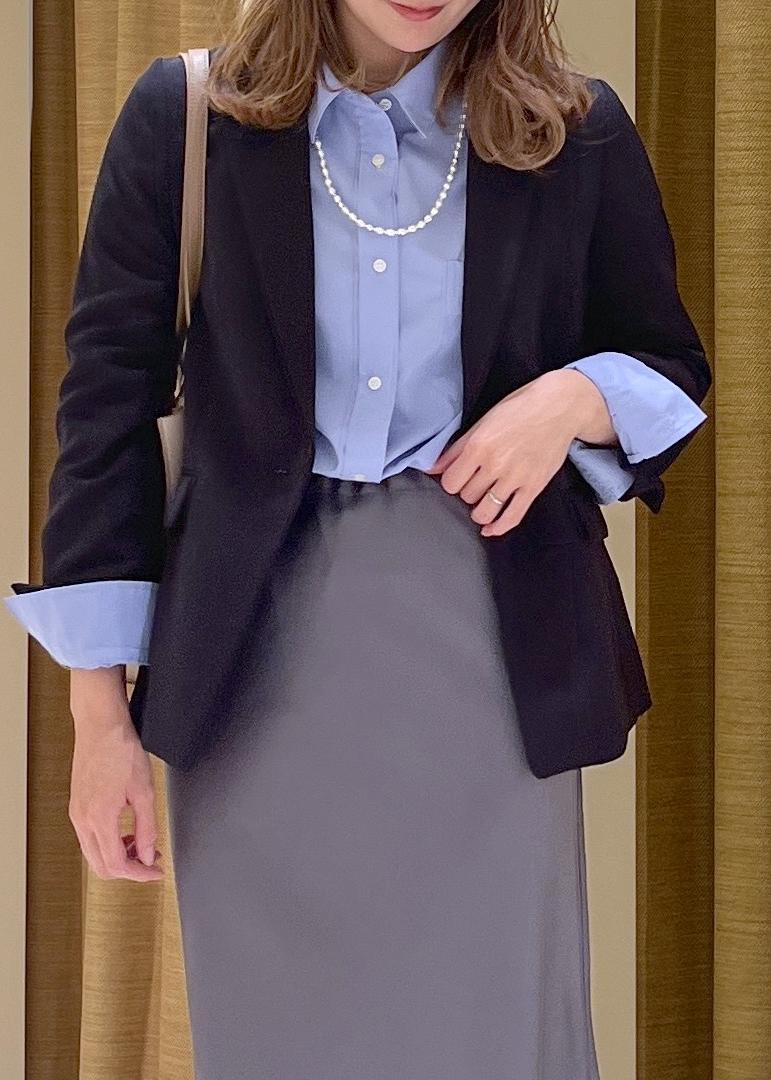 きっちりみえジャケットをセットアップではなくスカートで合わせ少しはずしたオフィスカジュアルスタイル。