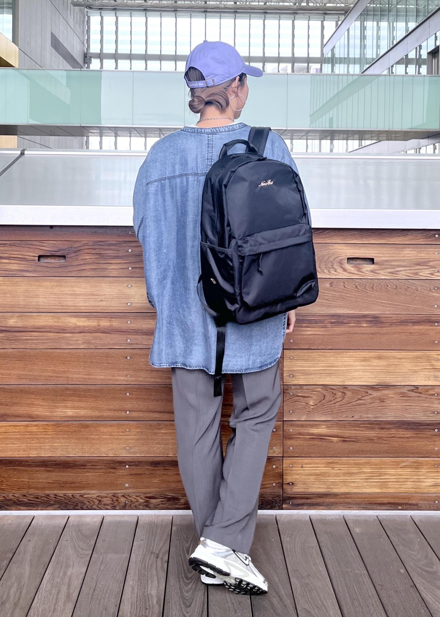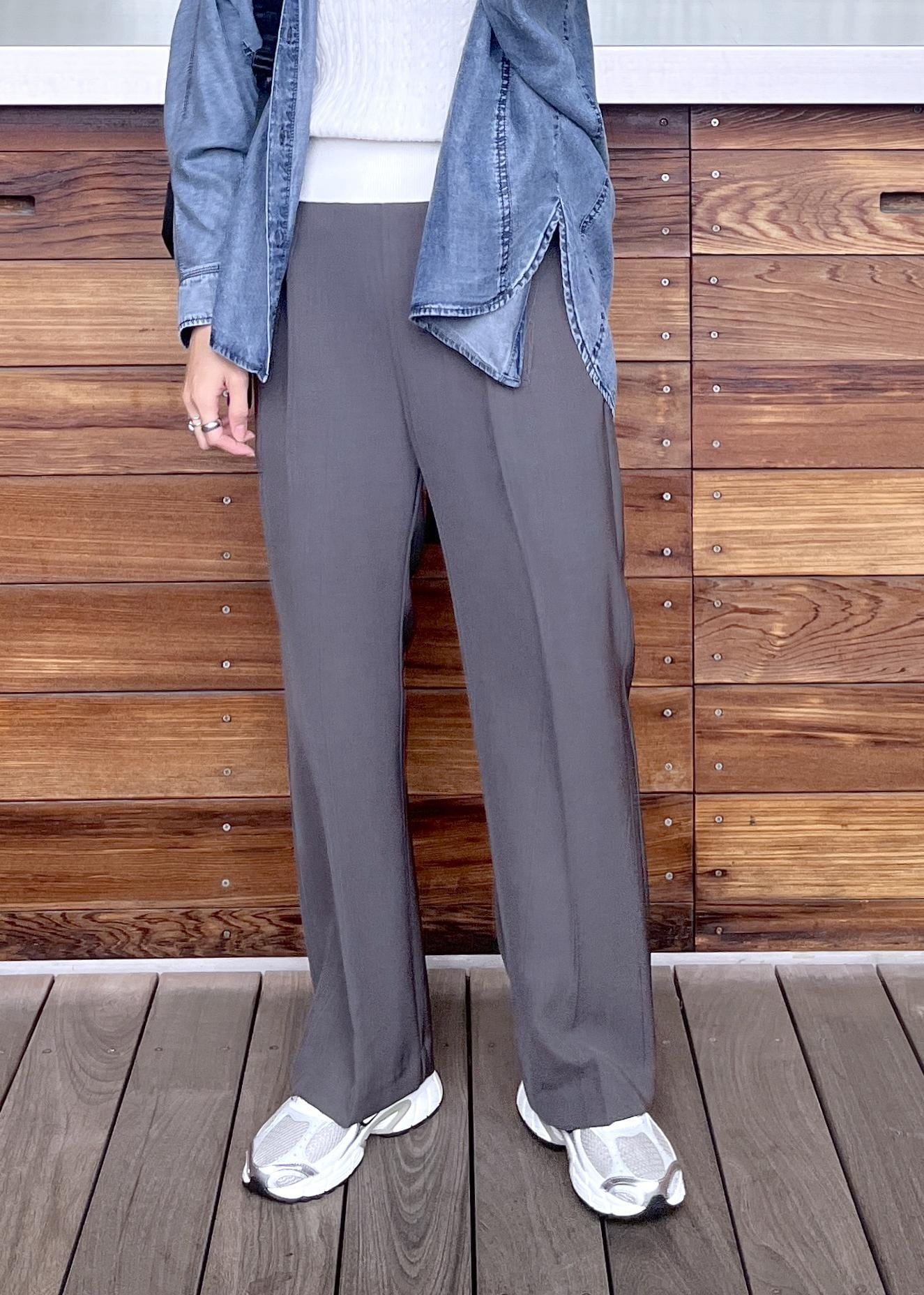 チャコールグレーのパンツとデニムシャツでカジュアルに合わせたスタイリング。