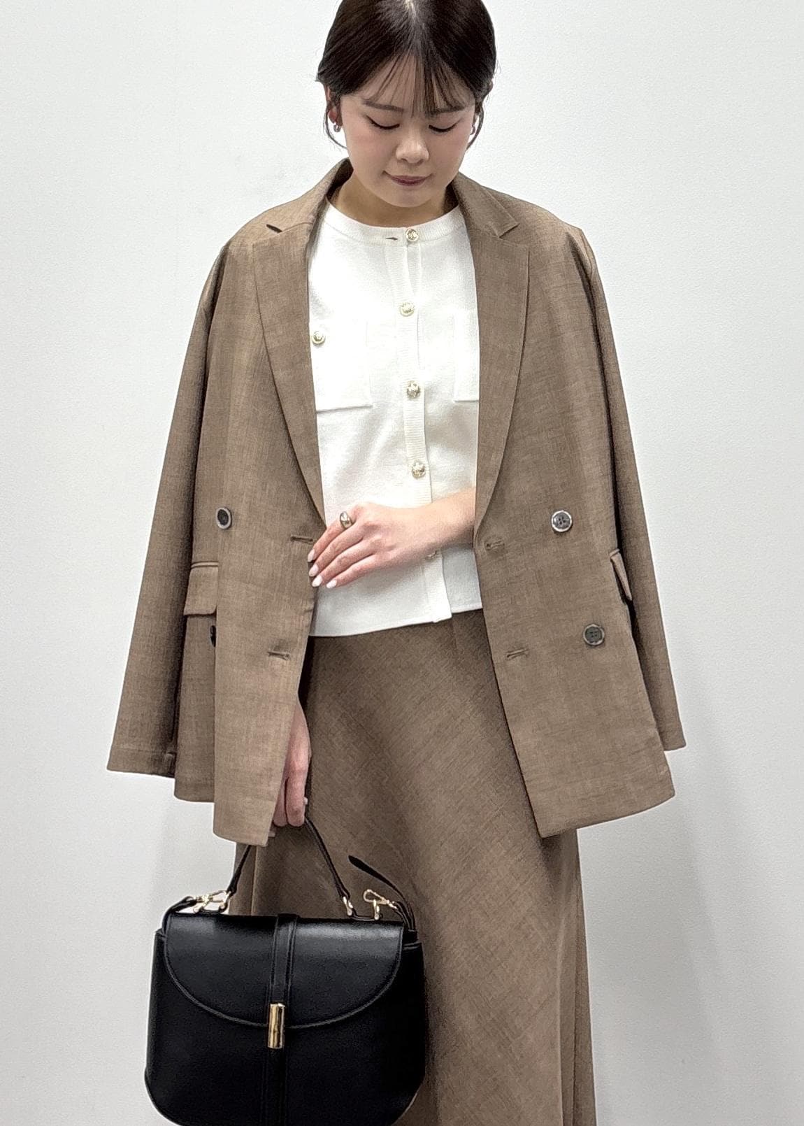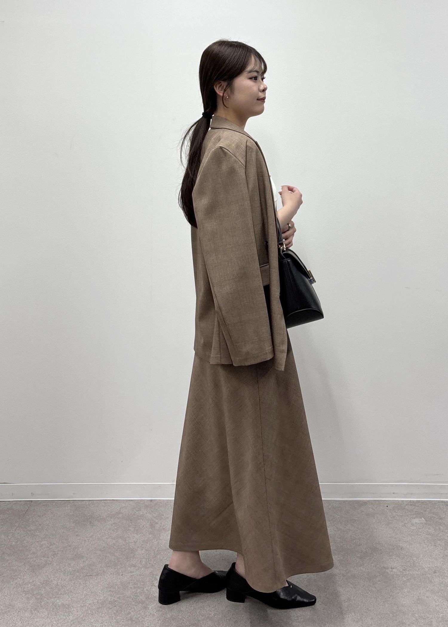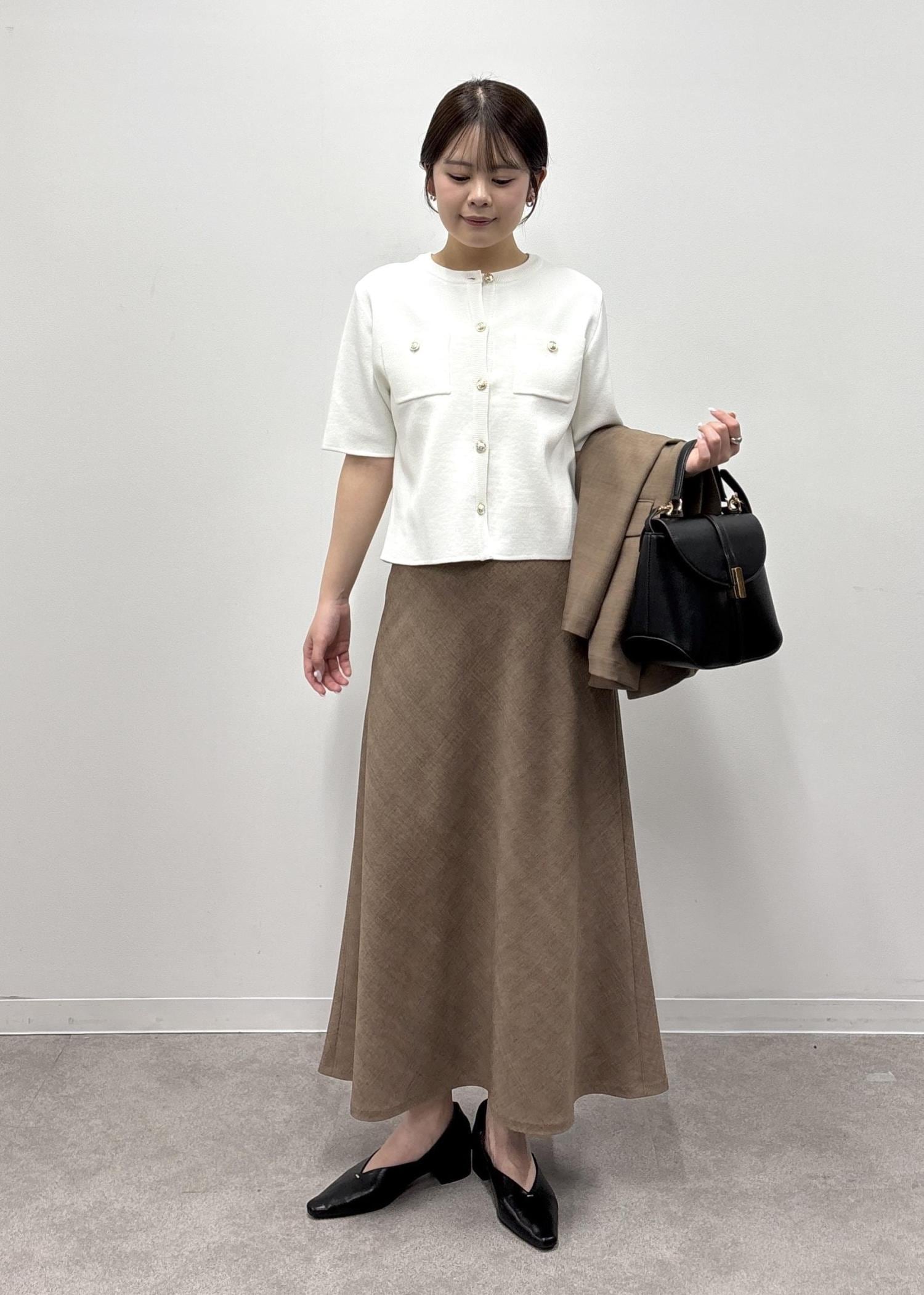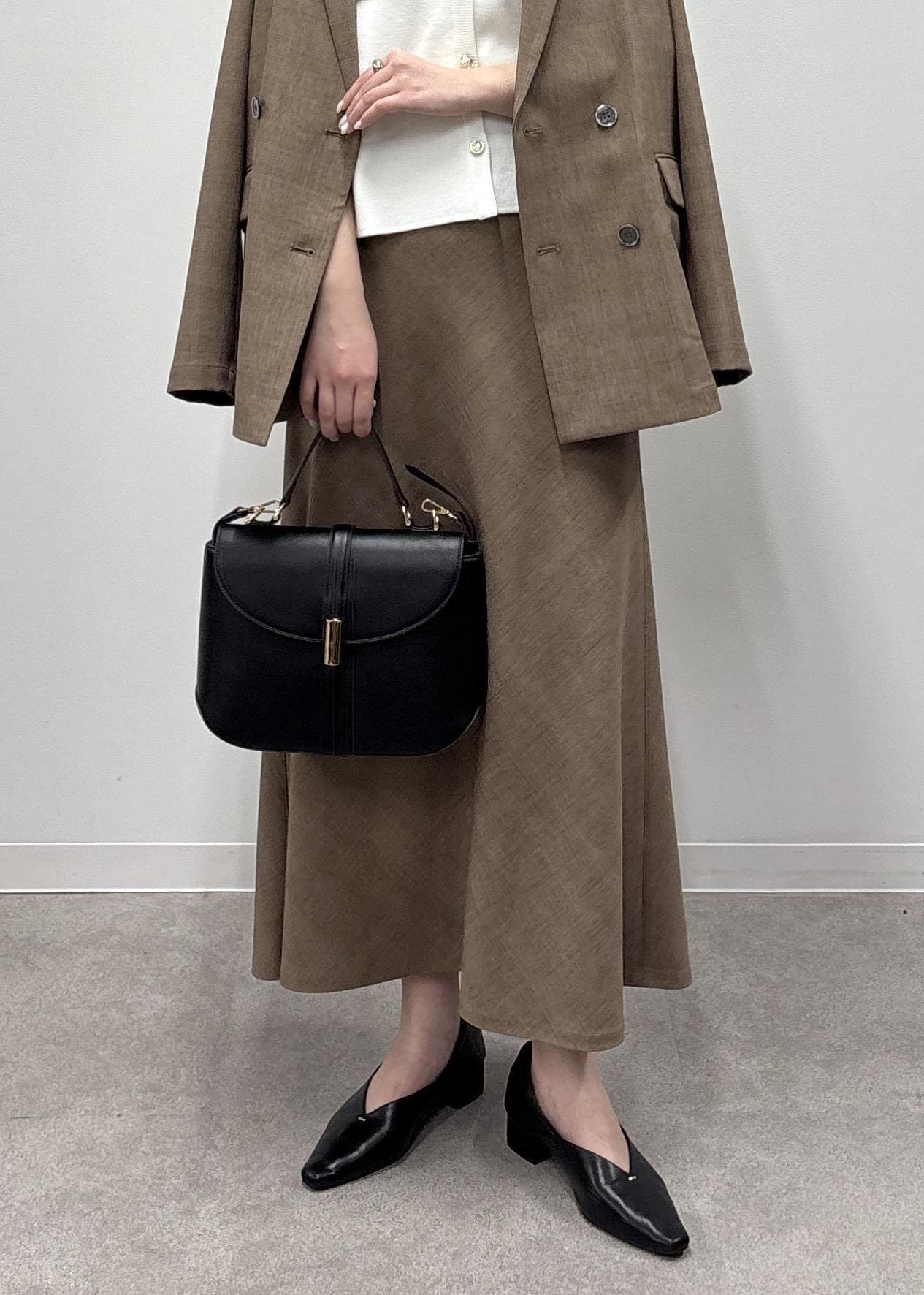 ややフォーマルなシーンにも上品な印象で着て行けるスカートセットアップ。今年らしいブラウンの上下に、他はモノトーンでまとめて綺麗めなスタイルにしました。