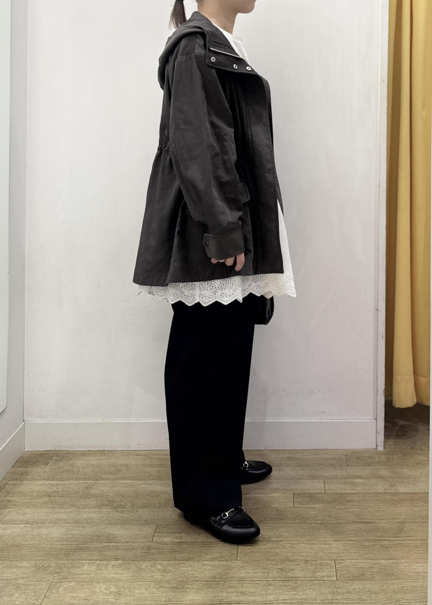 ウエスト内側にスピンドルコード付きでお好みでウエストを絞ることができるので、コーディネートに合わせて調整するのがオススメ。