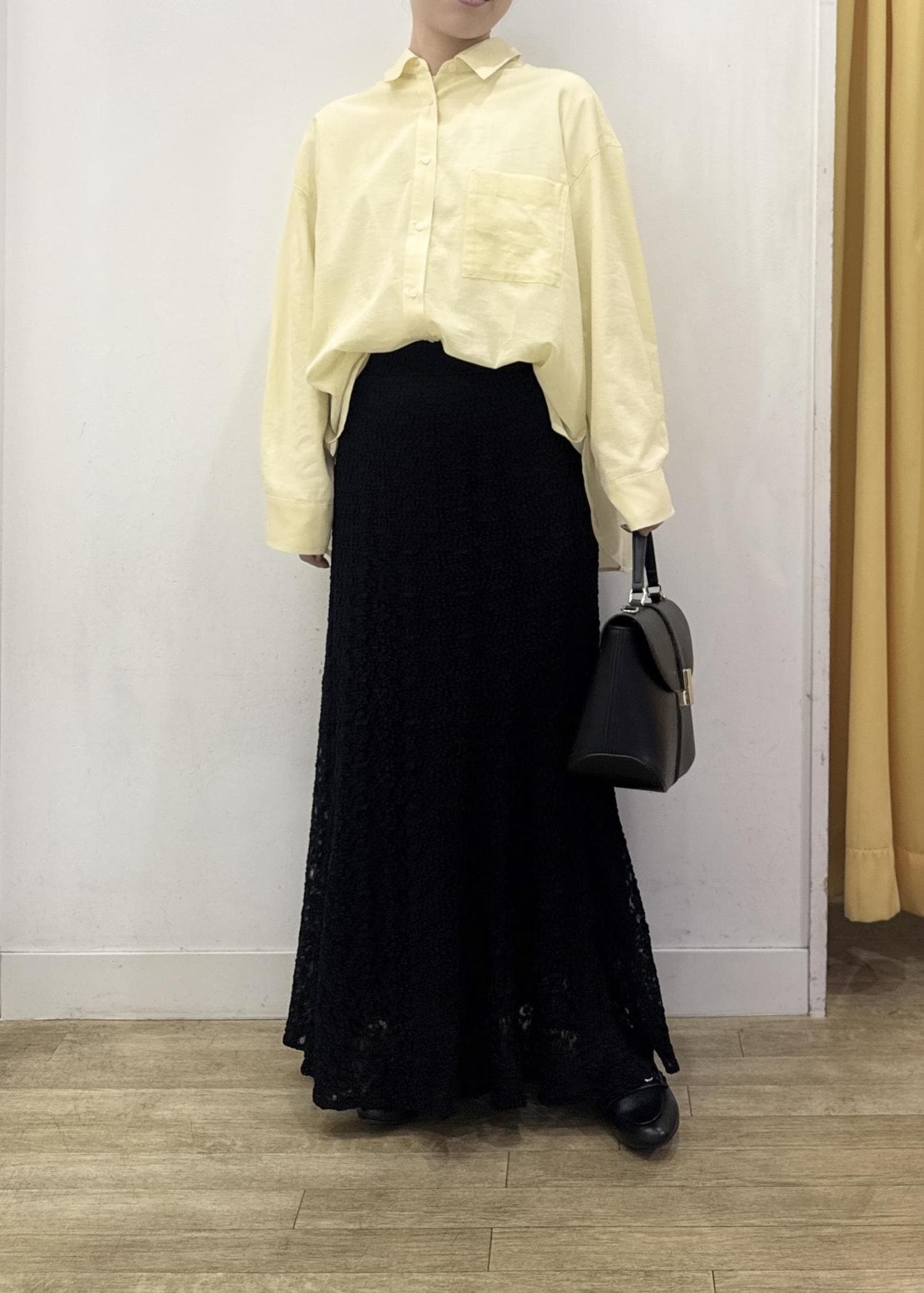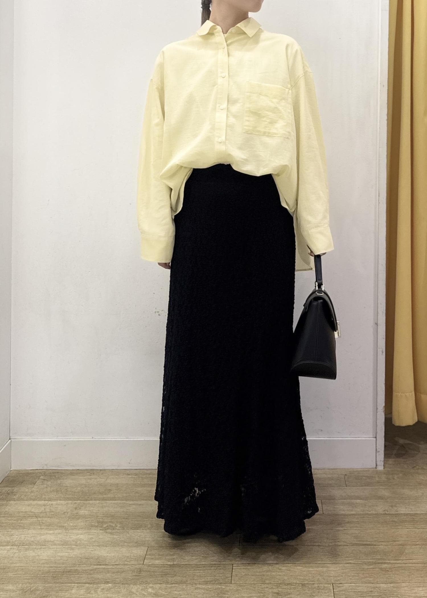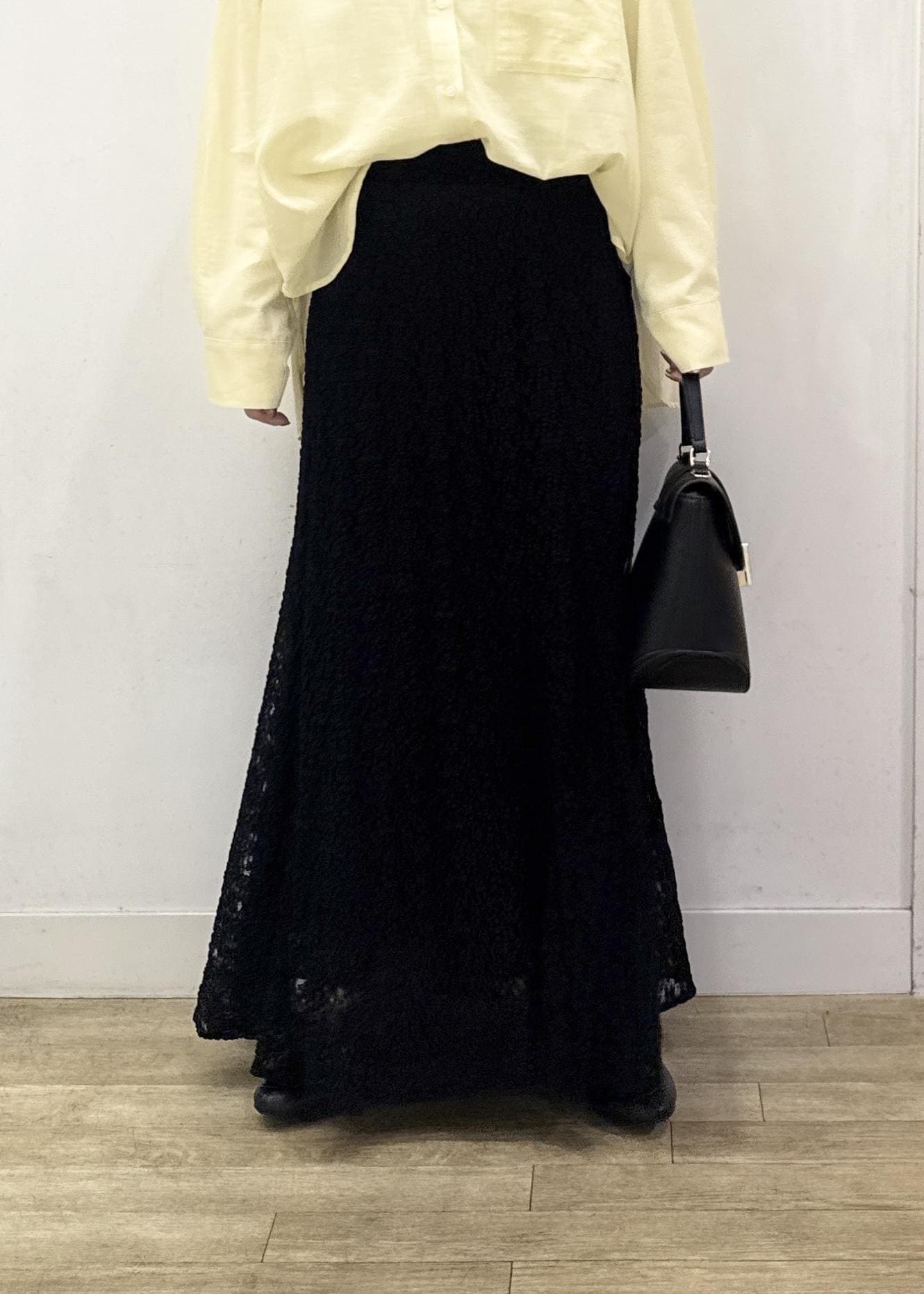 マーメイドシルエットなので、ヒップラインは少しフィット感があり裾のフレア感とのメリハリのあるキレイなラインで穿けます。 -
