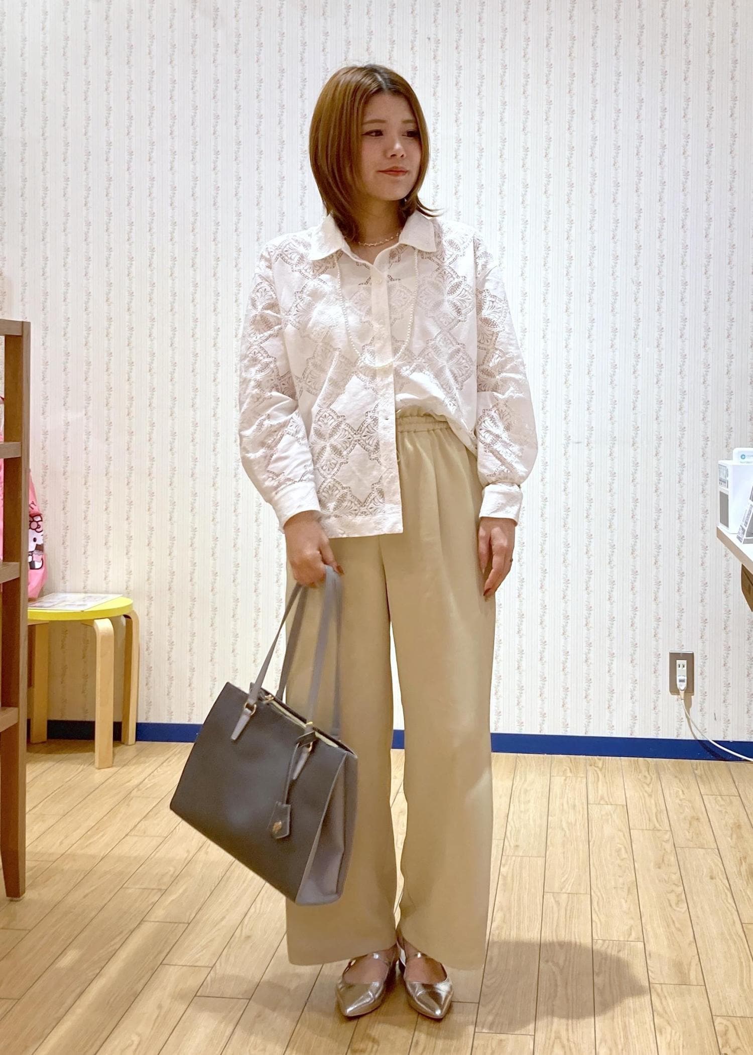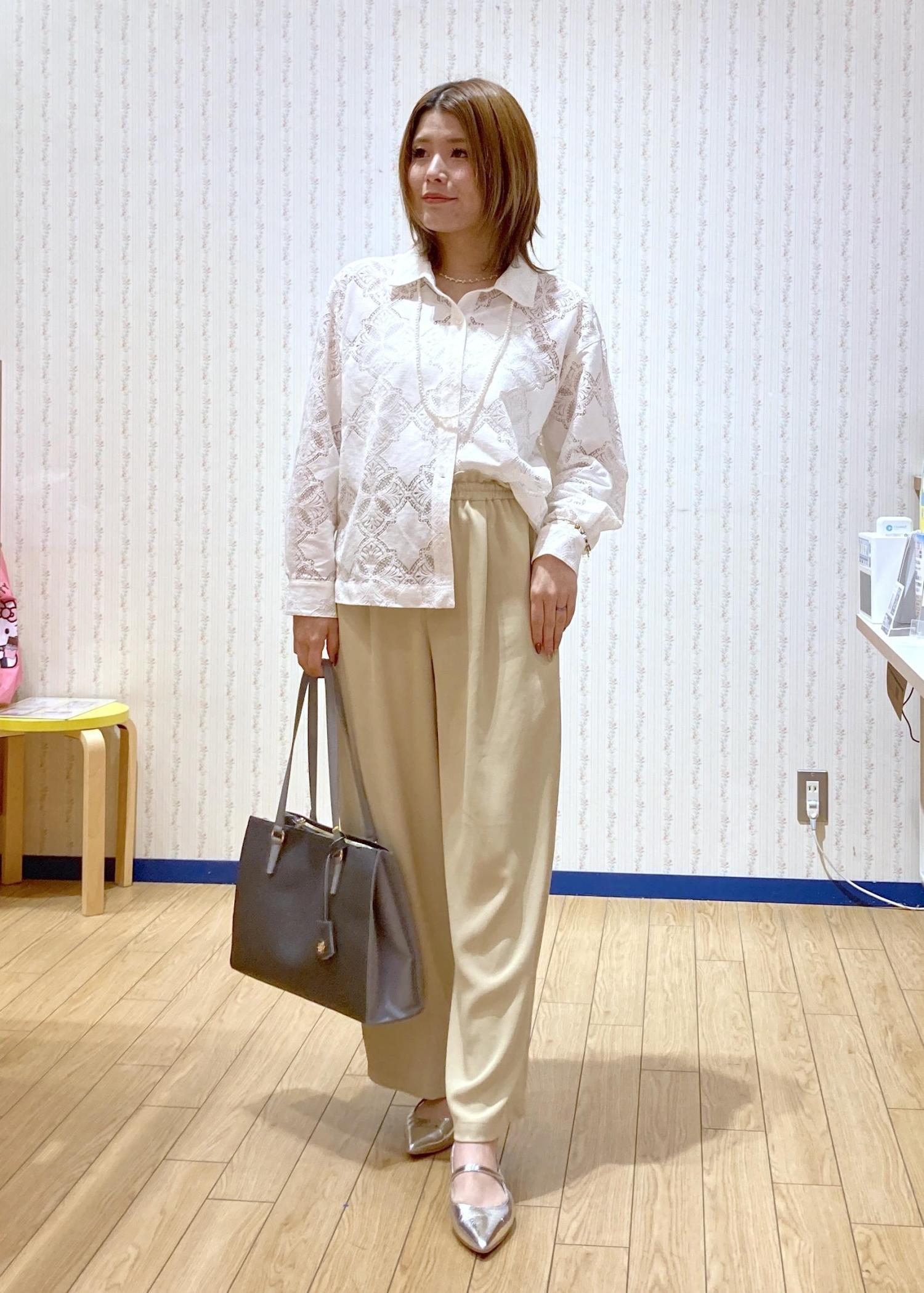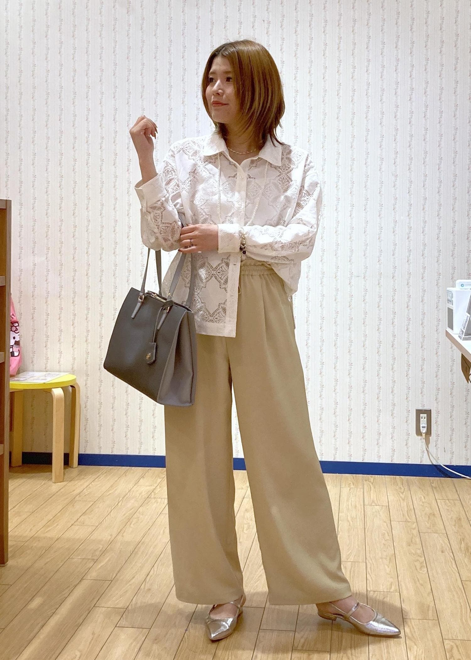 レースの程よい透け感がトレンド感をプラスし、動きやすいワイドパンツを合わせて着心地抜群なのにオシャレ見えするコーディネートを組みました!