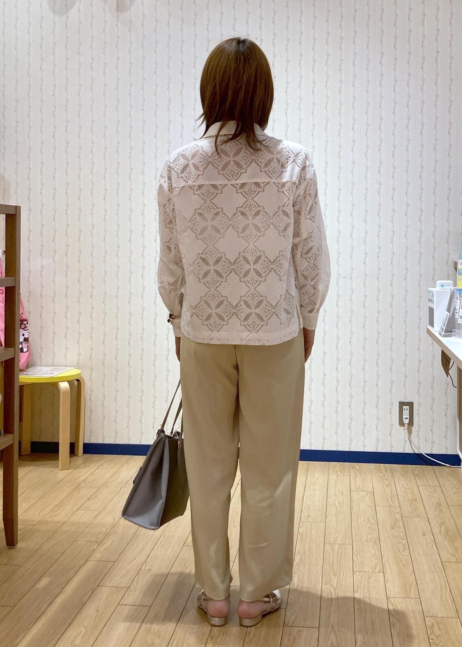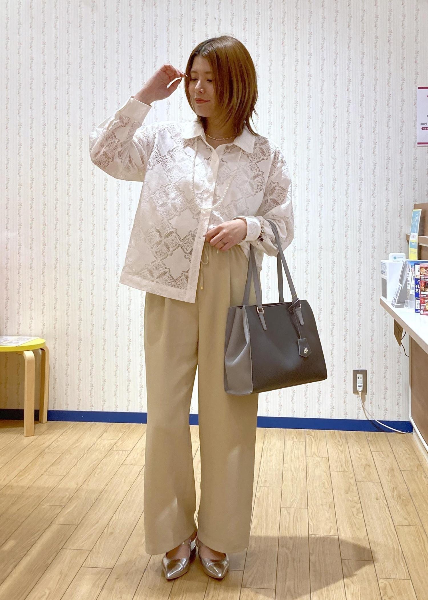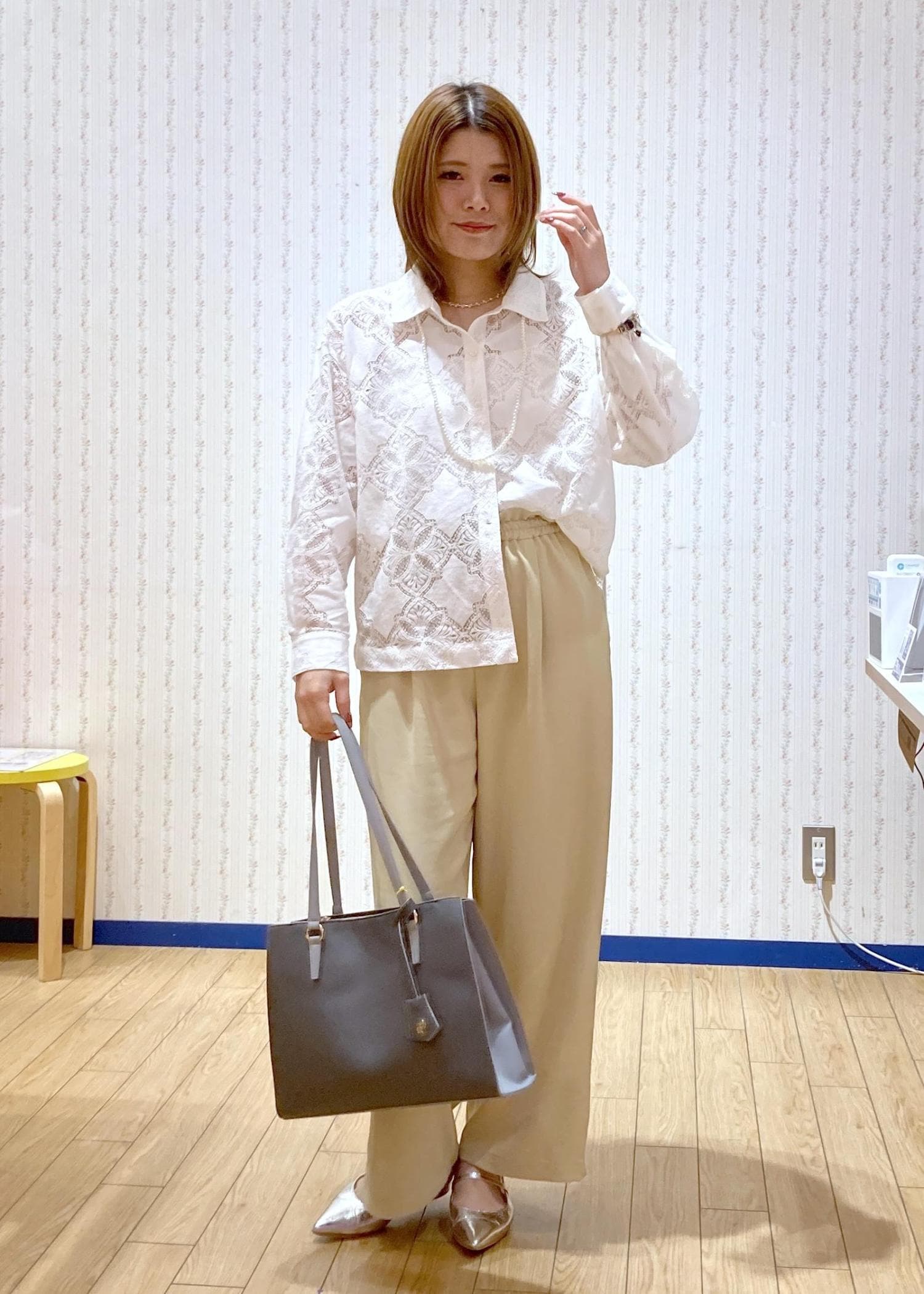 レースの程よい透け感がトレンド感をプラスし、動きやすいワイドパンツを合わせて着心地抜群なのにオシャレ見えするコーディネートを組みました!