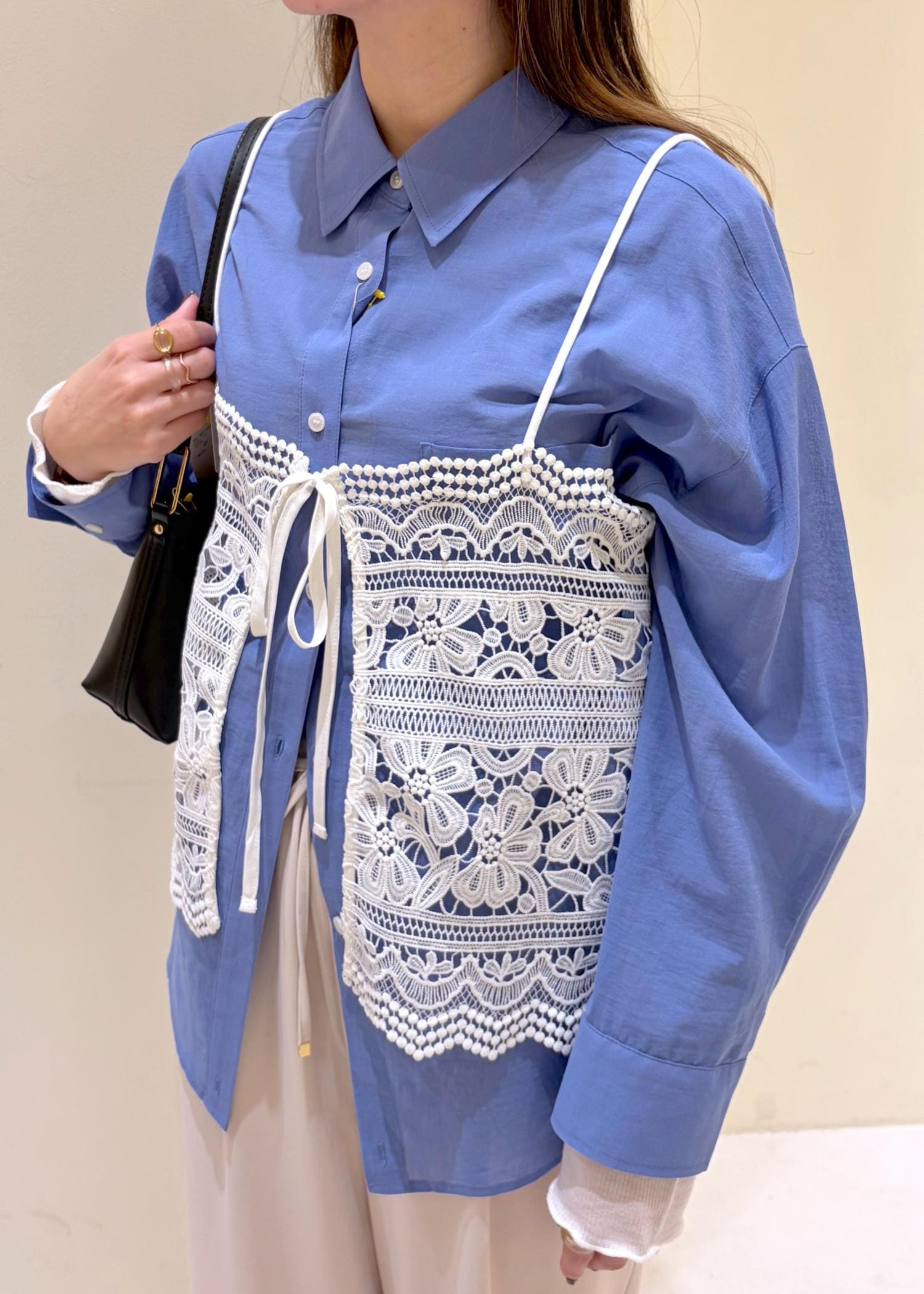 シンプルなレギュラーシャツをレイヤードアレンジ。