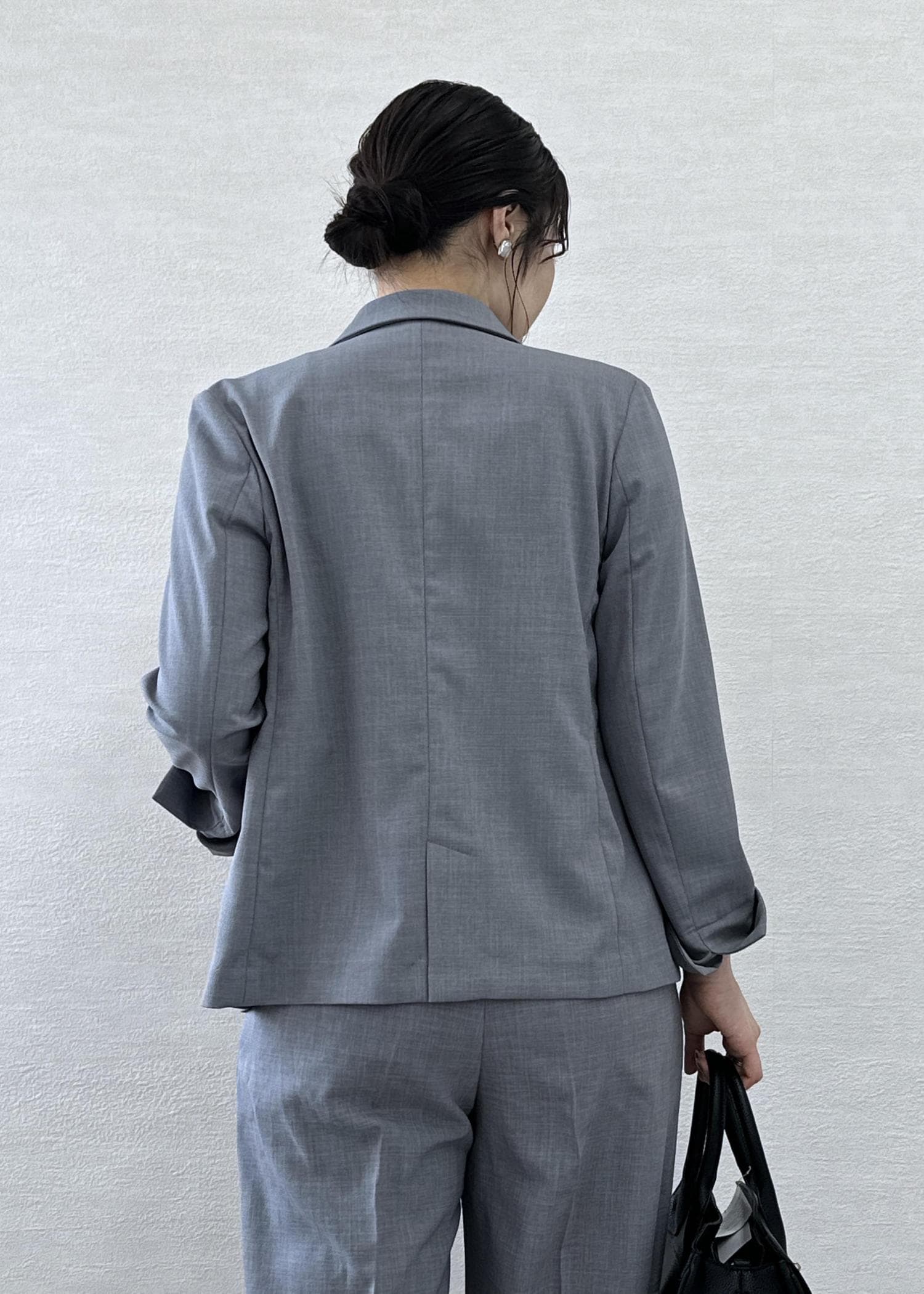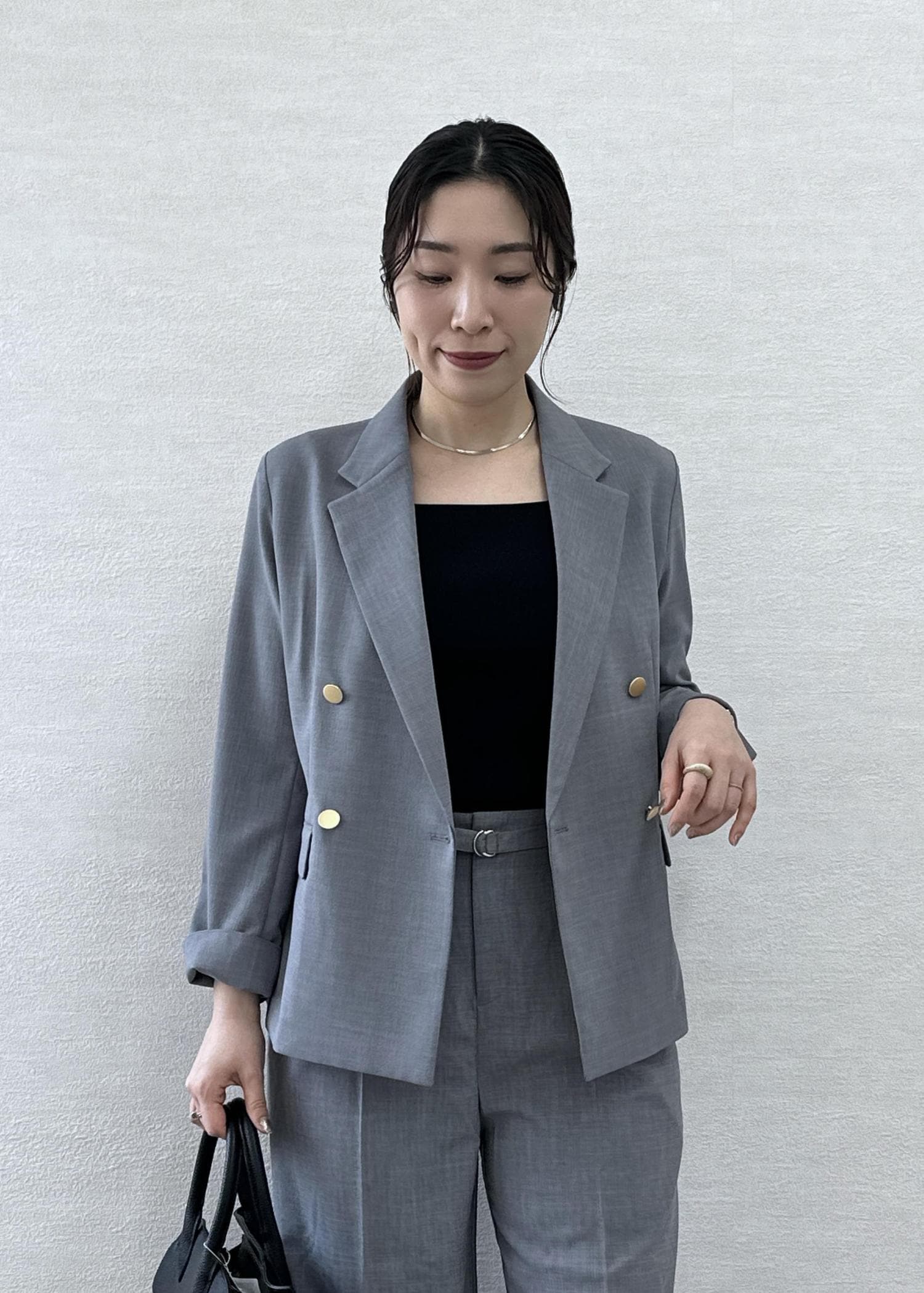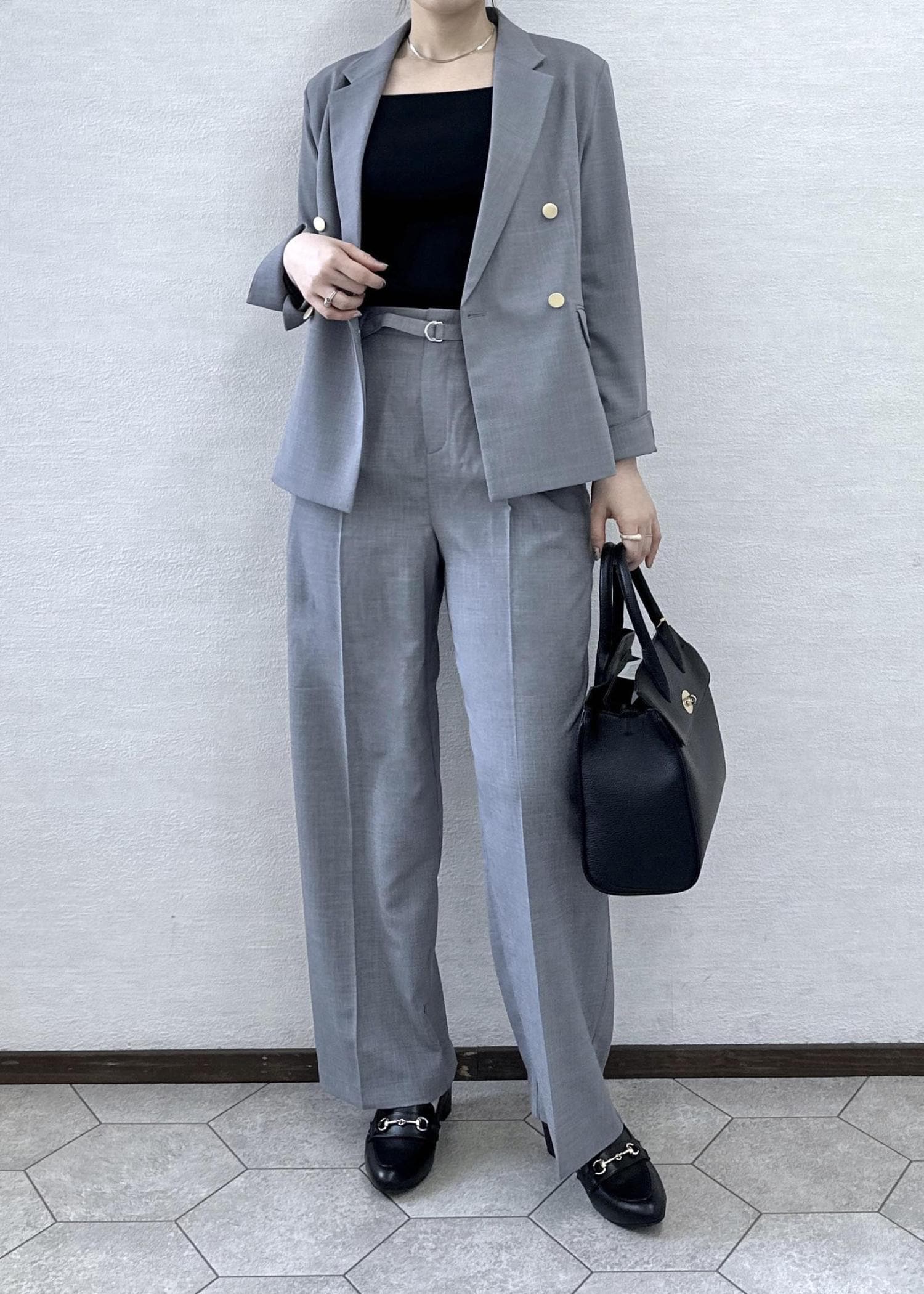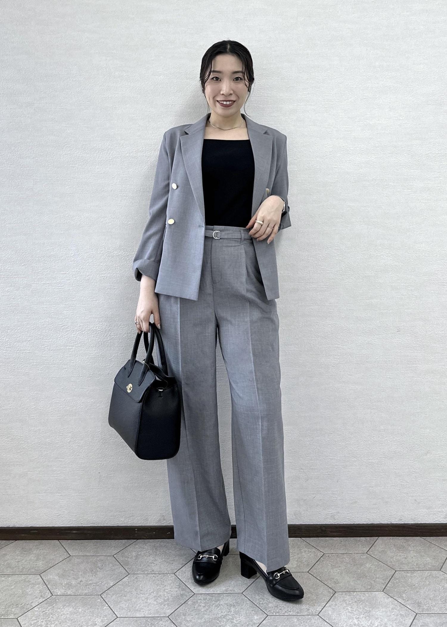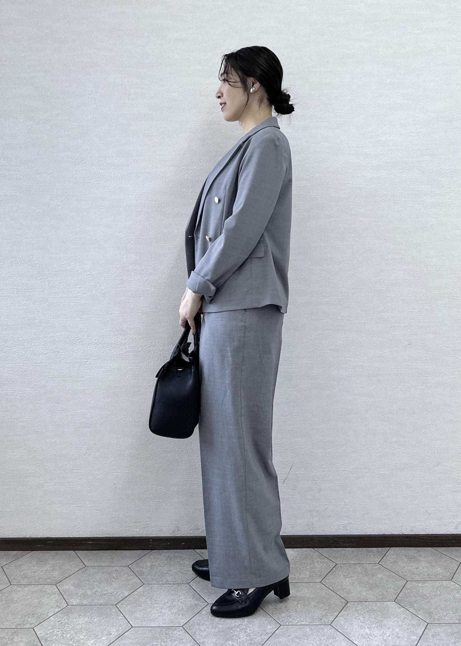 落ち着いたグレーなのでインナーや小物はブラックでまとめて大人っぽく仕上げました。