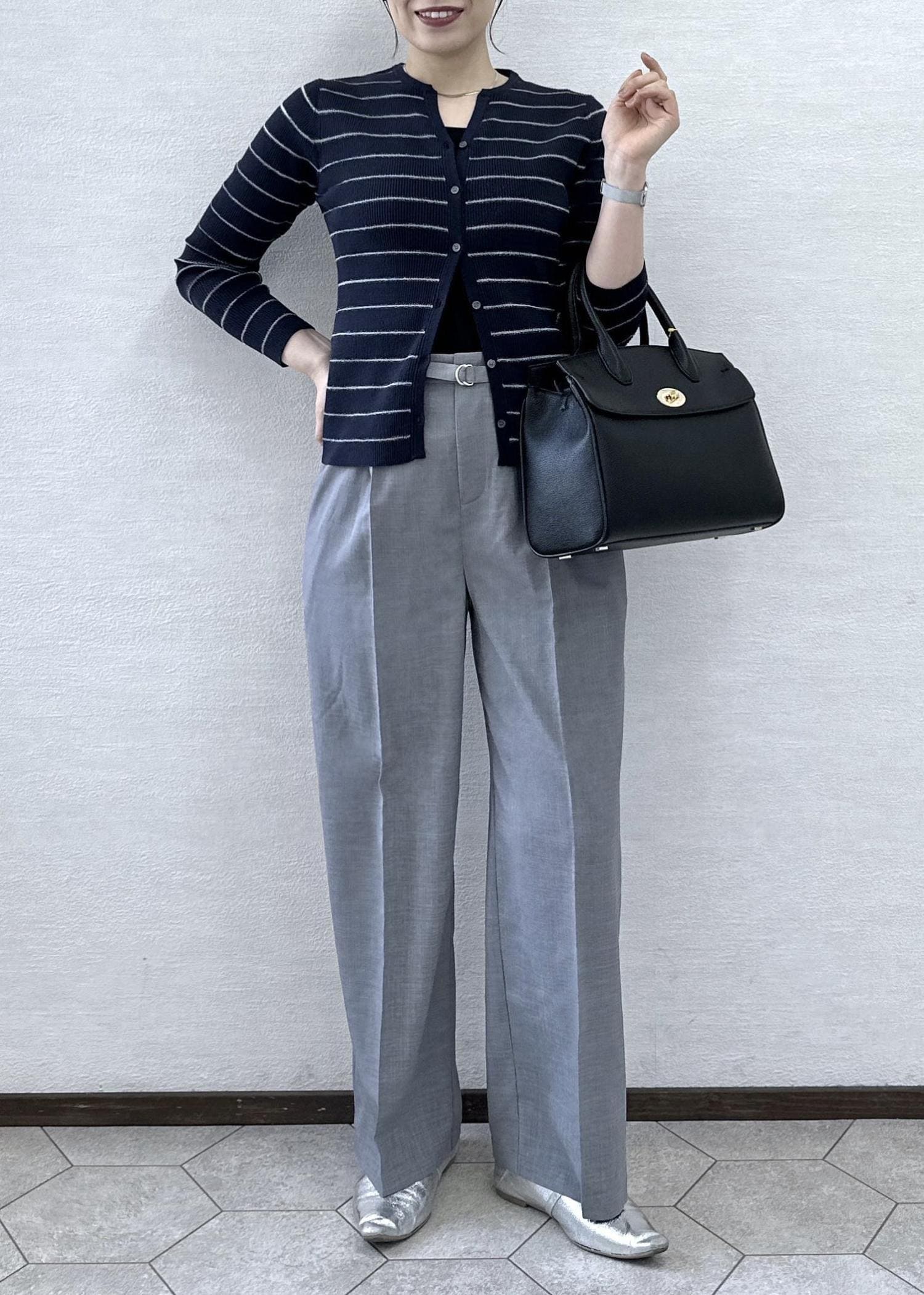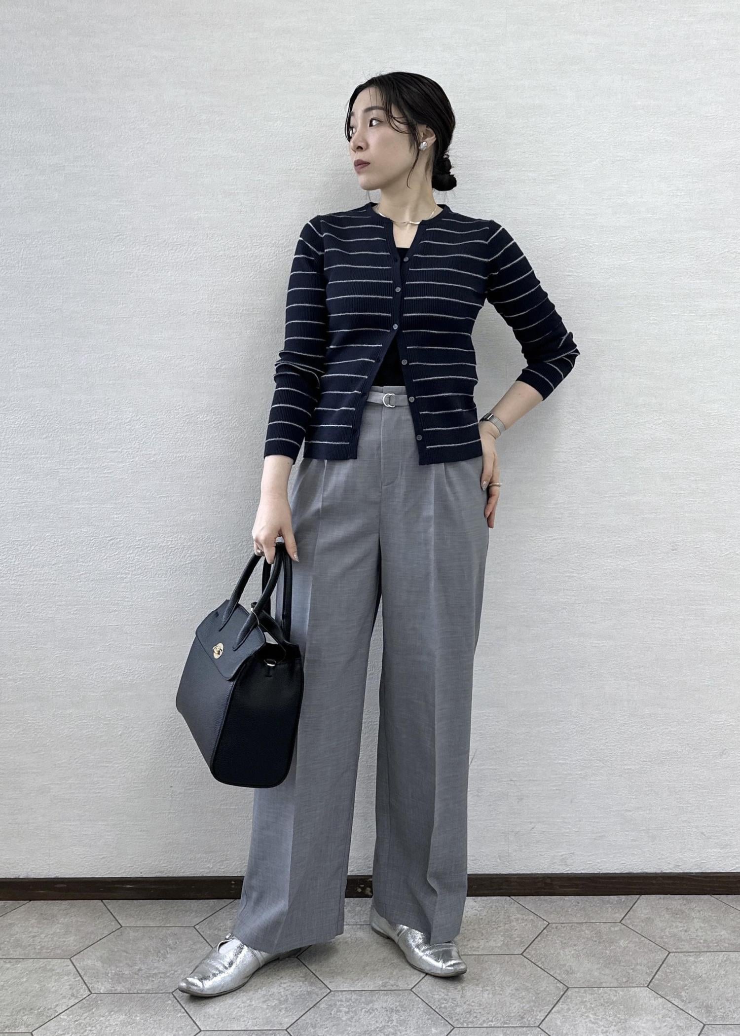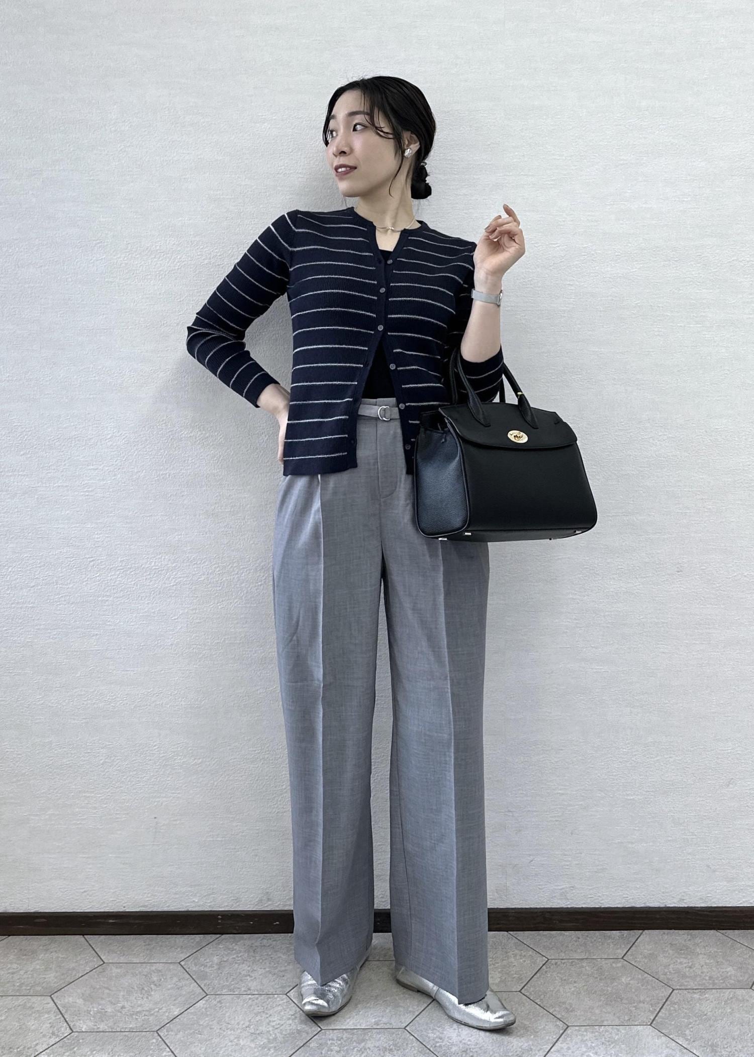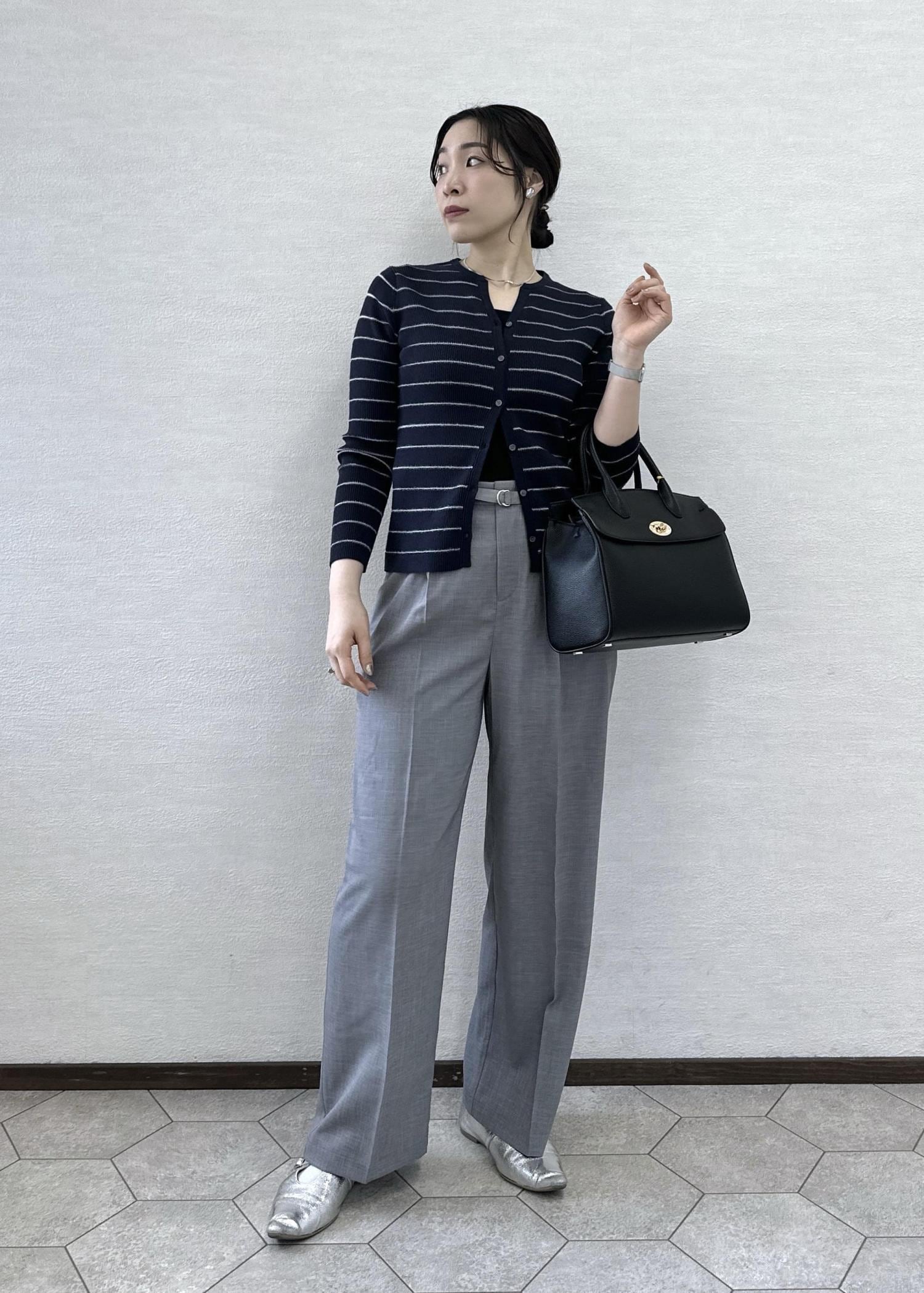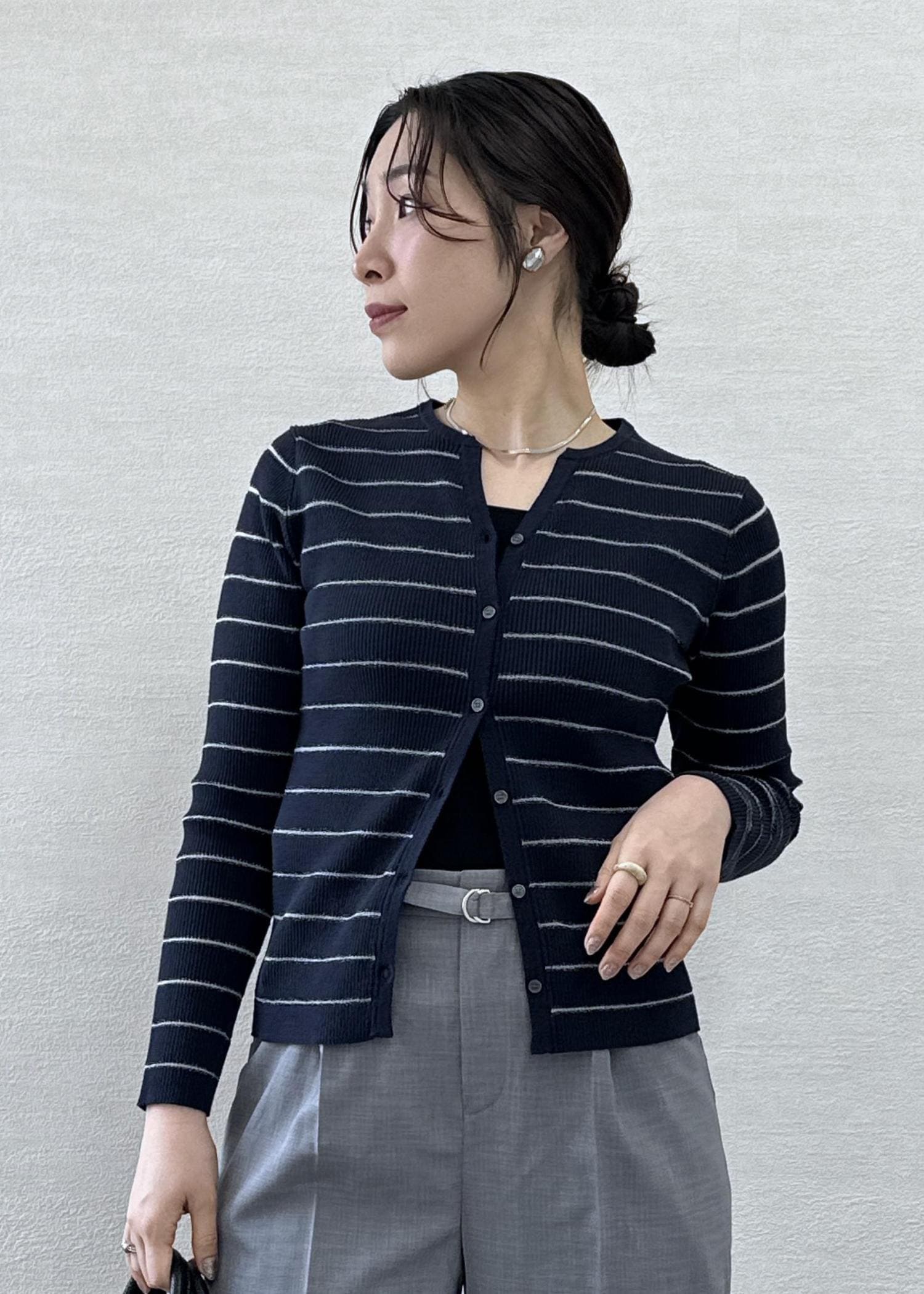 カーディガンのボタンは上下少しずつ開けて抜け感を出しました。