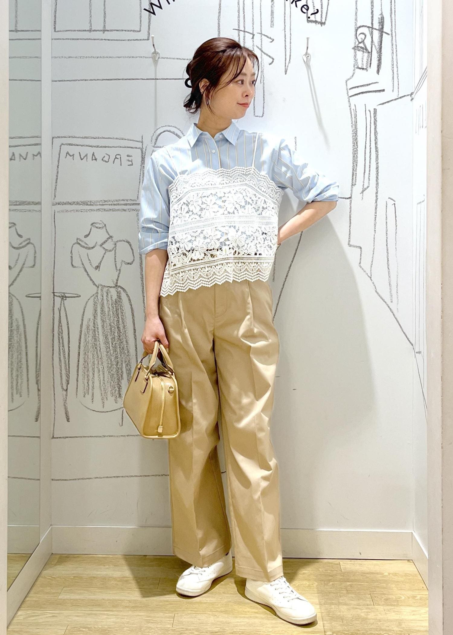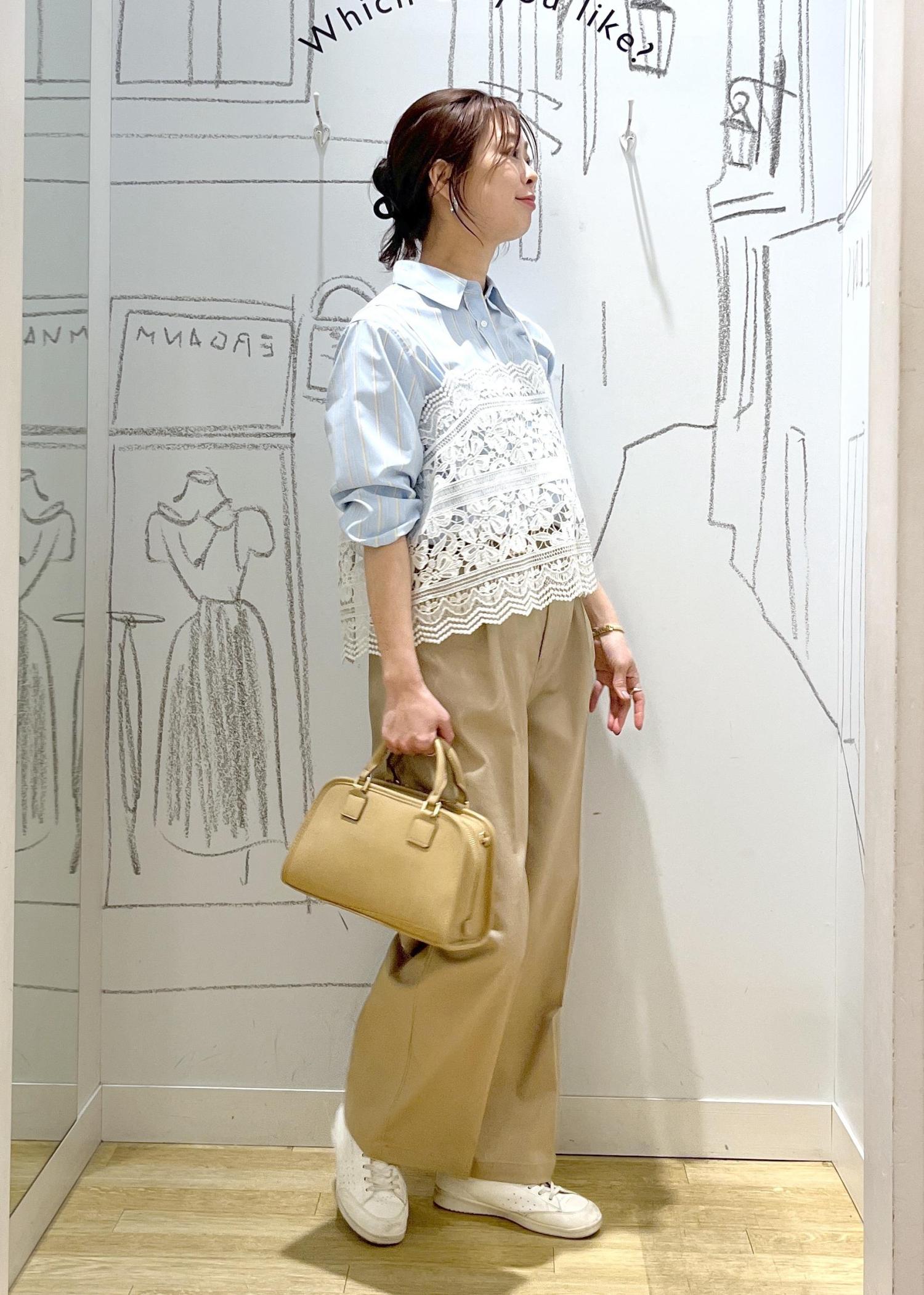 レースビスチェを重ねて、きれいめカジュアルにほんのり甘さをプラス。
