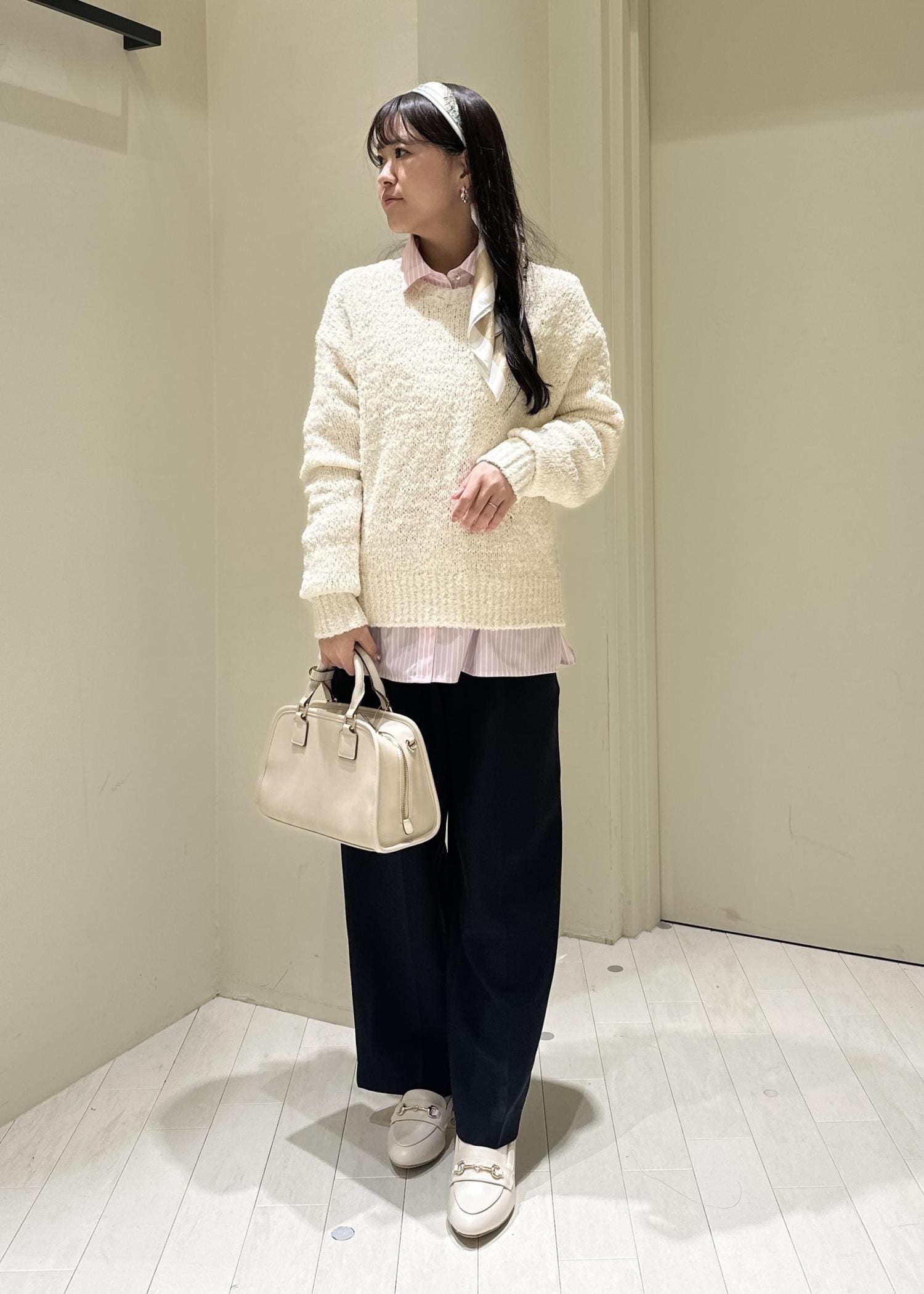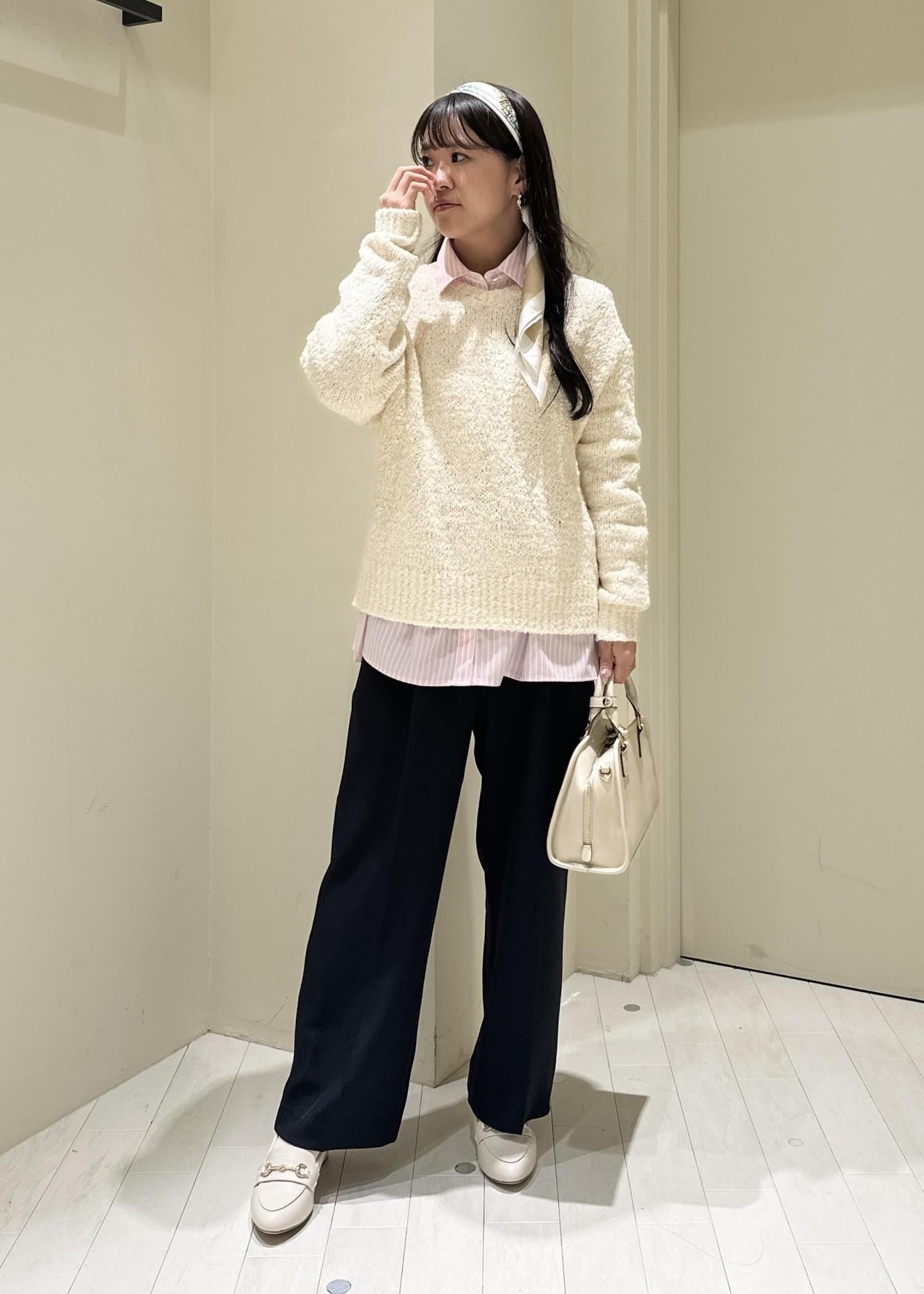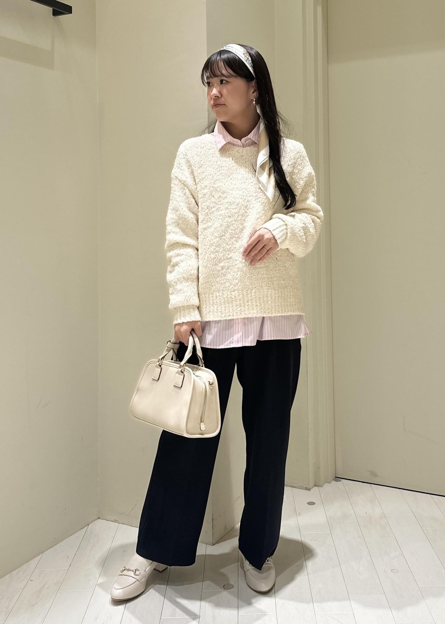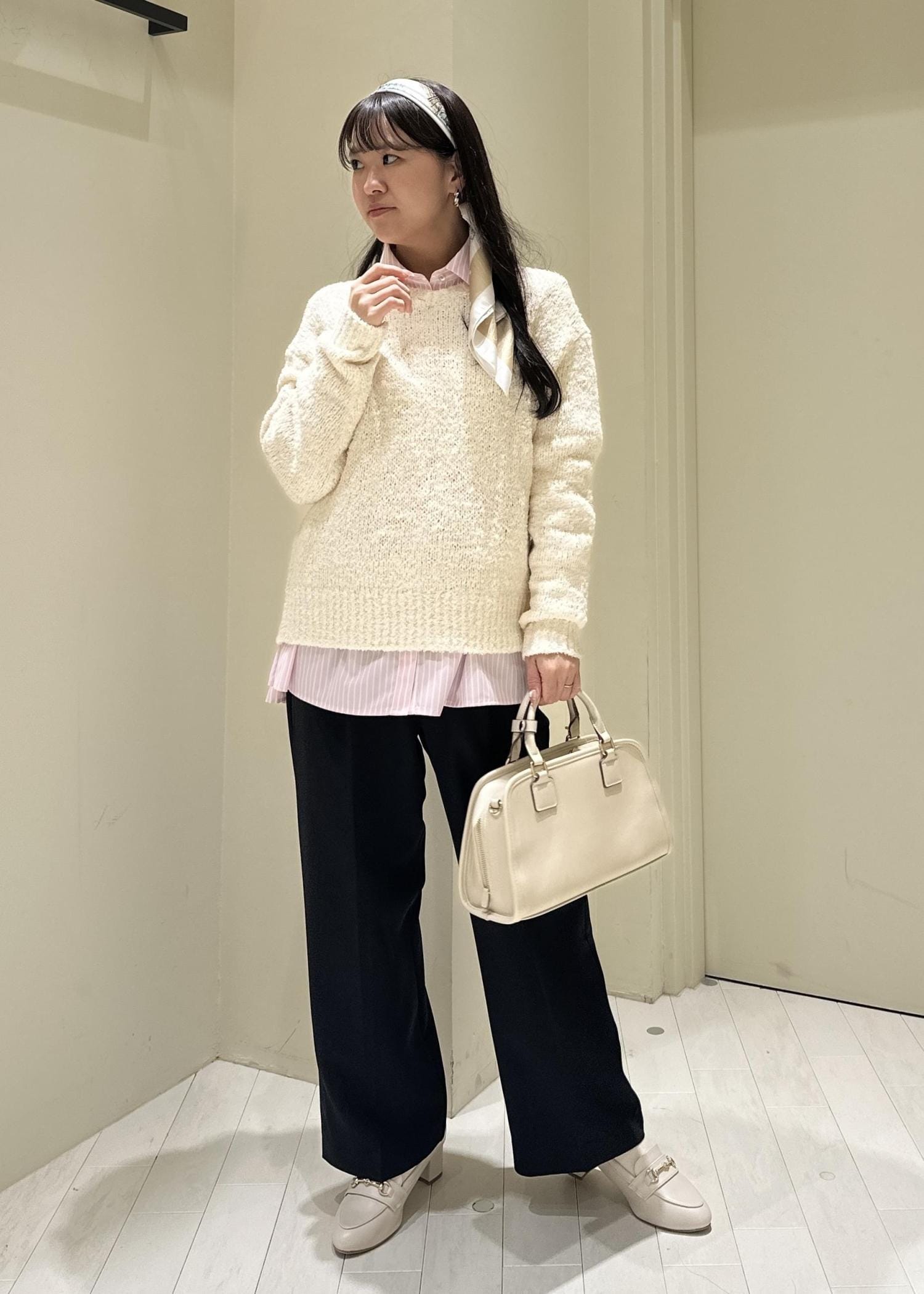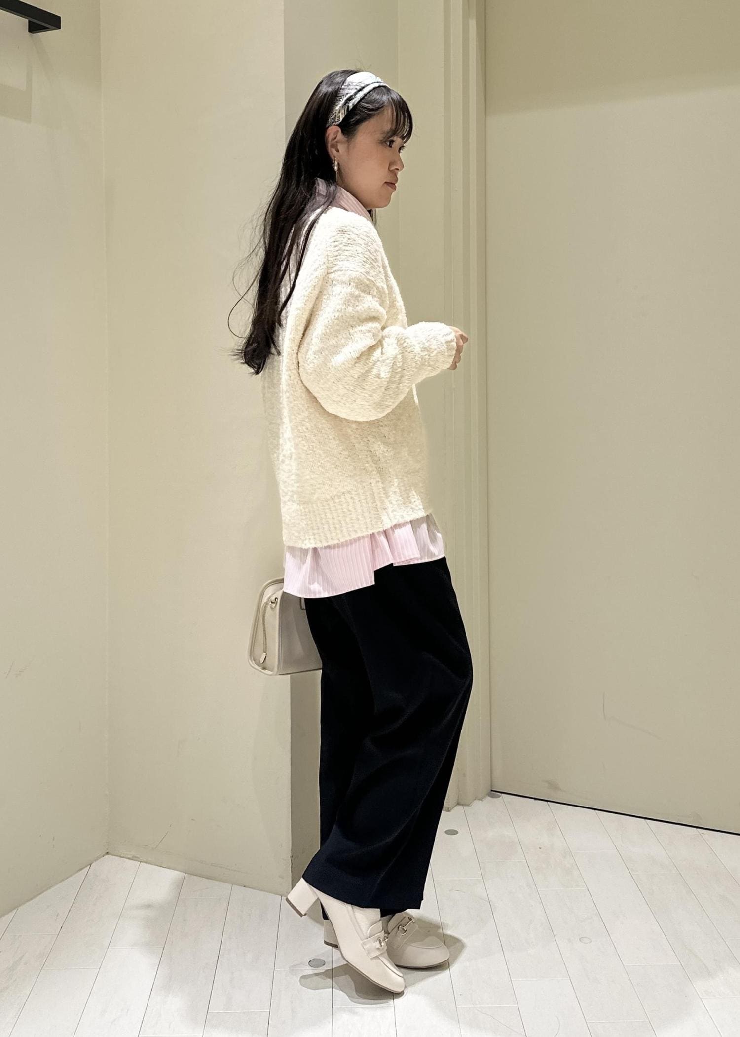 白ニットにピンクのペプラムシャツを合わせ、まだ冷え込むこの時期にピッタリな春カラーを取り入れたコーデを組んでみました!