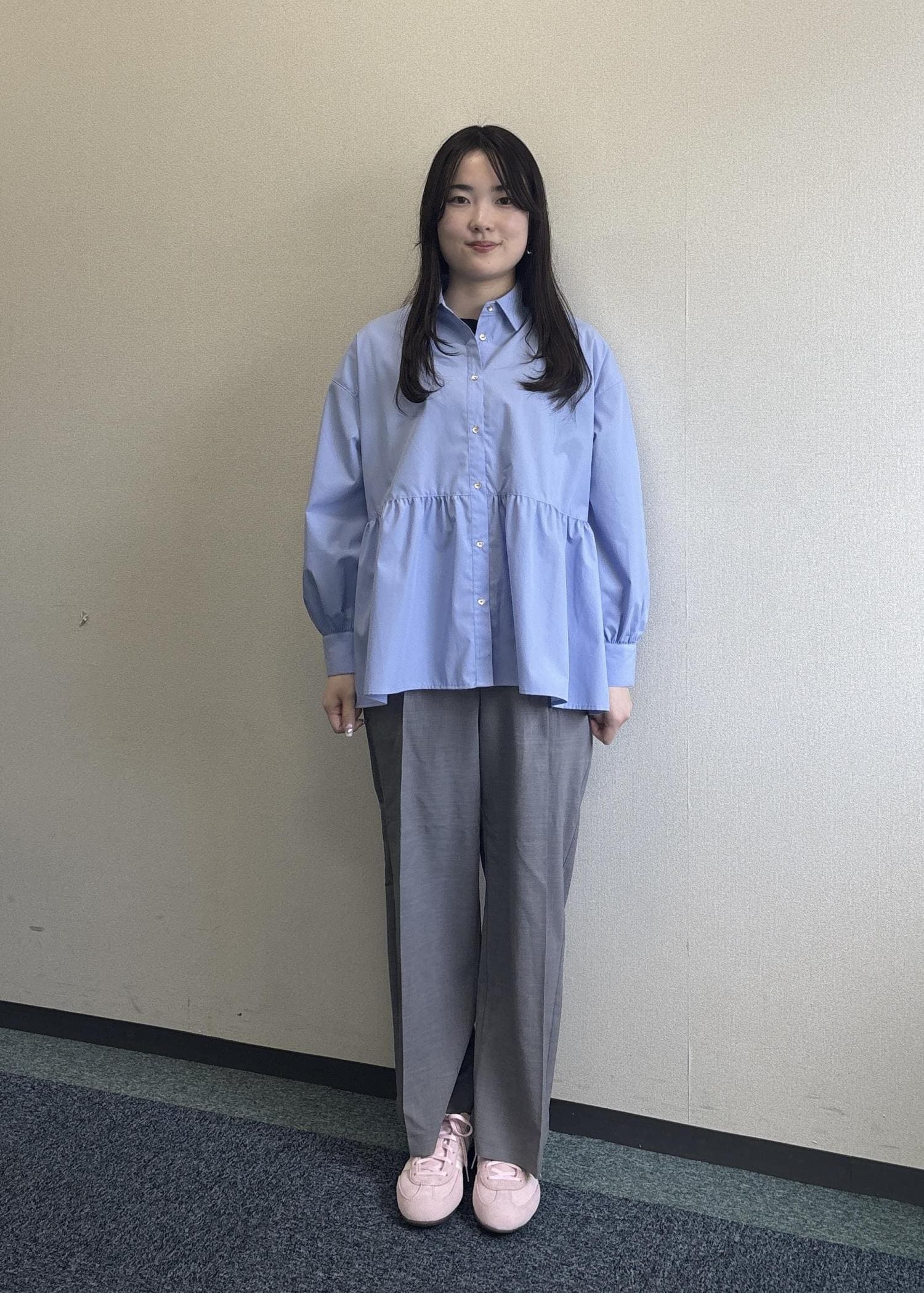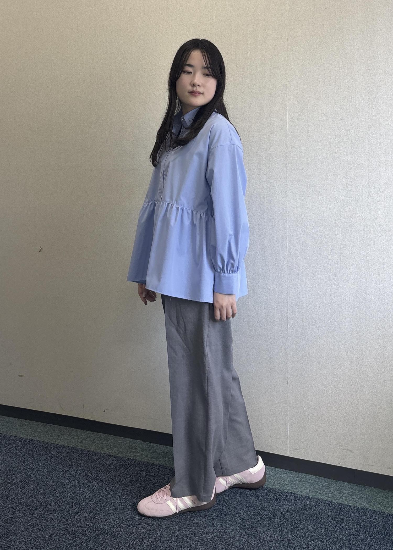 1枚で着映えするペプラムシャツに、パステル調なブルー色が登場。
