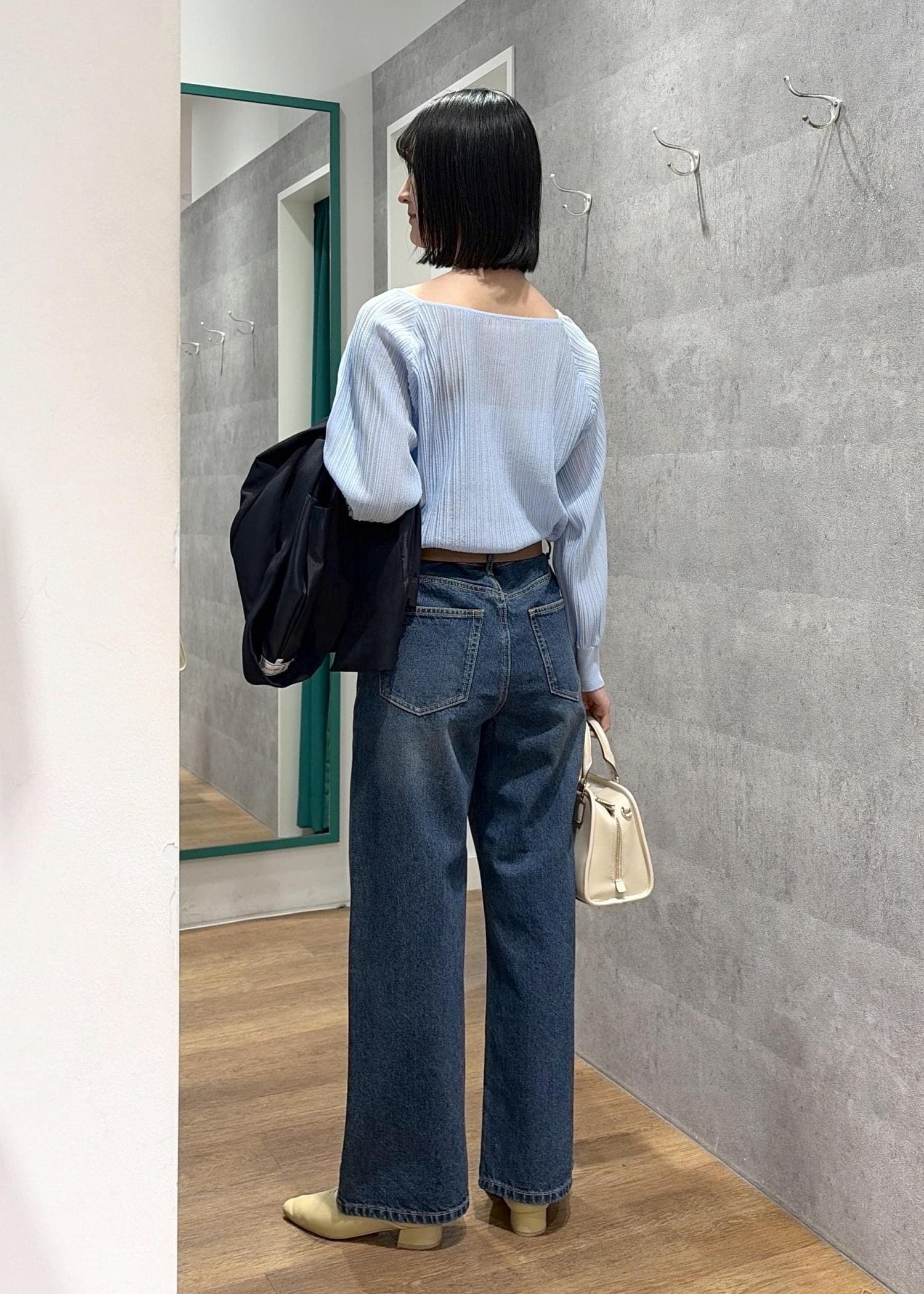 さらっとした生地感とすっきりしたサイズ感です。 -