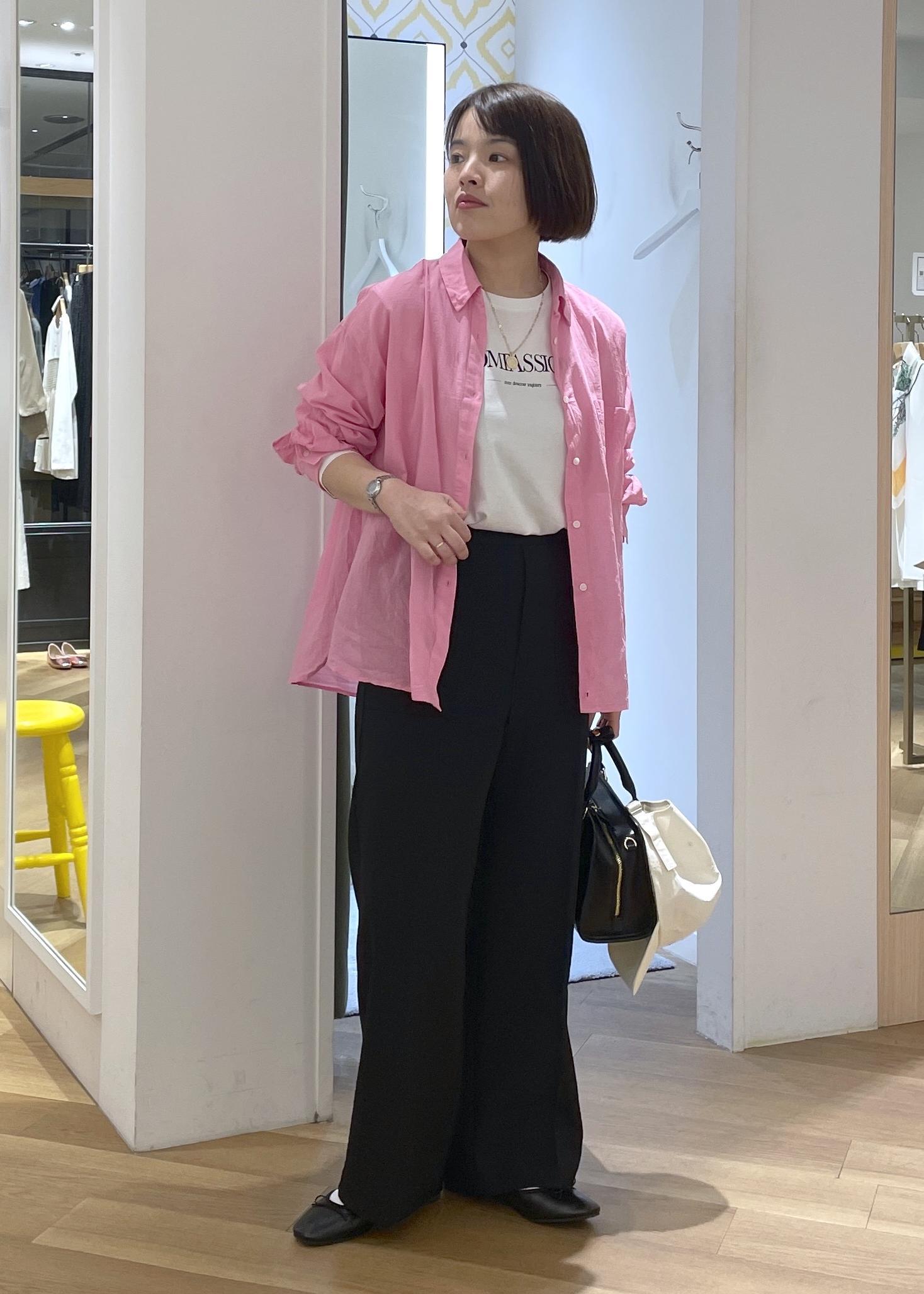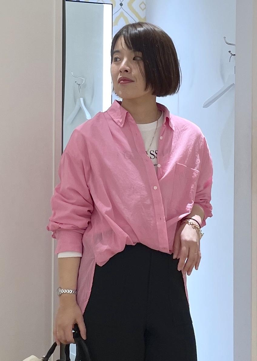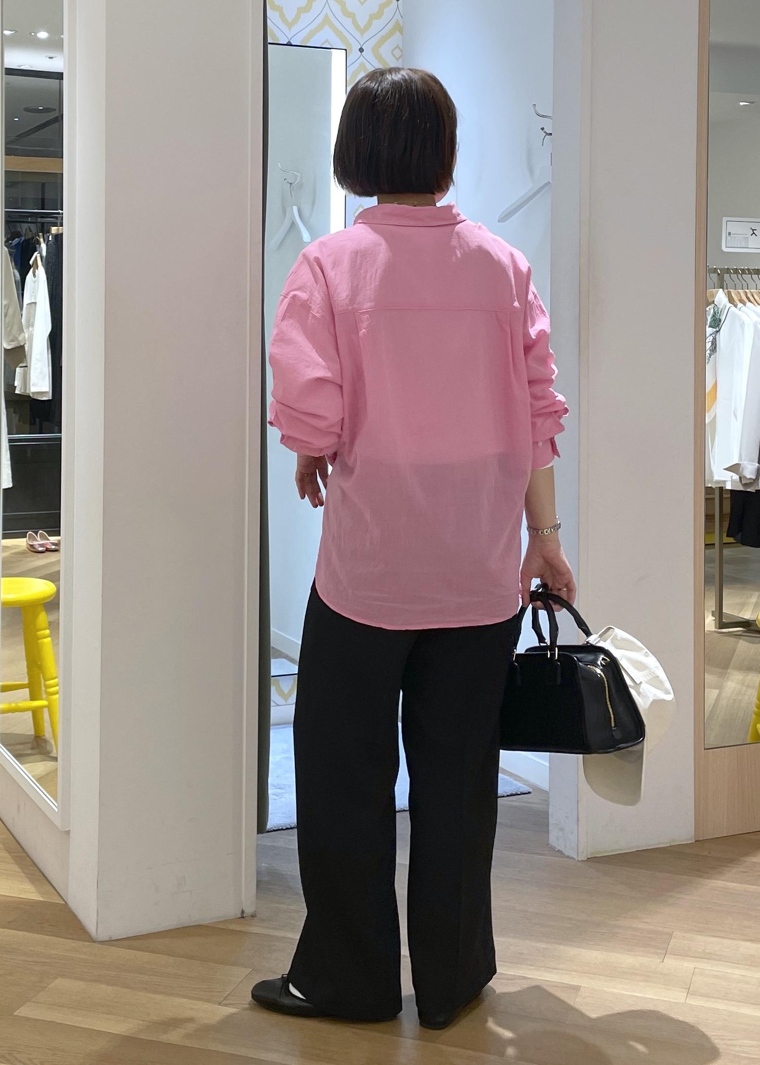 パキッとしたピンクが春の気分を高めてくれるカラーシャツに、ブラックのパンツを合わせた大人カジュアルコーデです!