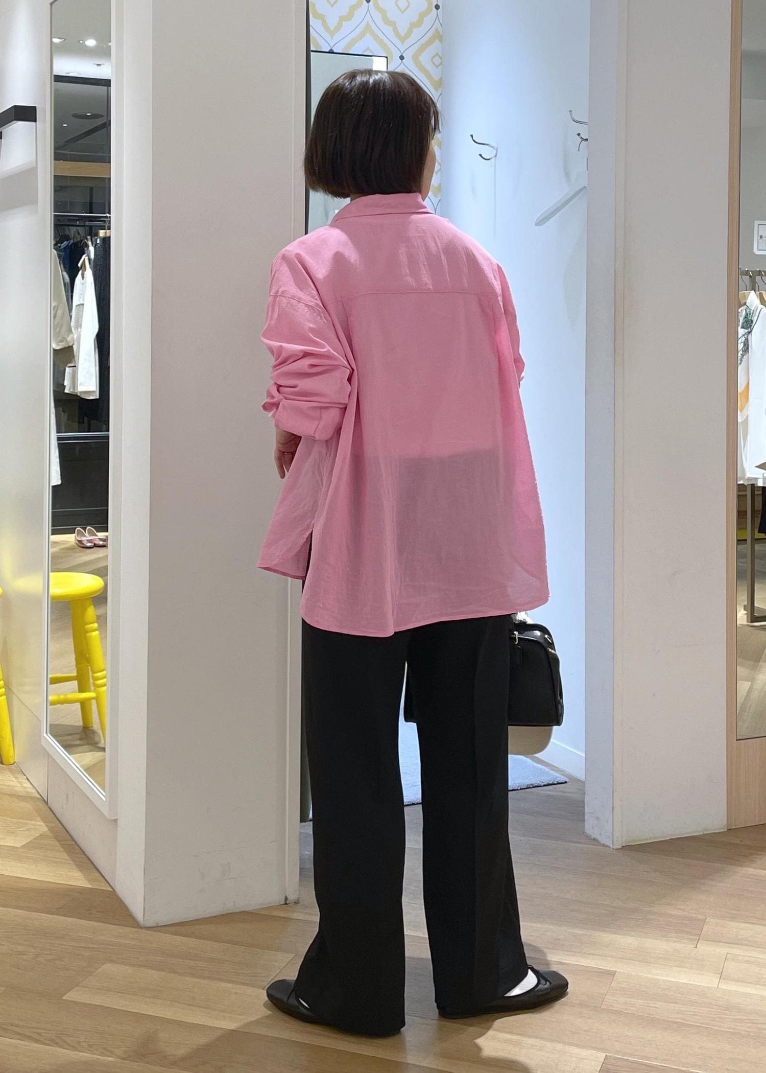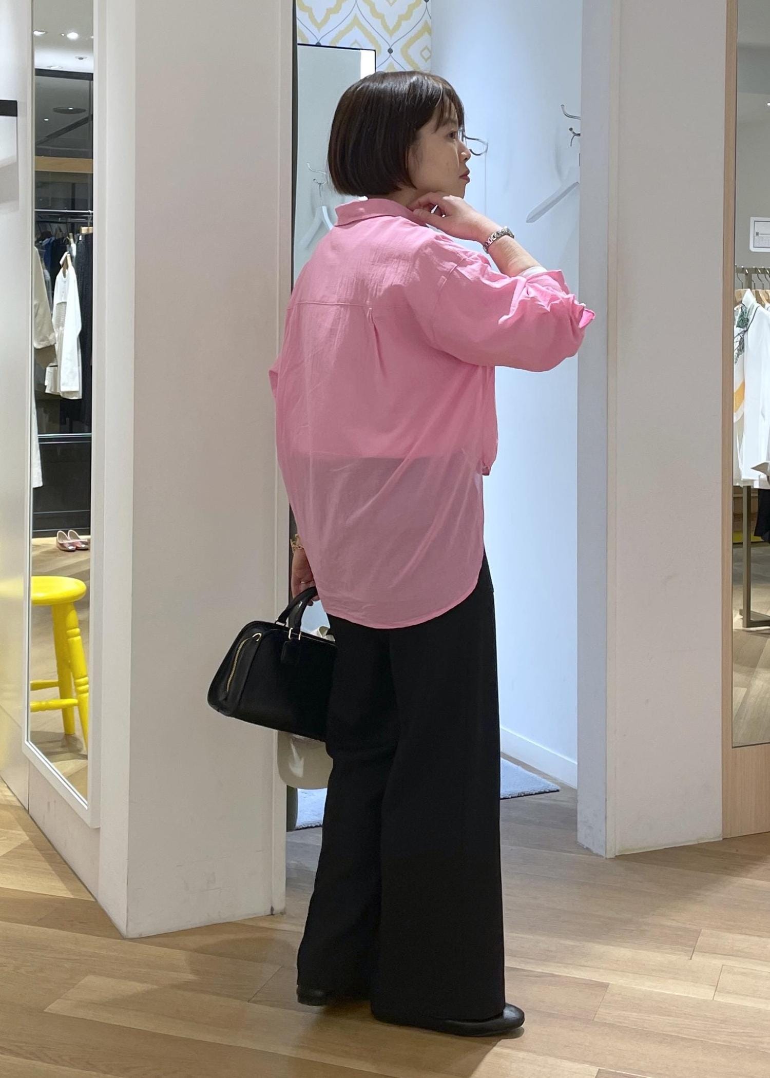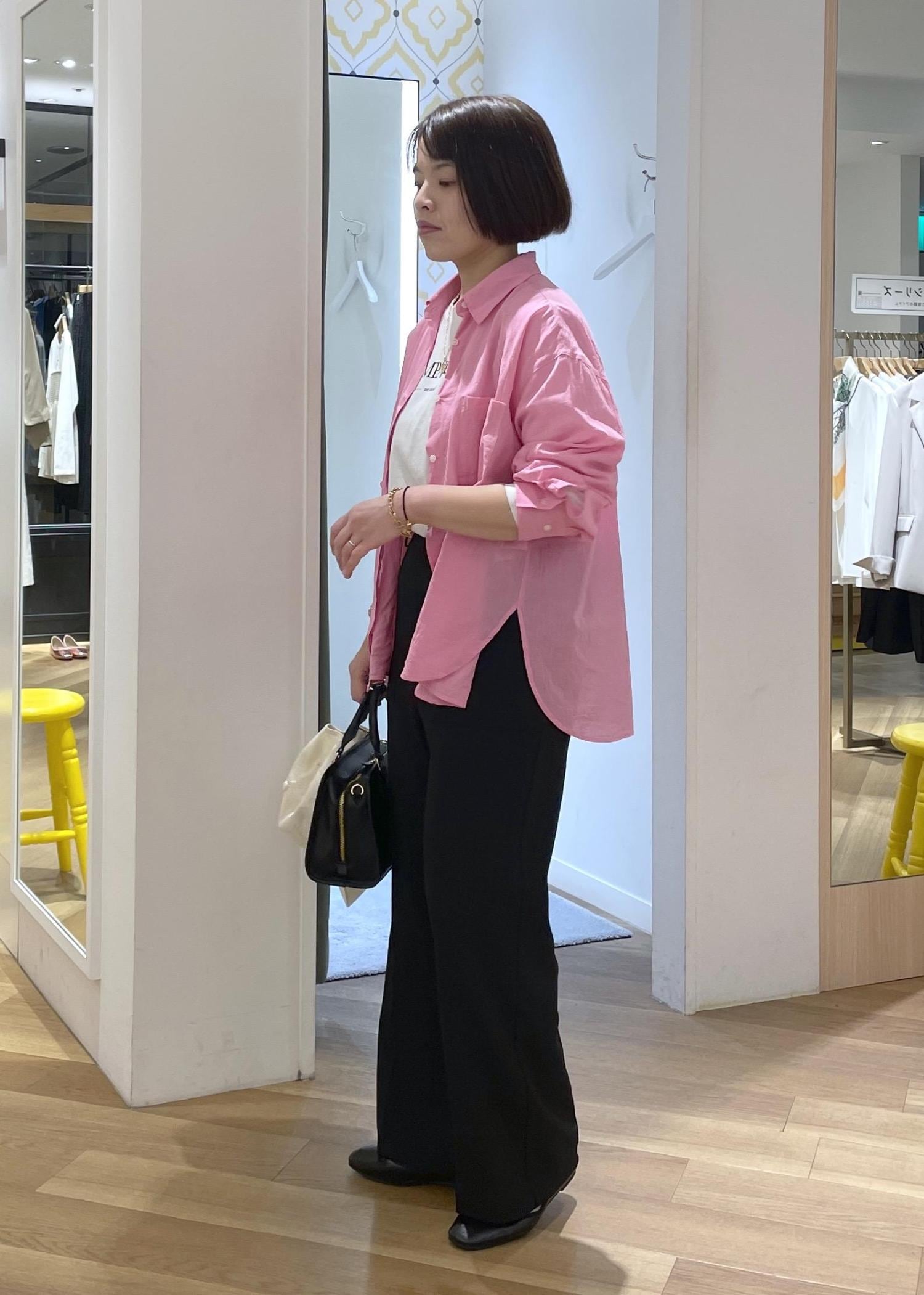 パキッとしたピンクが春の気分を高めてくれるカラーシャツに、ブラックのパンツを合わせた大人カジュアルコーデです!