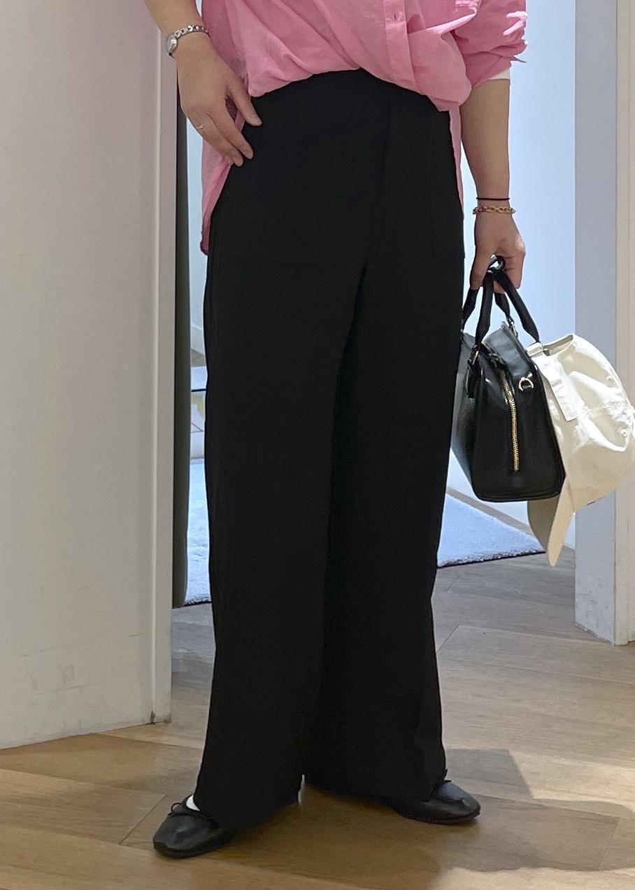 ROPÉ PICNICベイカーワイドパンツ/UVカット・防シワブラック / M¥6,490レビュー脚のラインを拾わずにすっきりとしたシルエットでお召し頂けるパンツです。ウエストはゴムなので、窮屈感無くリラックス感ある履き心地です。さらりと柔らかな生地感で履き心地も良かったです。160cmでMサイズ着用で、フラットシューズでも擦らずに合わせることができました。