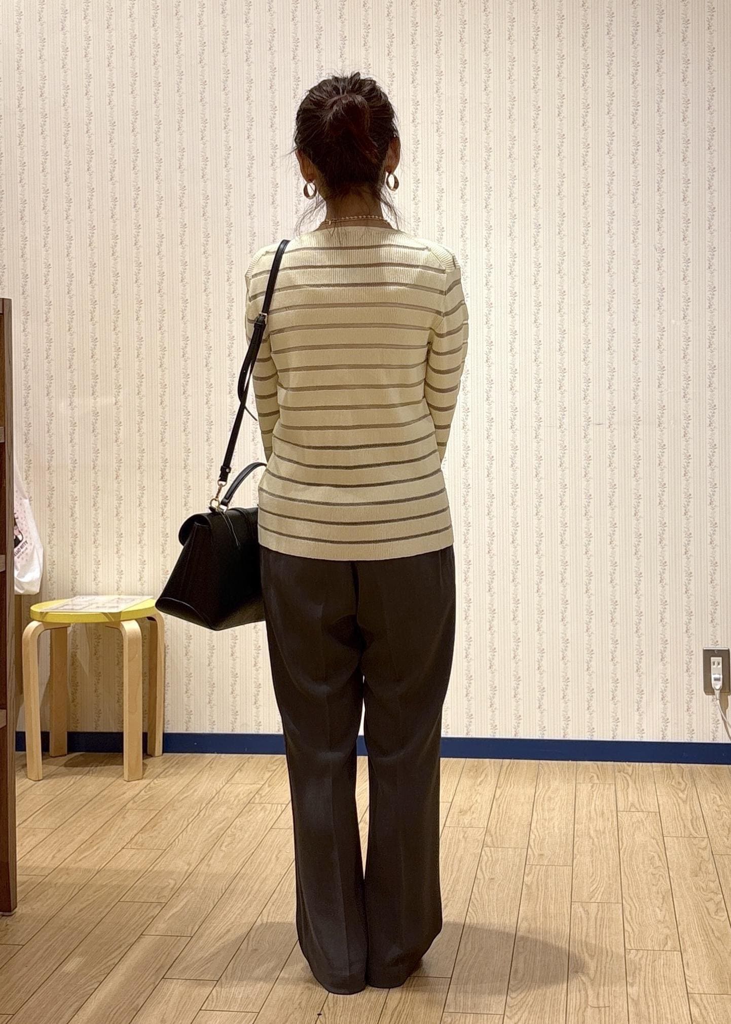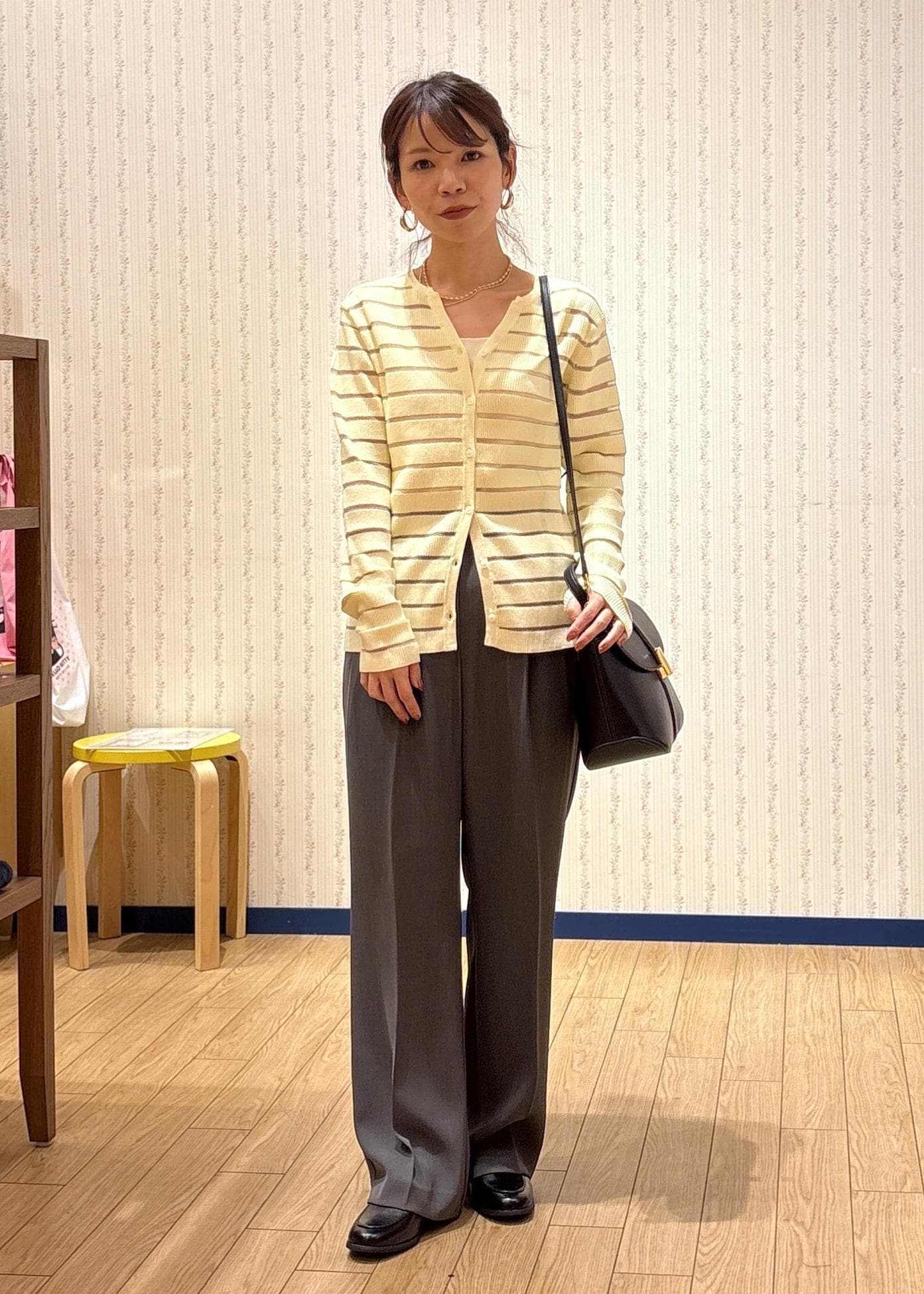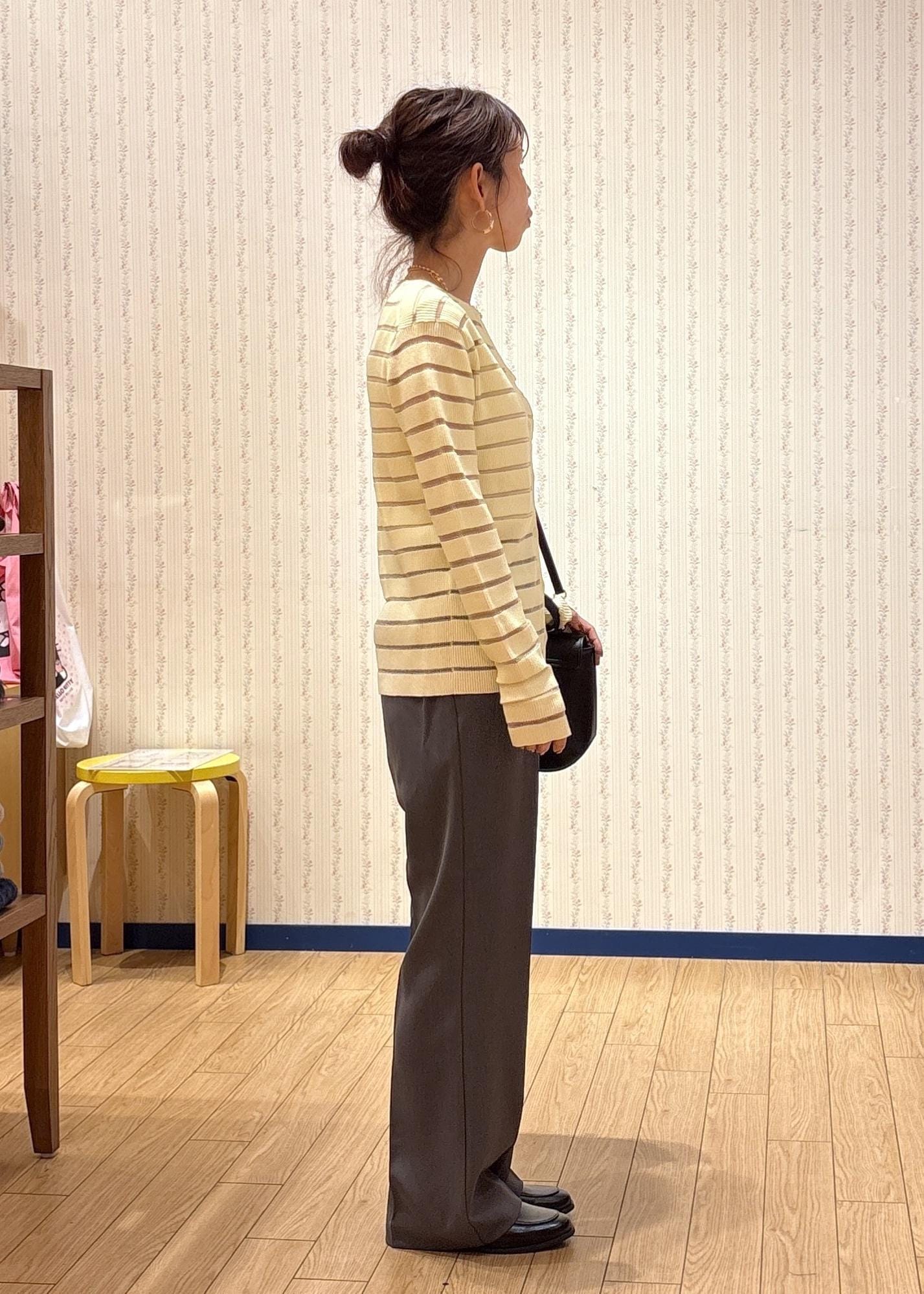 大人気のフレアパンツとボーダーカーディガンを合わせた