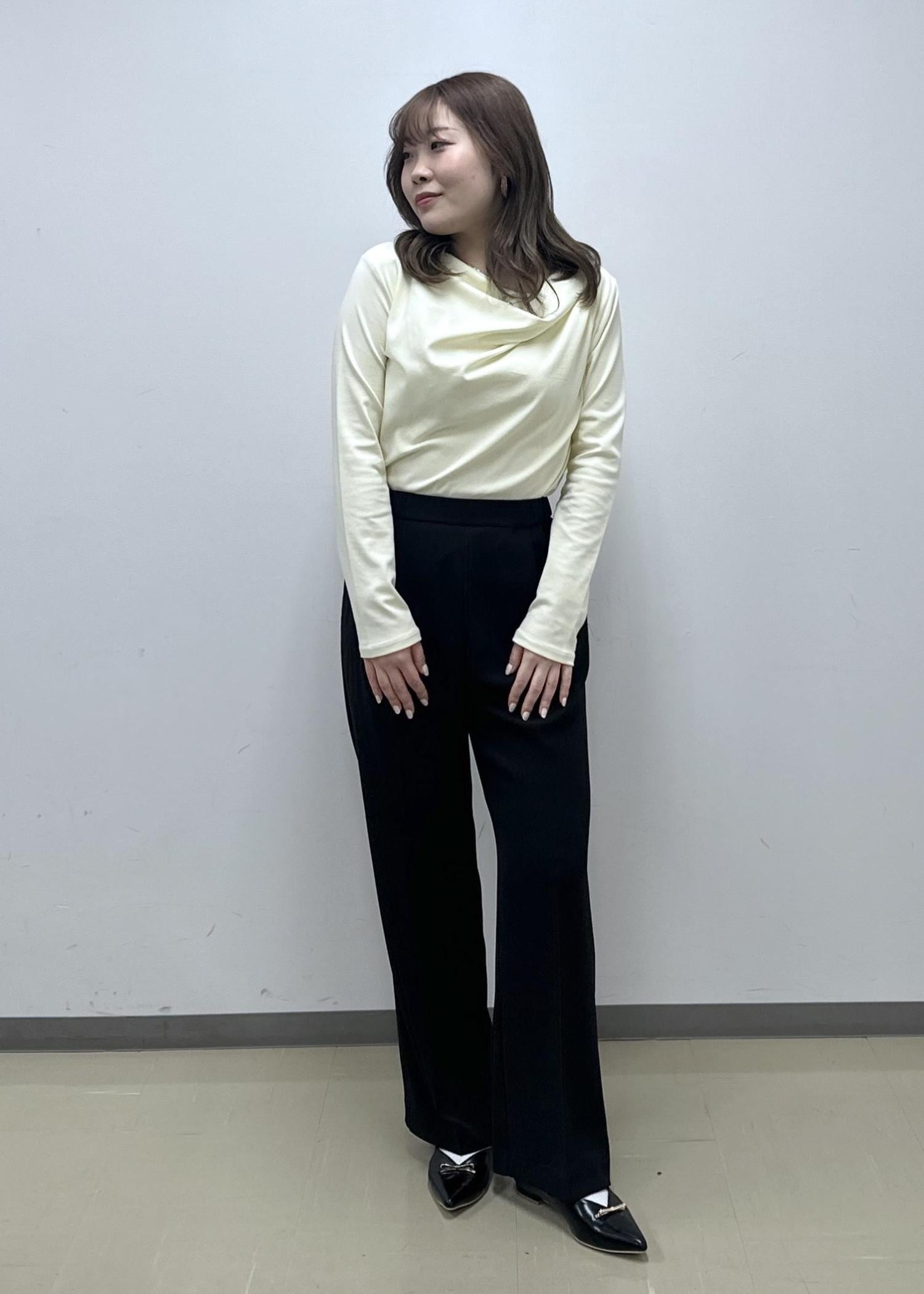 ドレープのトップスに綺麗なシルエットなフレアパンツを合わせたことで体型が綺麗に盛れるコーデになってます!