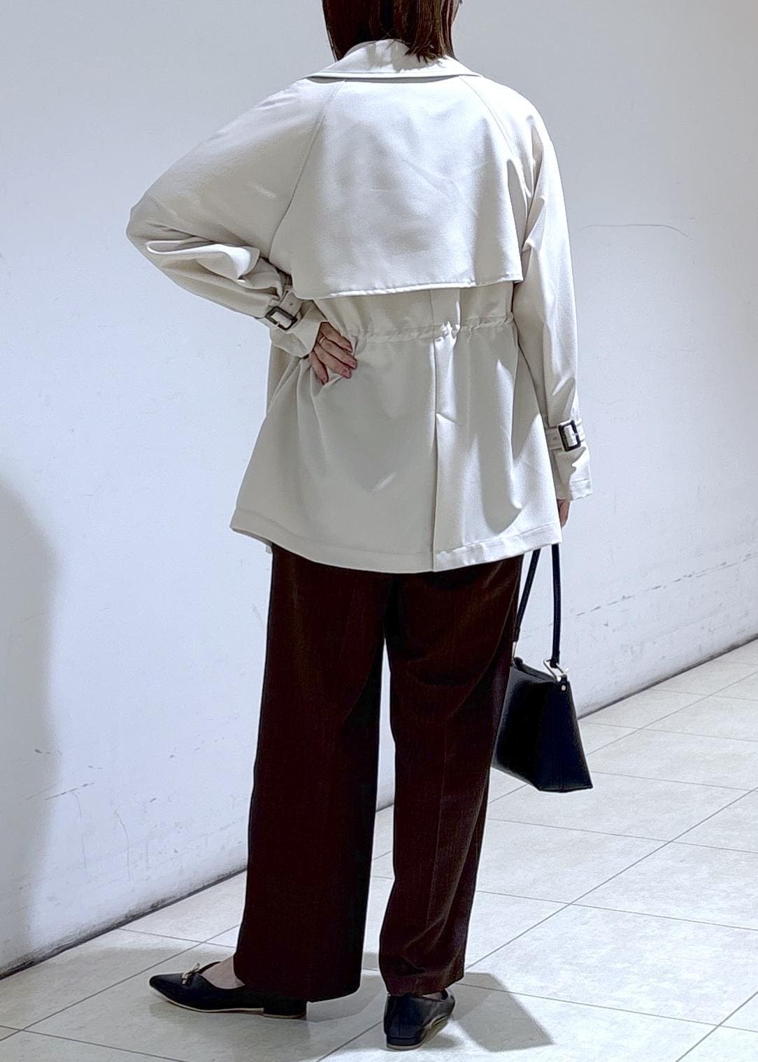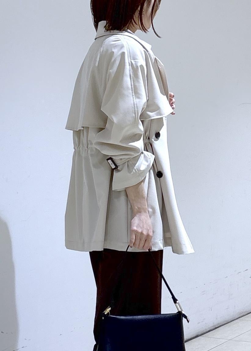 ベージュのトレンチコートを羽織って