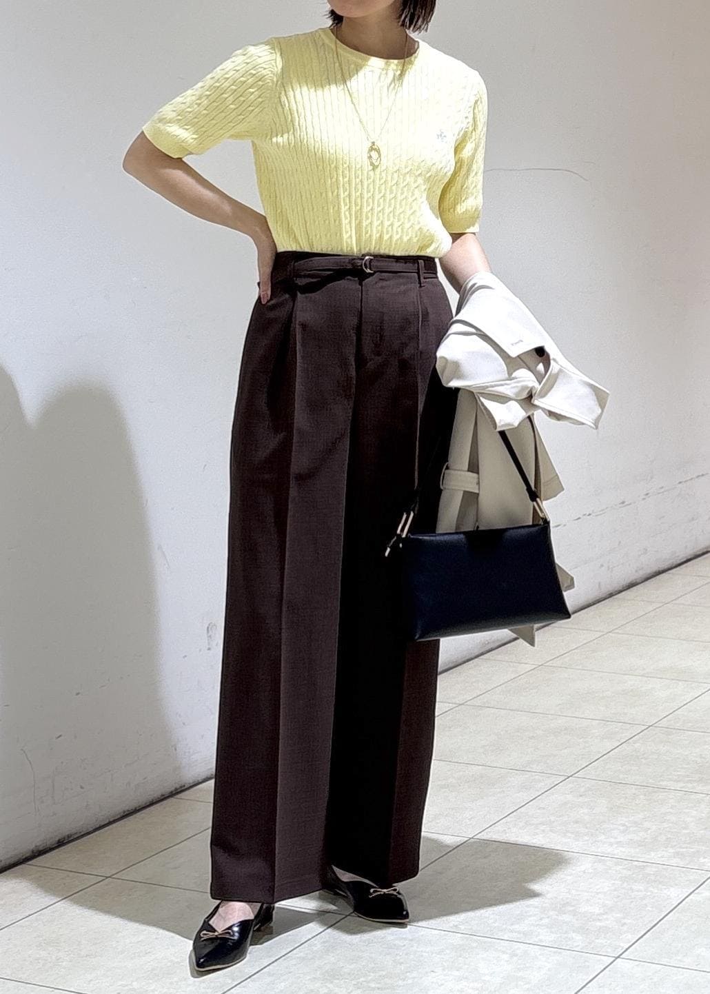ブラウンのワイドパンツを合わせた大人カジュアルコーデ。
